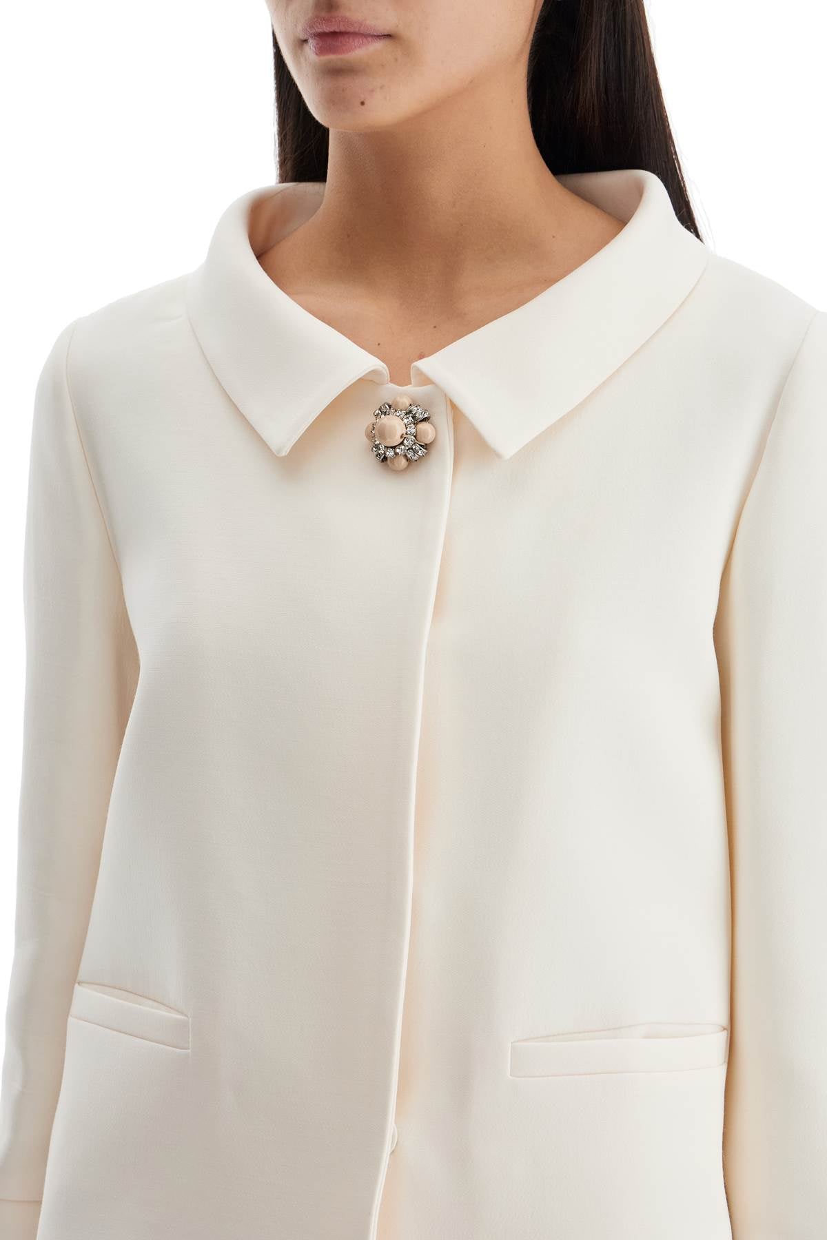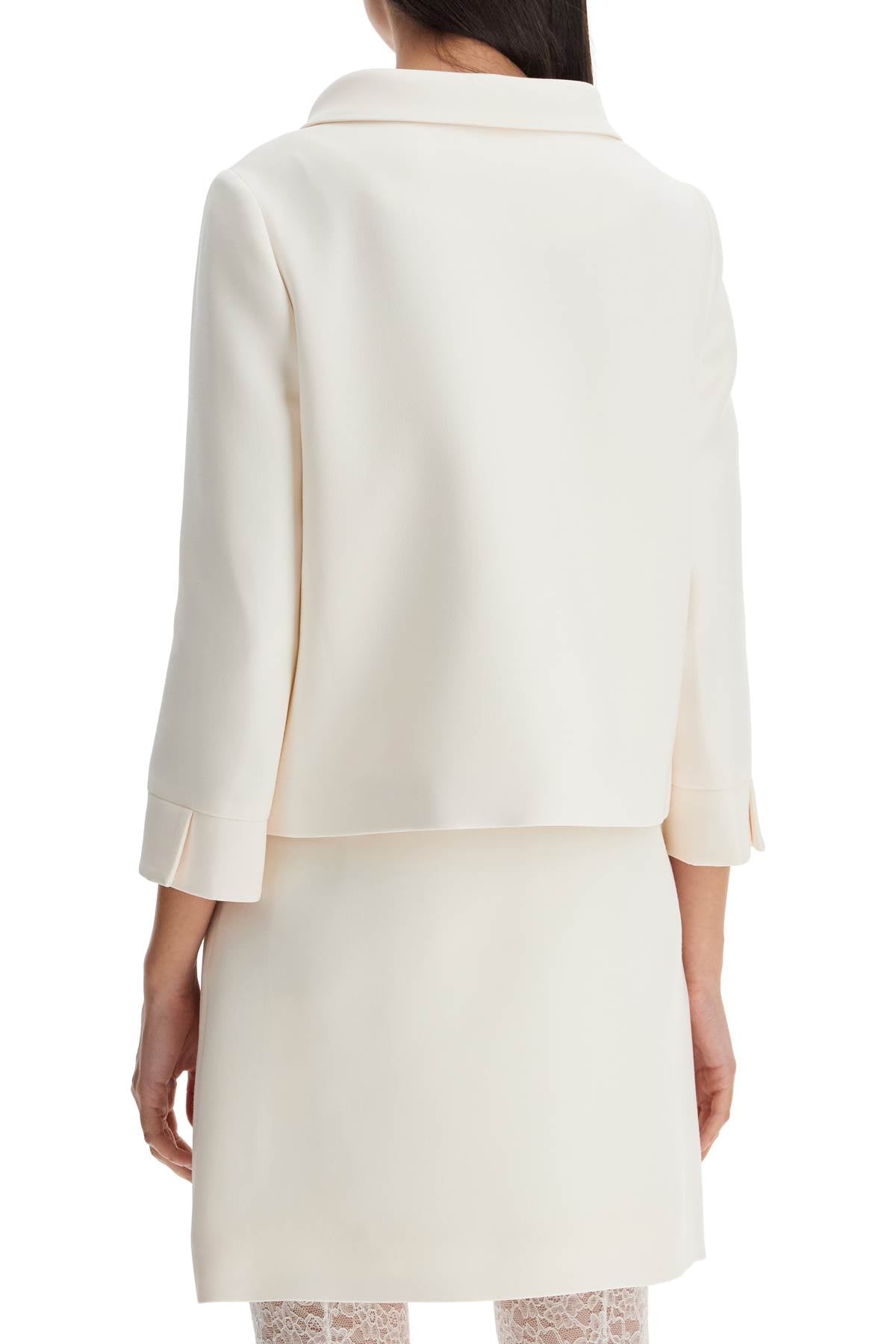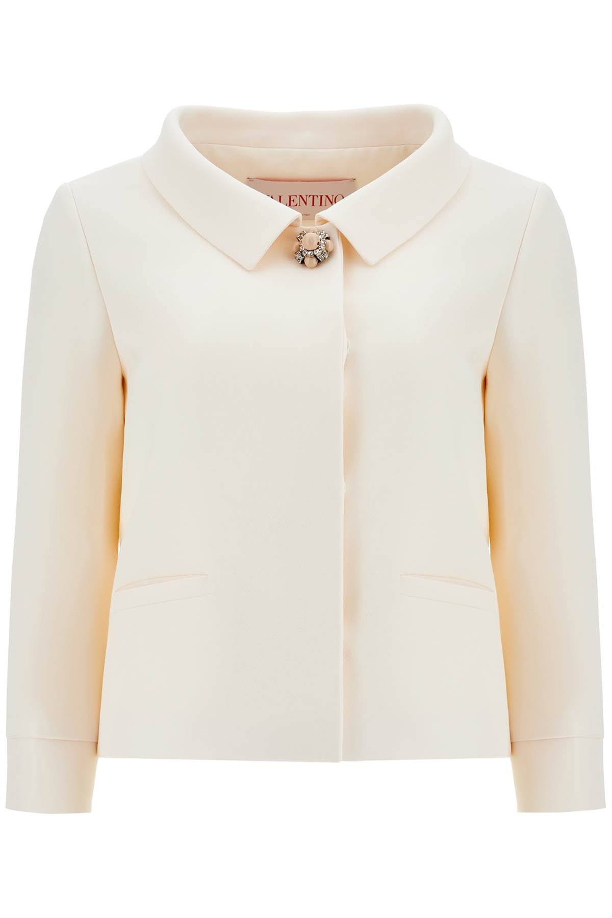 Valentino short jacket in virgin wool and silk Crepe Couture, featuring a wide neckline with collar and jewel button. It has three-quarter sleeves with slits at the bottom, hidden snap button closure, and two welt pockets. Lined interior. The model is 177 cm tall and wears size IT 40.