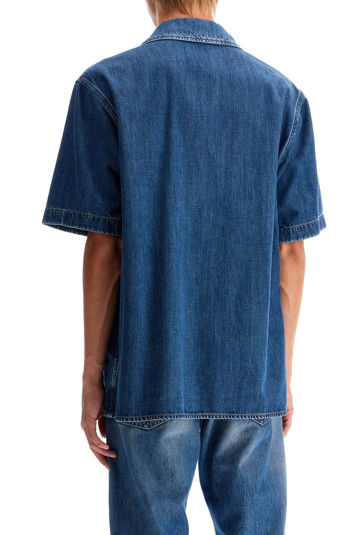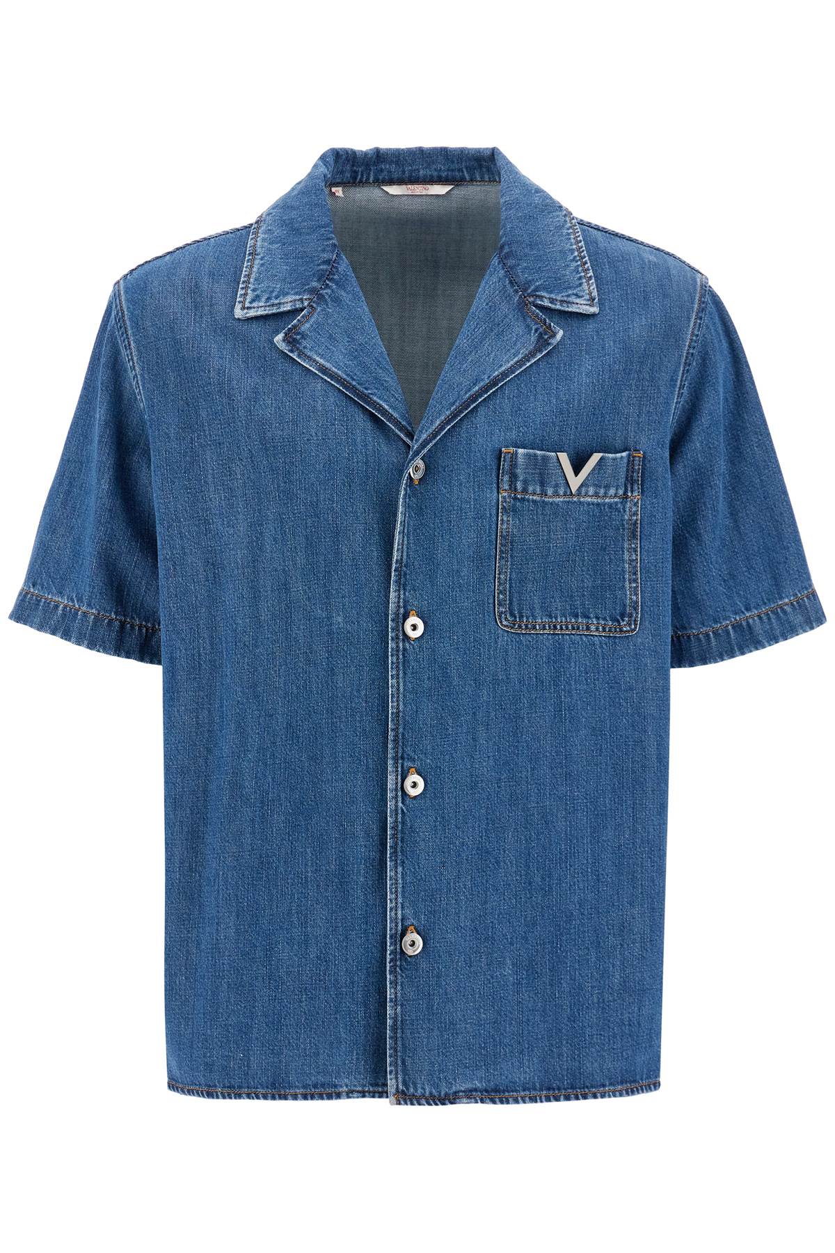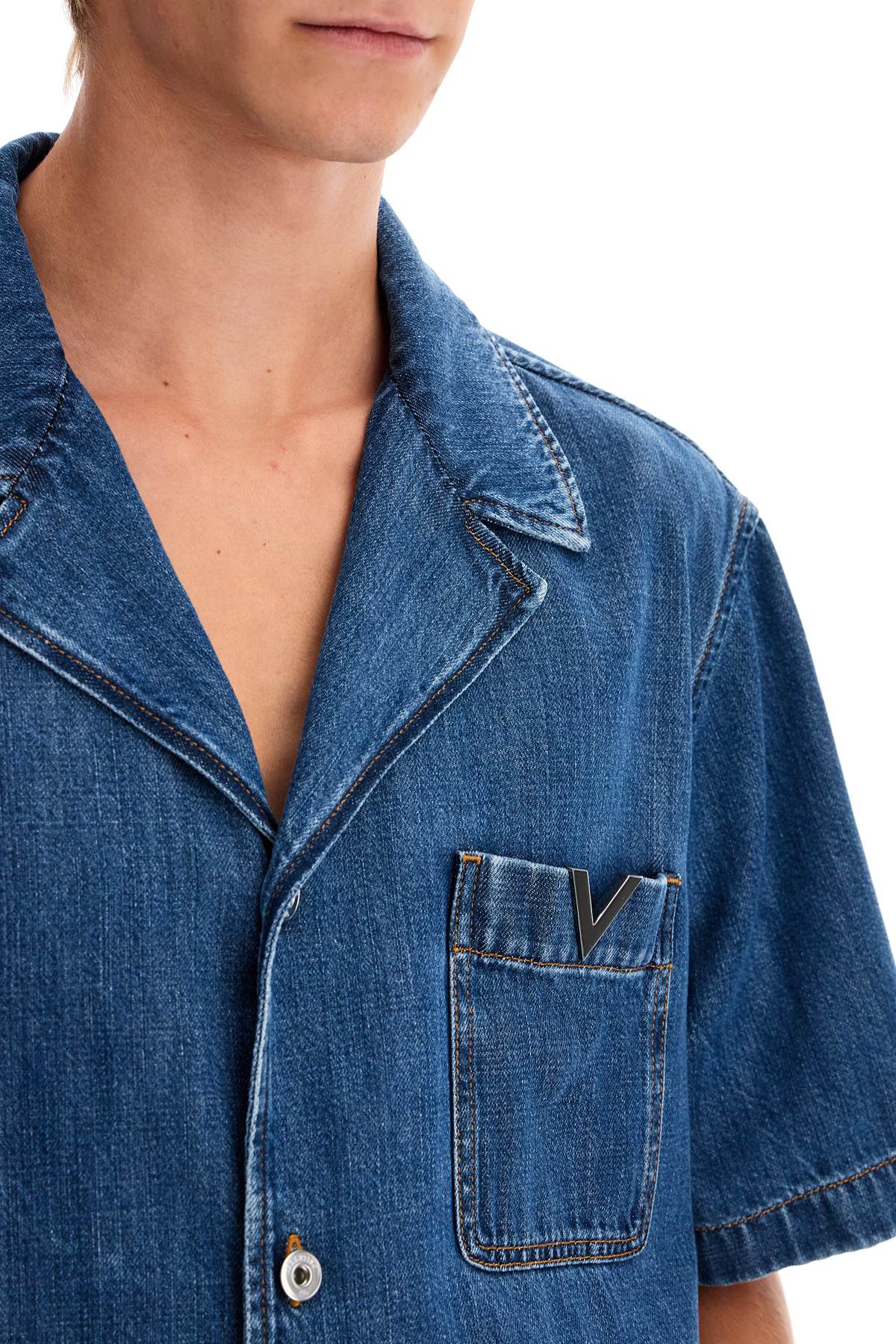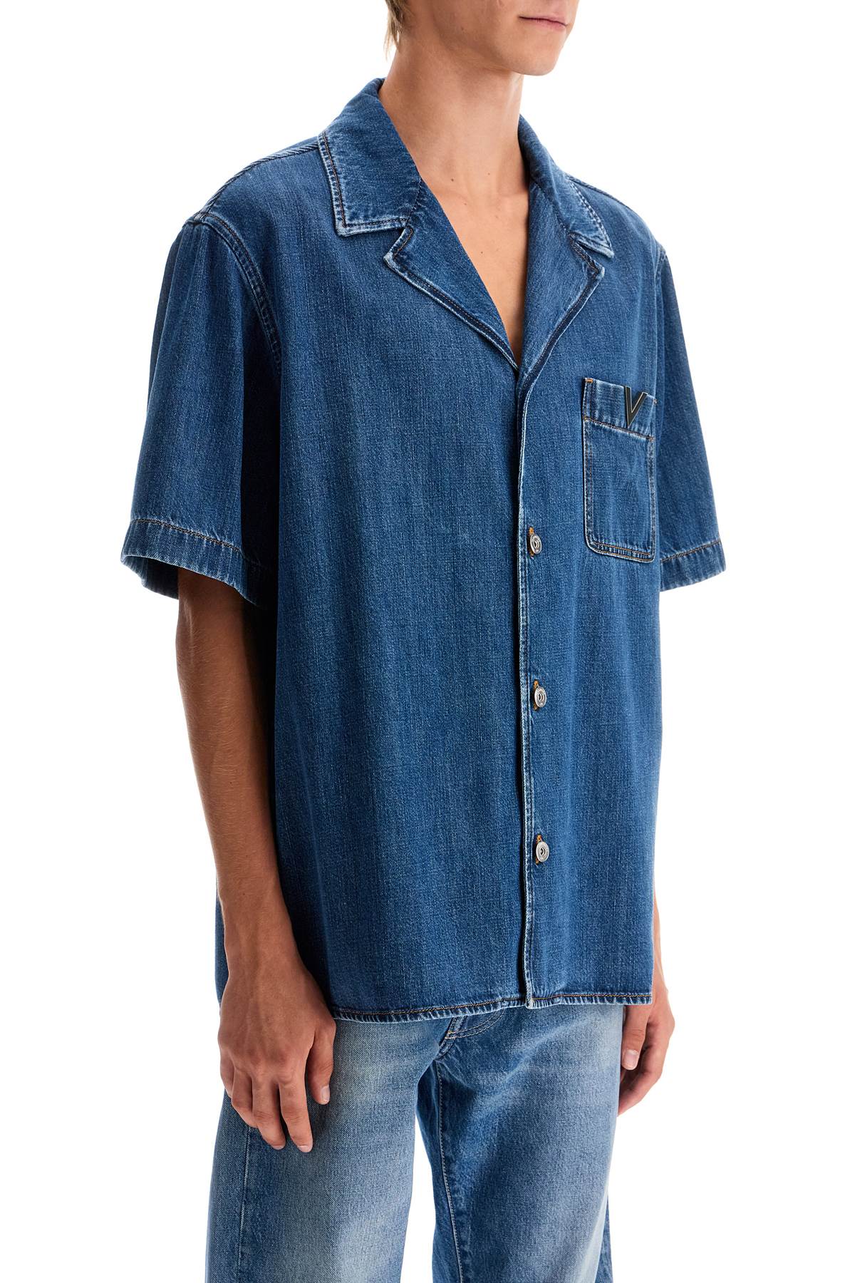 The Valentino bowling shirt is made of a cotton blend denim, featuring a metallic V detail on the front pocket. It has short sleeves, a notched collar, button closure, and a boxy fit. The model is 187 cm tall and wears an IT size 48.