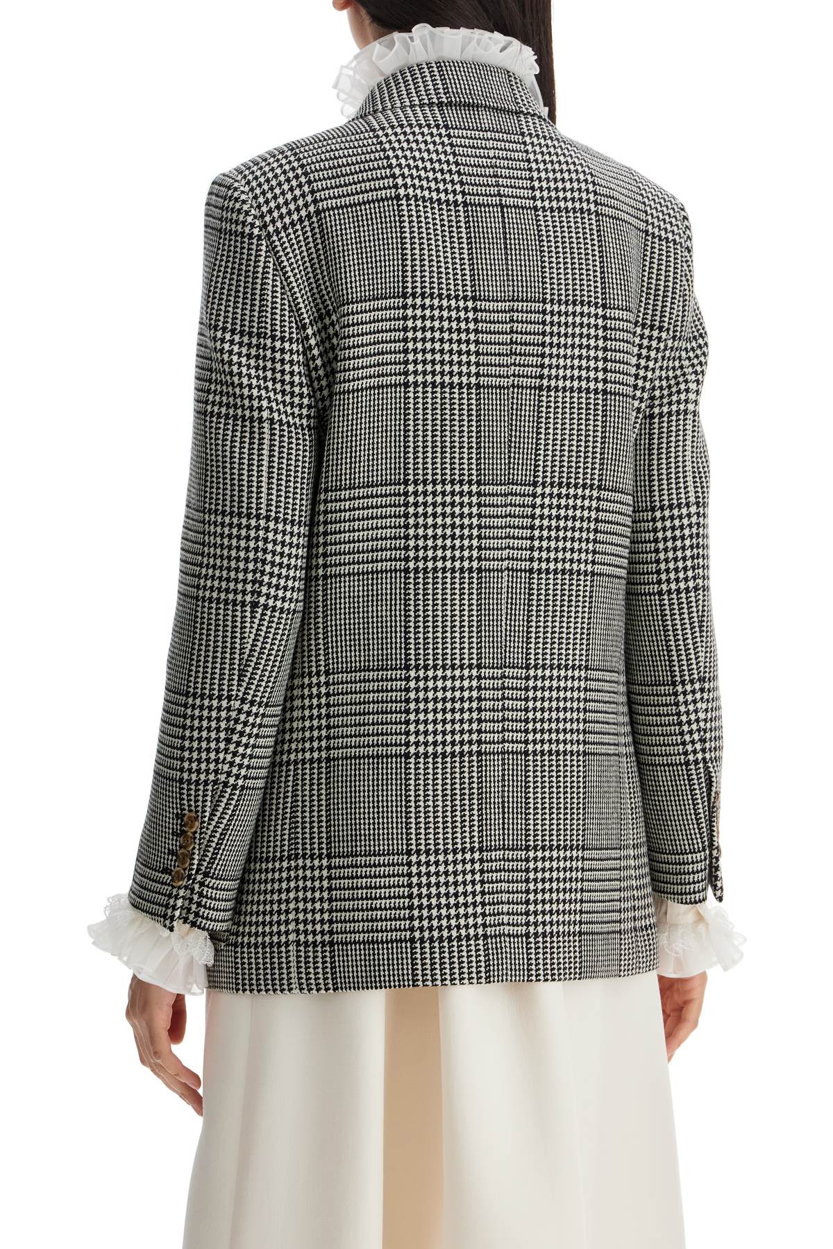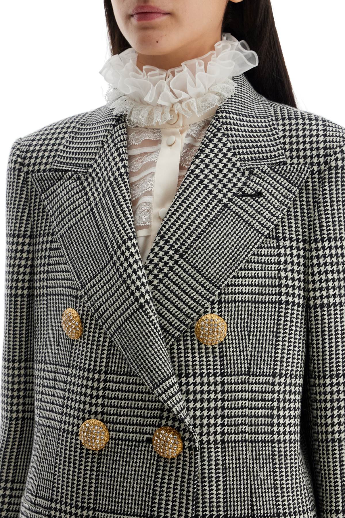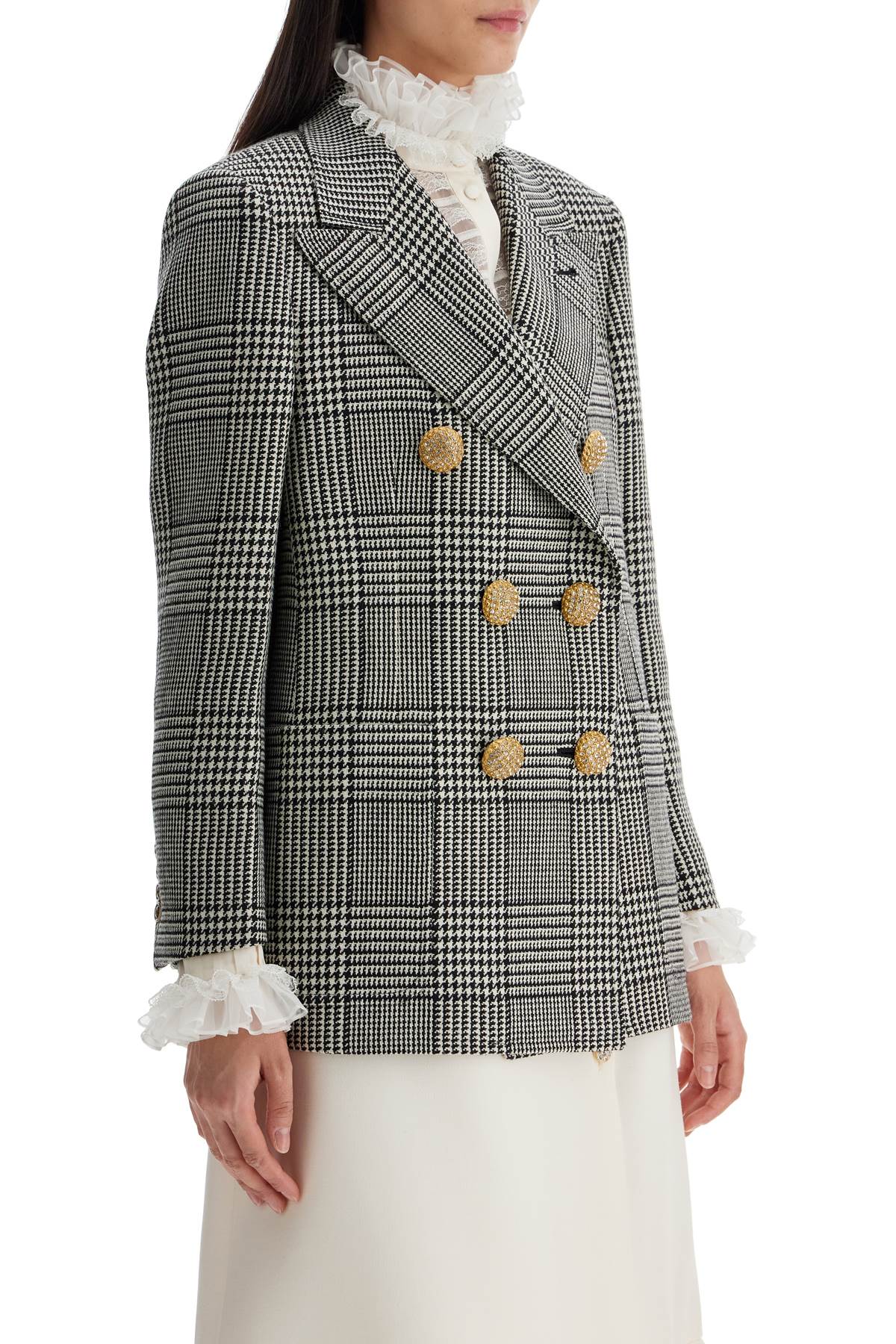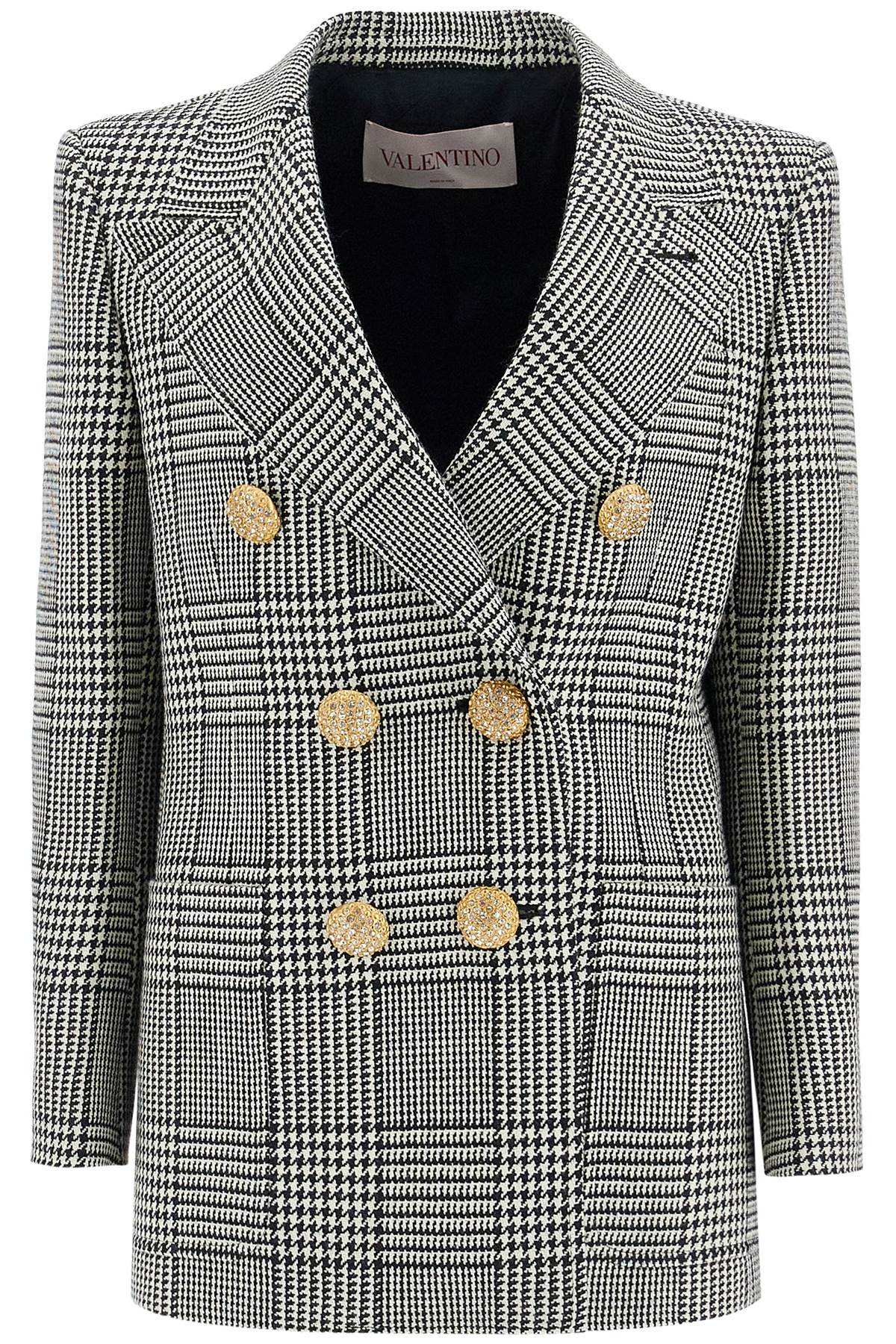 Valentino's double-breasted blazer in pure virgin wool pied-de-poule is enriched by six large jewel buttons. It features a comfortable slightly tapered silhouette, complete with wide peak lapels, two patch pockets on the sides and a chest pocket. The lining is logoed jacquard made of silk blend. The model is 177 cm tall and wears size IT 40.