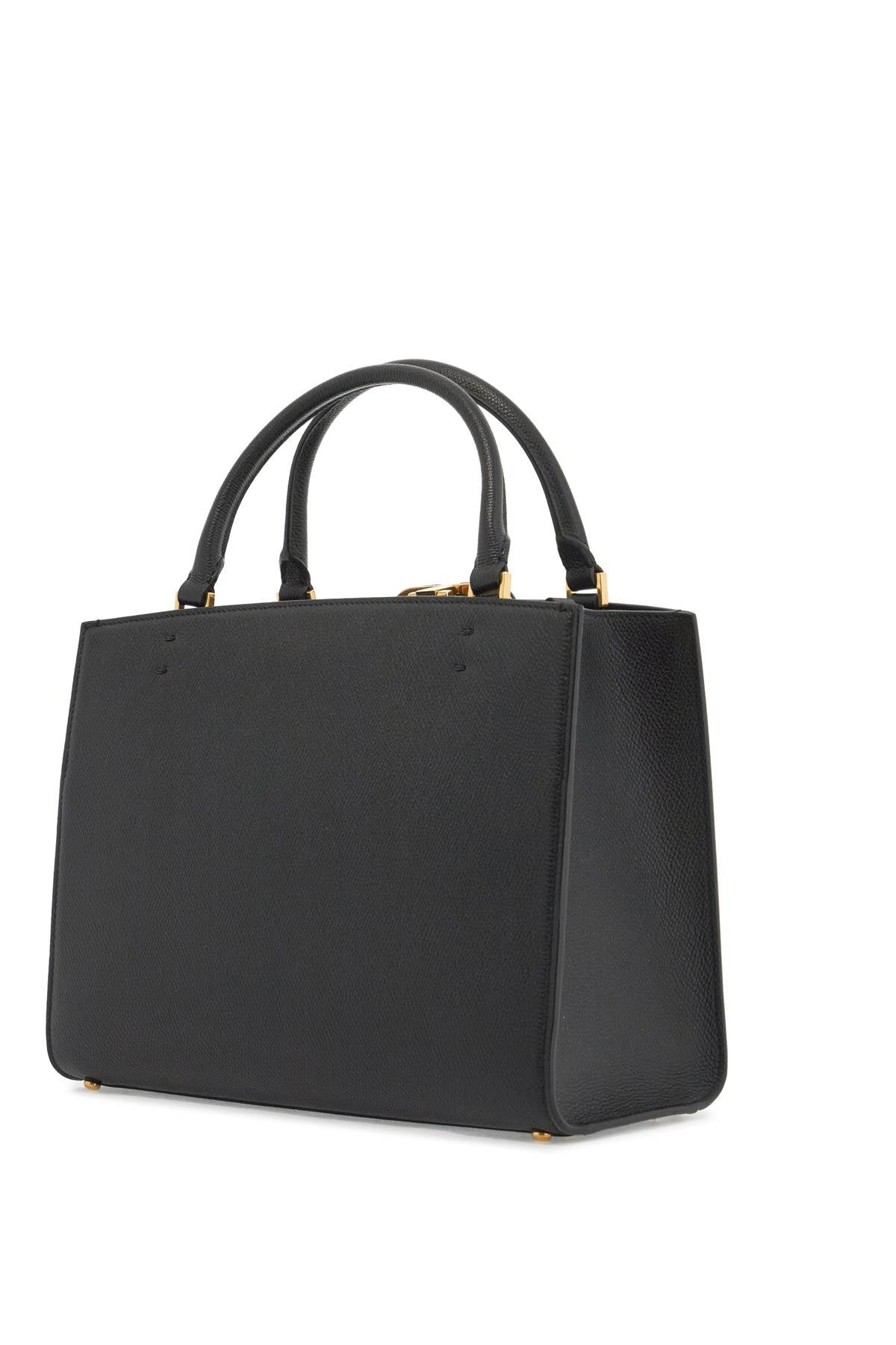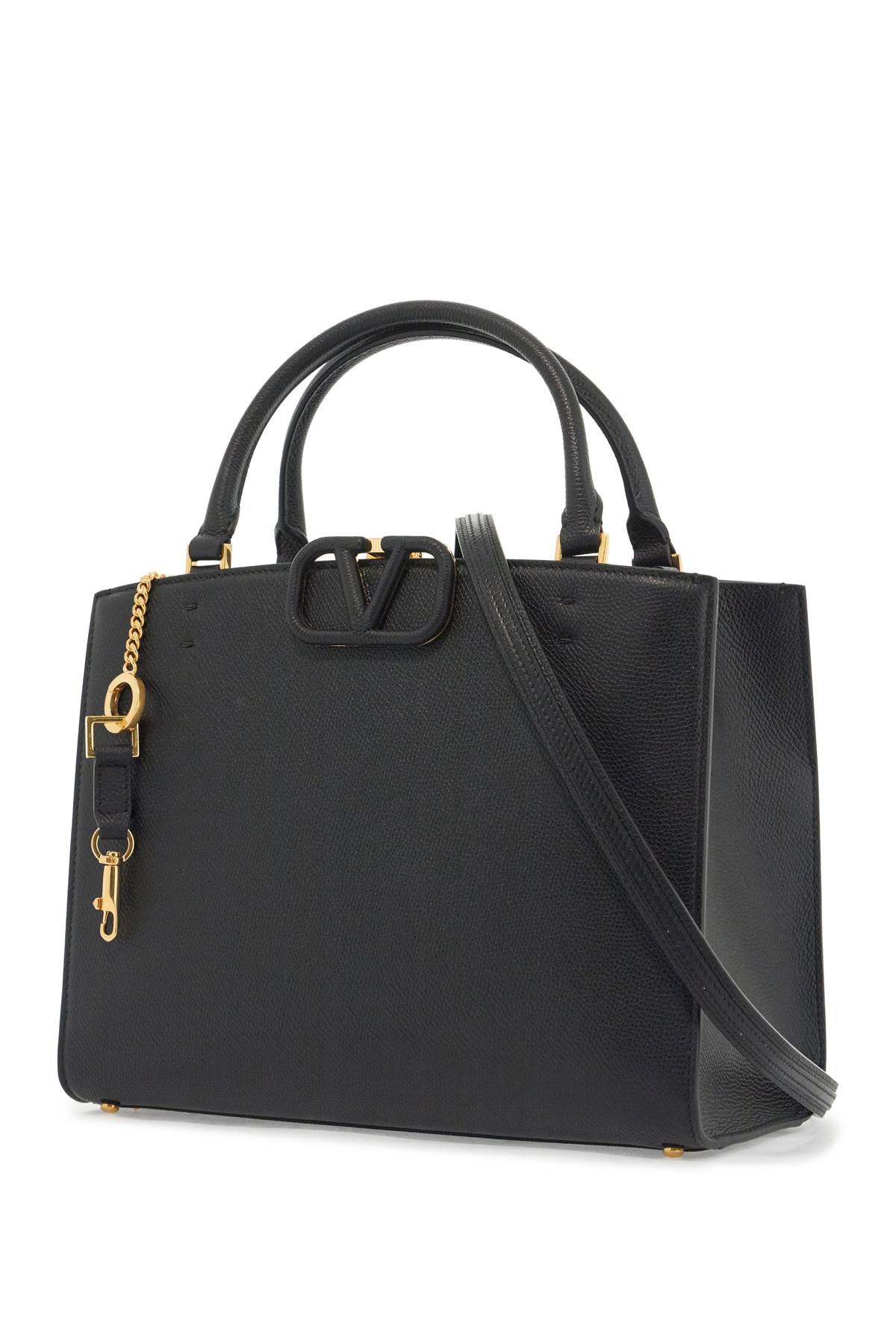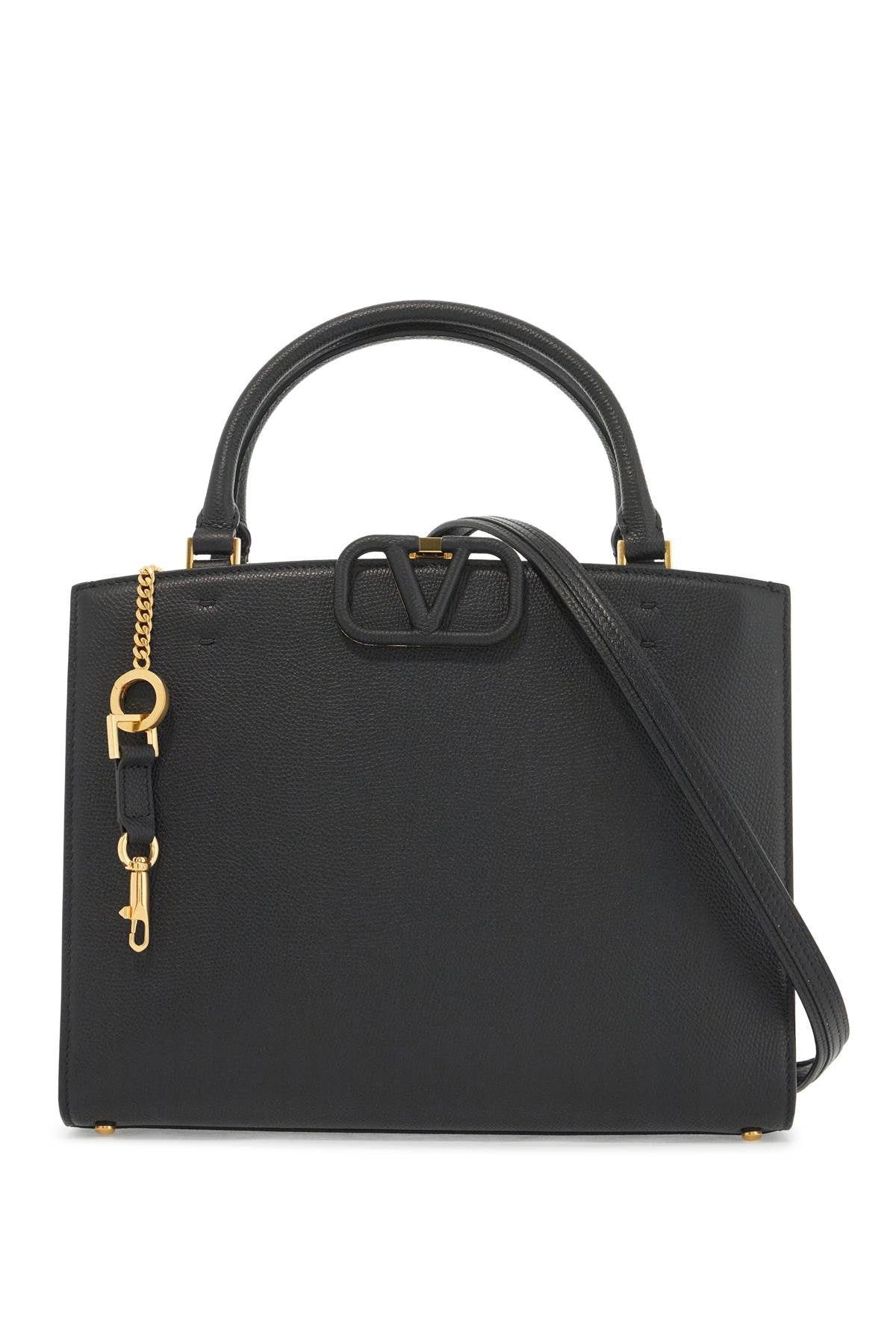 Valentino Garavani double handle bag made of hammered leather with coated Signature Vlogo detail. It features a magnetic closure, smooth leather interior with a zip pocket, an additional front slit pocket and protective feet at the base. Equipped with a chain shoulder strap with leather insert. Metallic accessories in gold finish. Size and Fit - Bag Length = 29 cm, Bag Height = 22 cm,