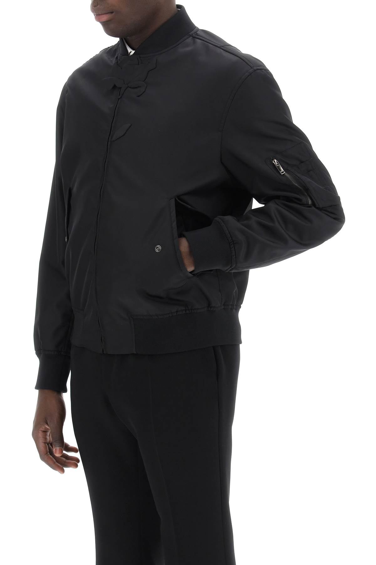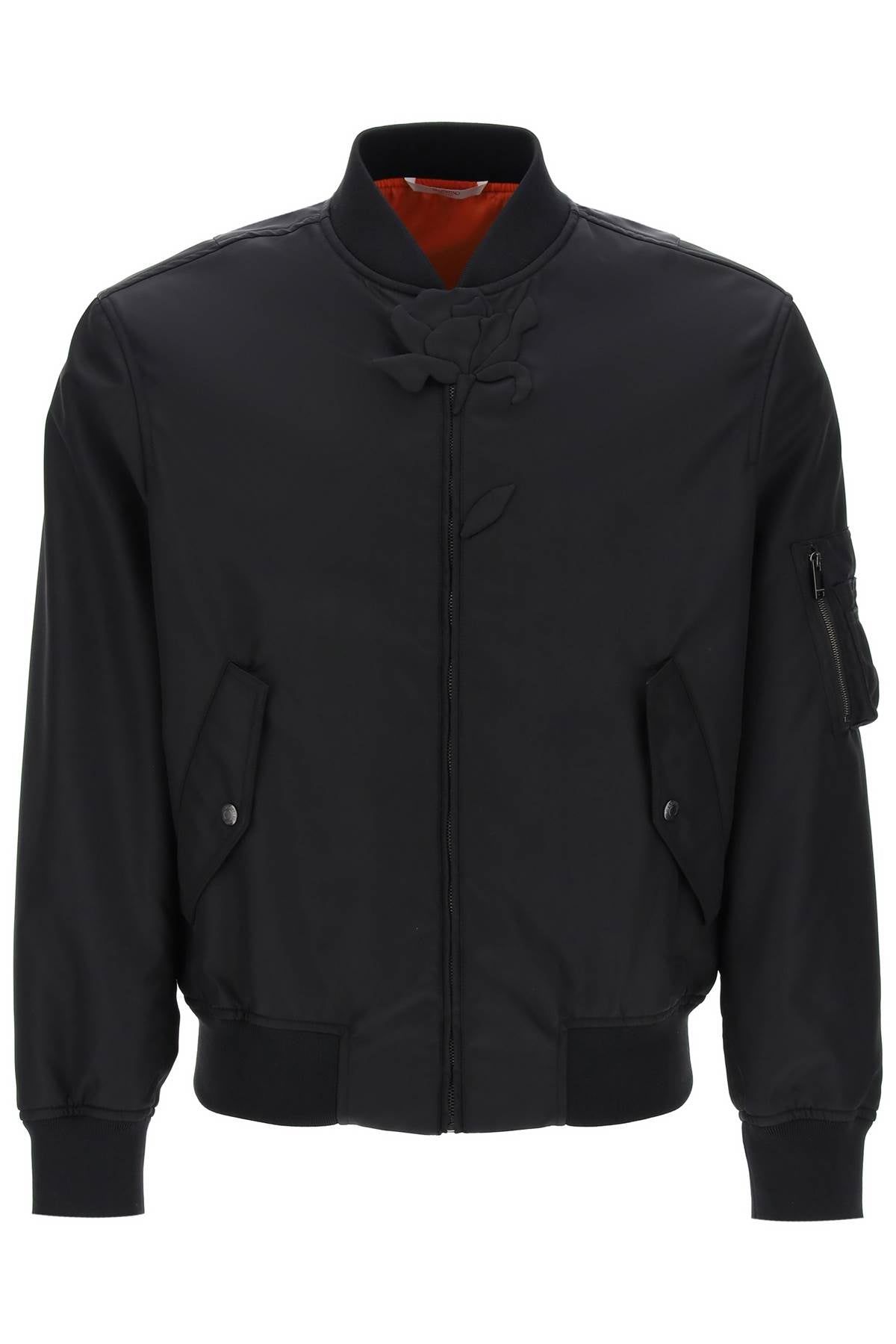The classic design of this Valentino bomber is enhanced by the embroidered floral detail on the closure. Made of nylon with ribbed finishes, the garment features a zip closure, side pockets with flaps, and a pocket on the sleeve. The contrast lining interior has an additional pocket. Light polyester padding. Regular fit. The model is 187 cm tall and wears size IT 48.