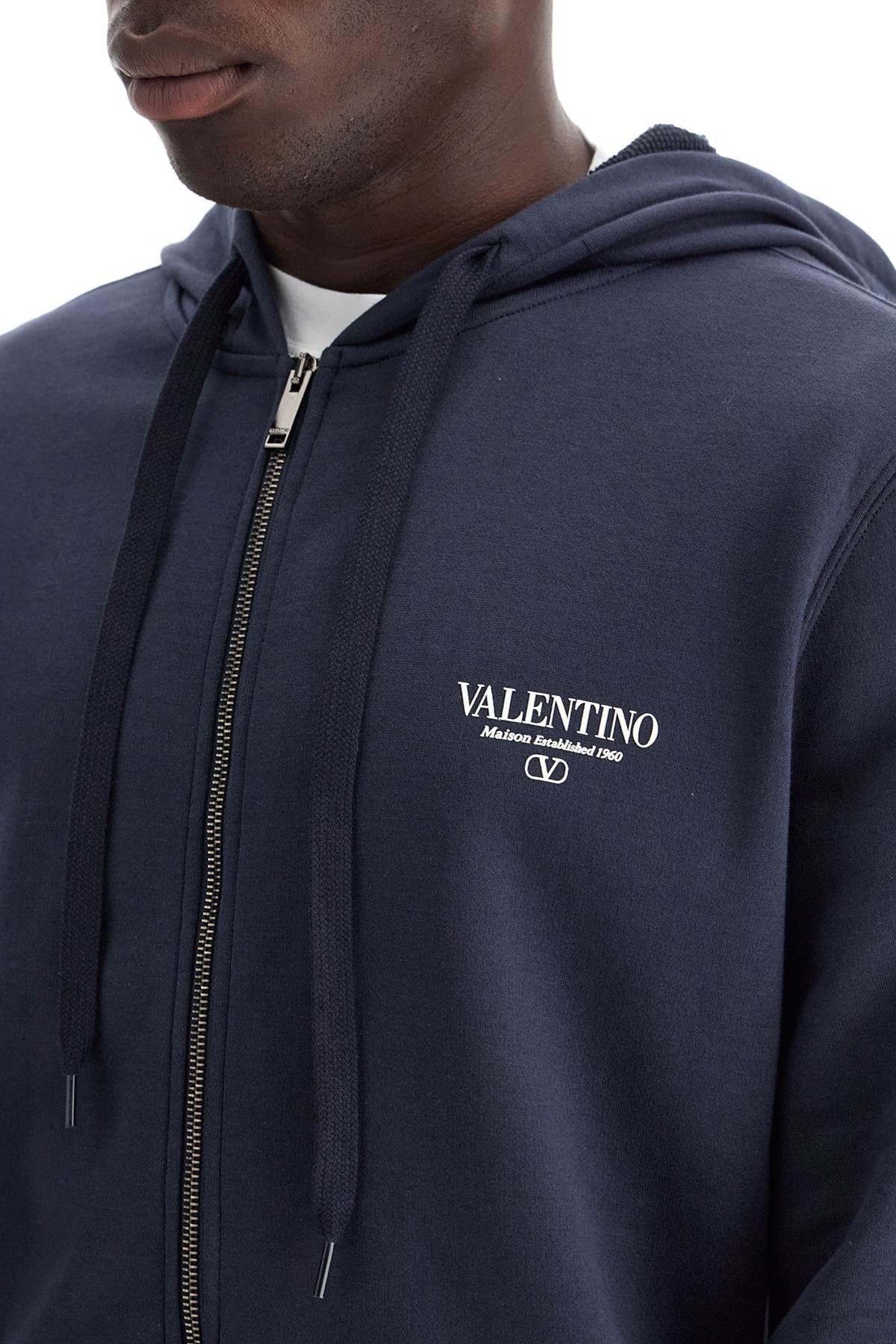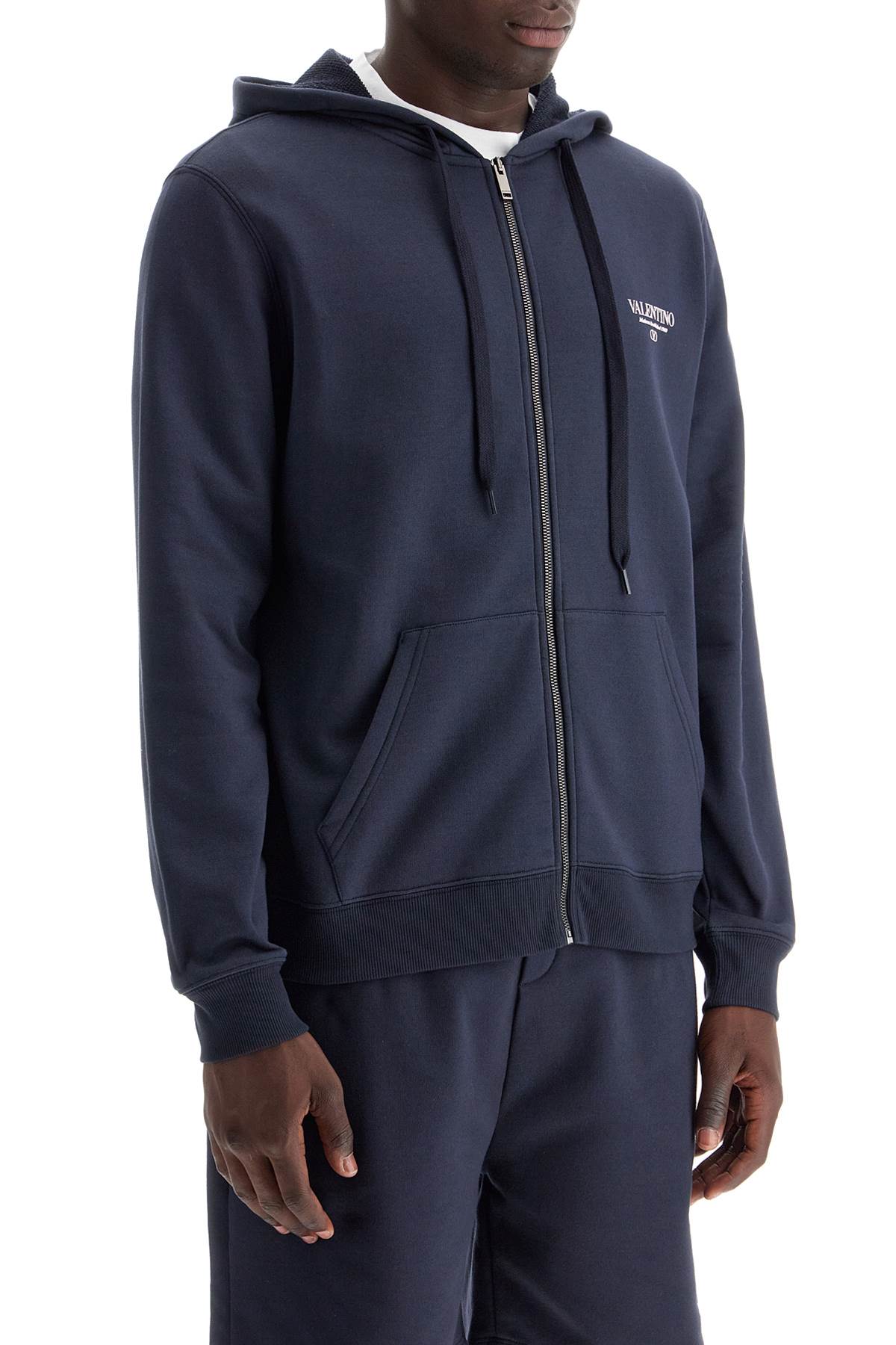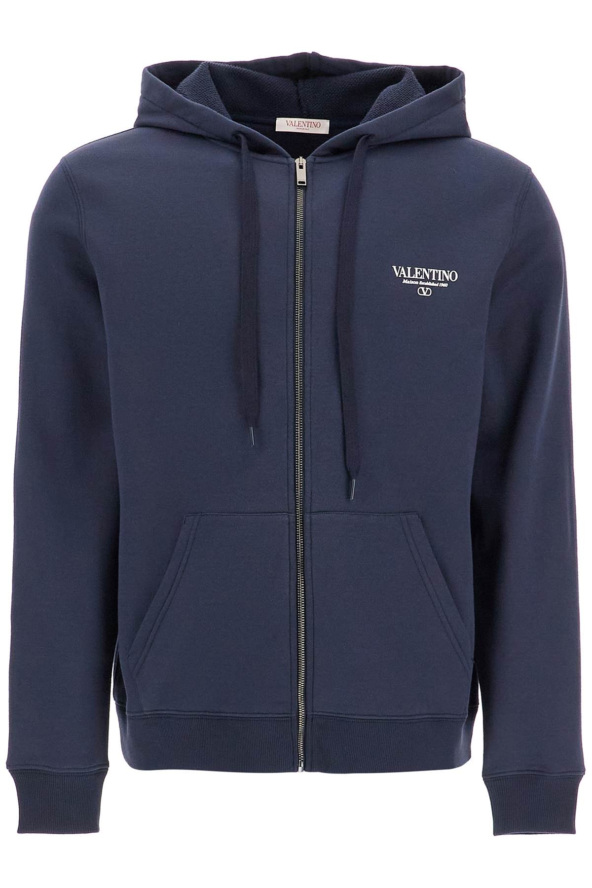 Valentino sweatshirt in brushed cotton jersey with a hood featuring drawstrings, zip closure, kangaroo pocket, ribbed edges and finished with a rubberized lettering logo on the chest. Comfortable fit. The model is 187 cm tall and wears size L.