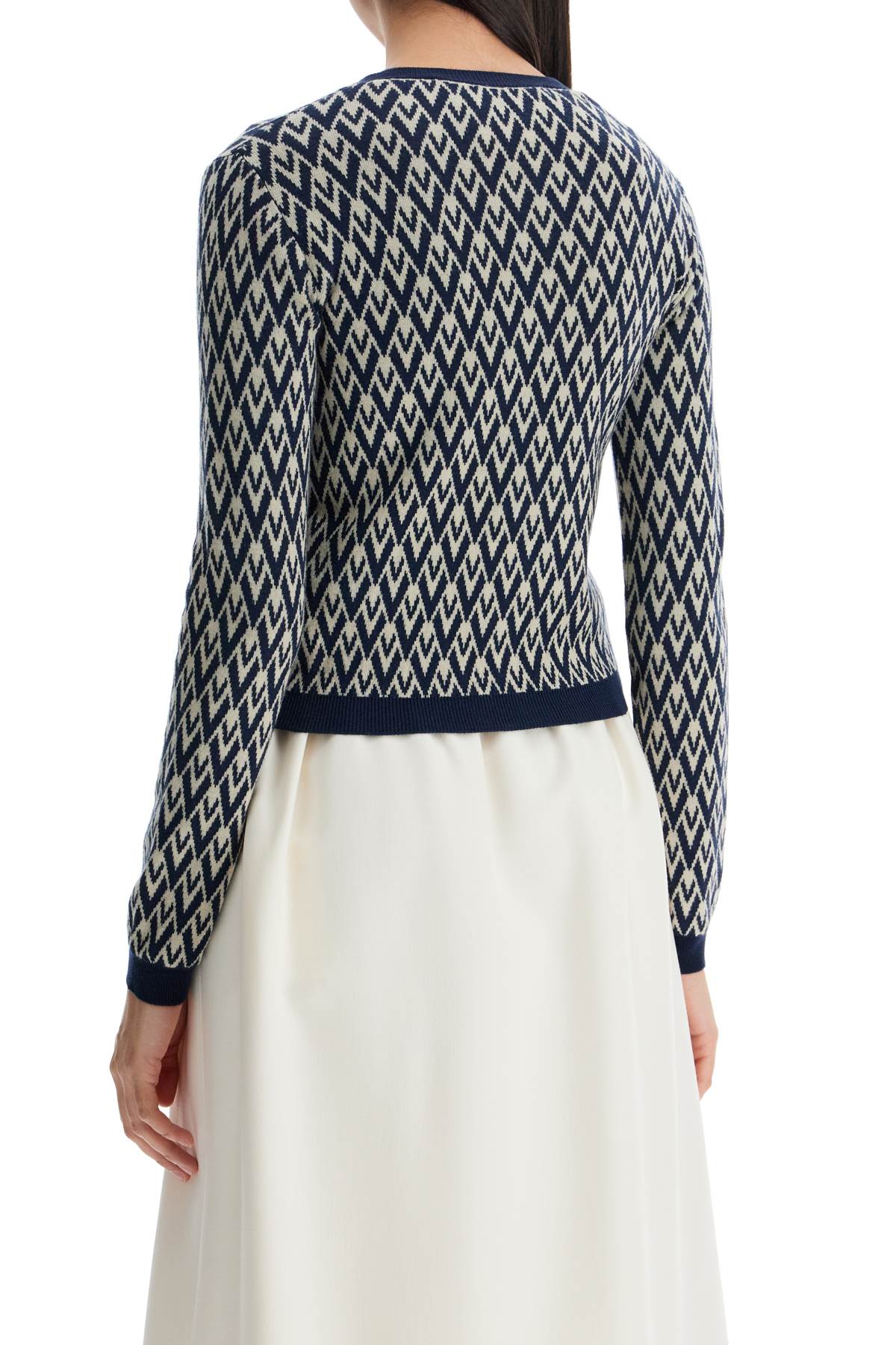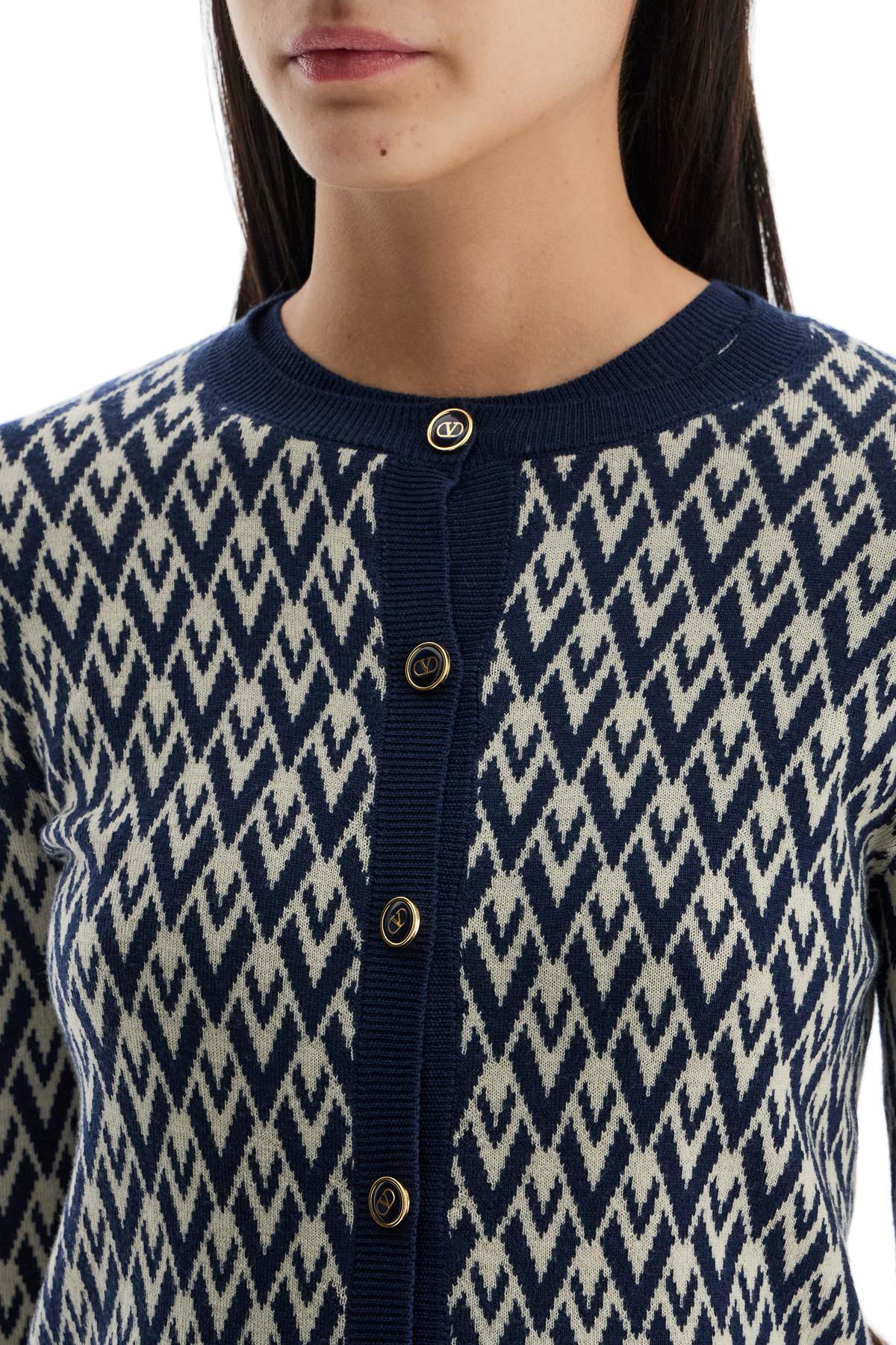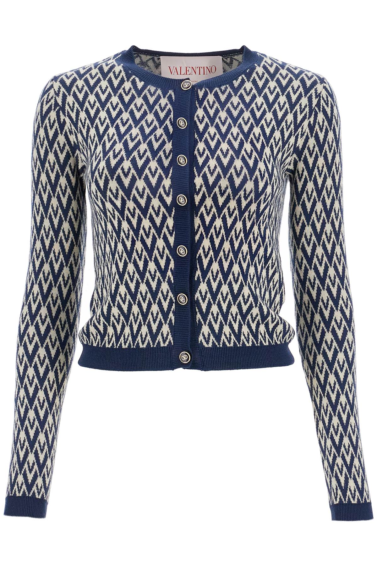 Valentino cardigan made of virgin wool jacquard knit with Toute La V pattern. It features a round neckline, ribbed edges and contrasting finishes, as well as branded buttons. Regular fit. The model is 177 cm tall and wears size XS.