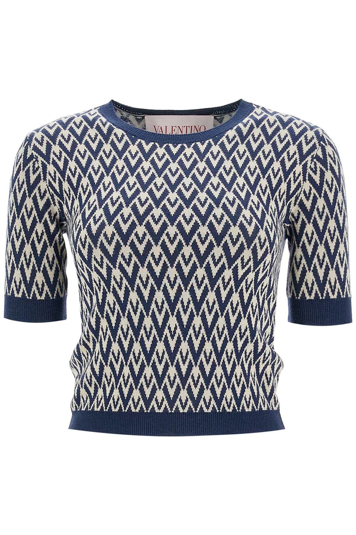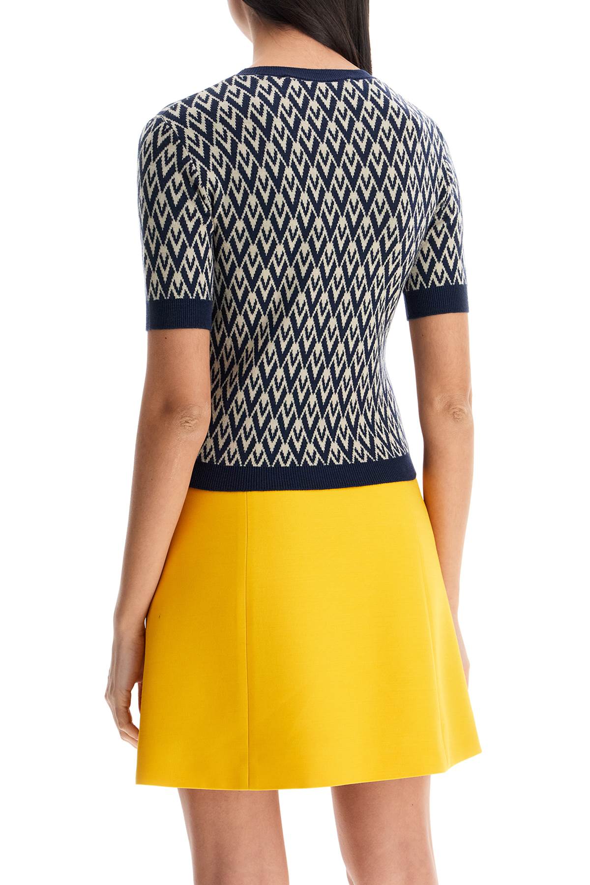 This Valentino short-sleeved pullover is made of virgin wool jacquard knit with a Toute La V design. It features a crew neck and ribbed edges with contrasting details. The fit is regular. The model is 177 cm tall and wears size XS.