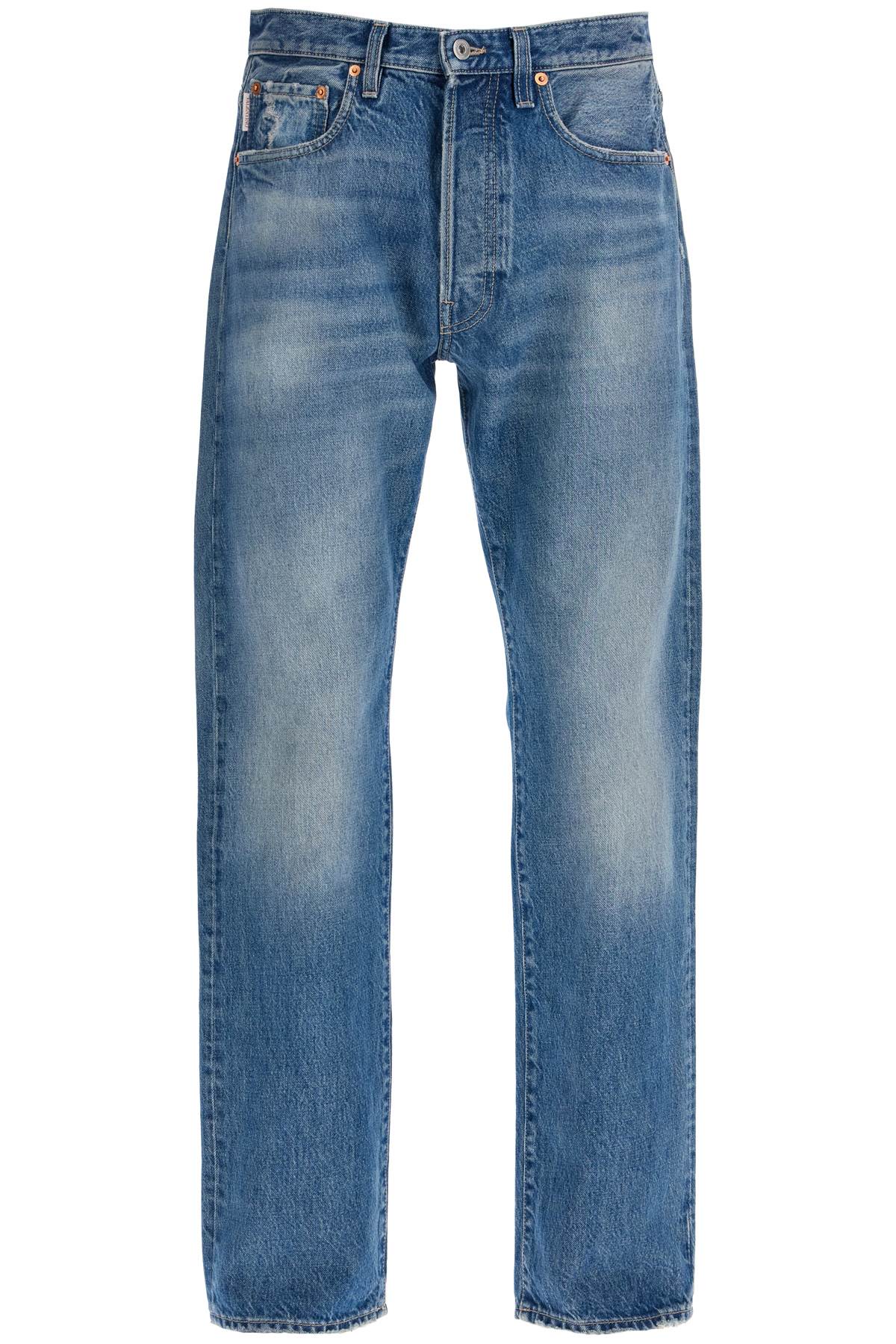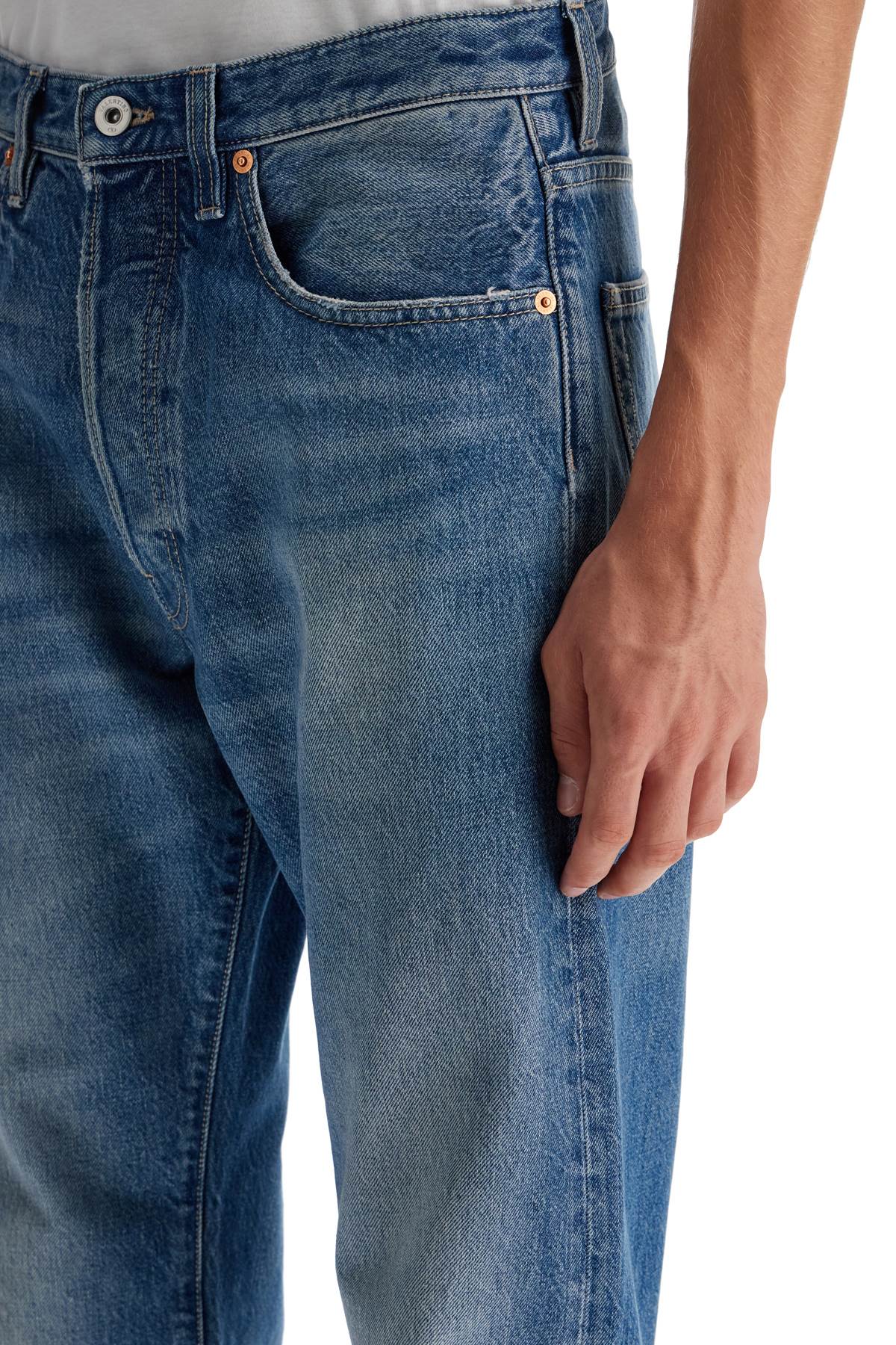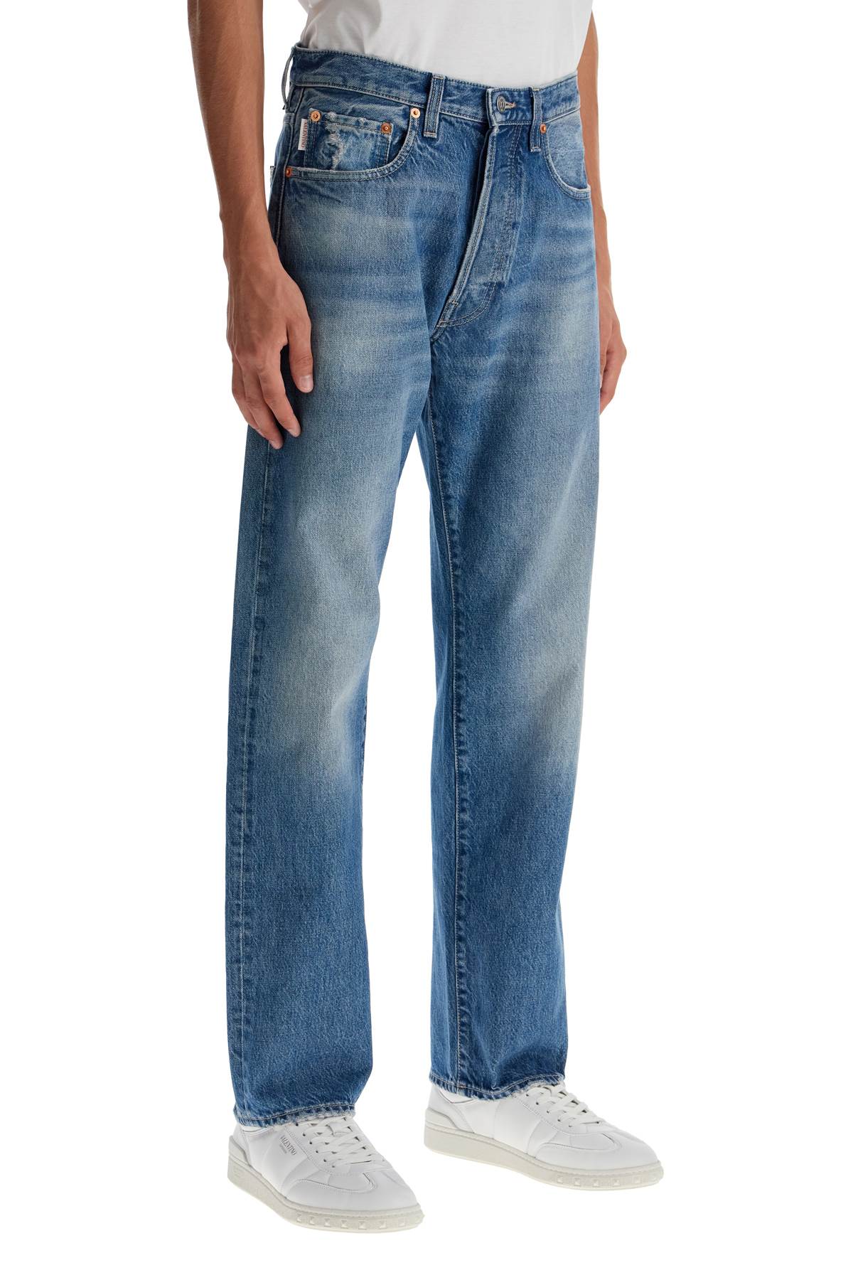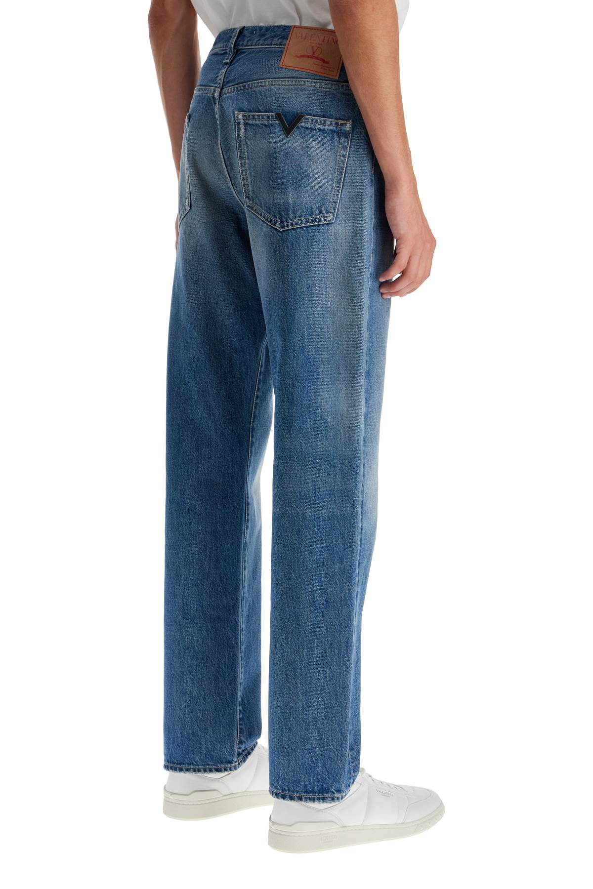 Valentino straight leg jeans made of pure cotton denim with a medium wash and metallic V detail on the back pocket. Featuring five-pocket design with distressed details, button fly closure, and a branded jacron patch on the back. The model is 187 cm tall and wears size 30.