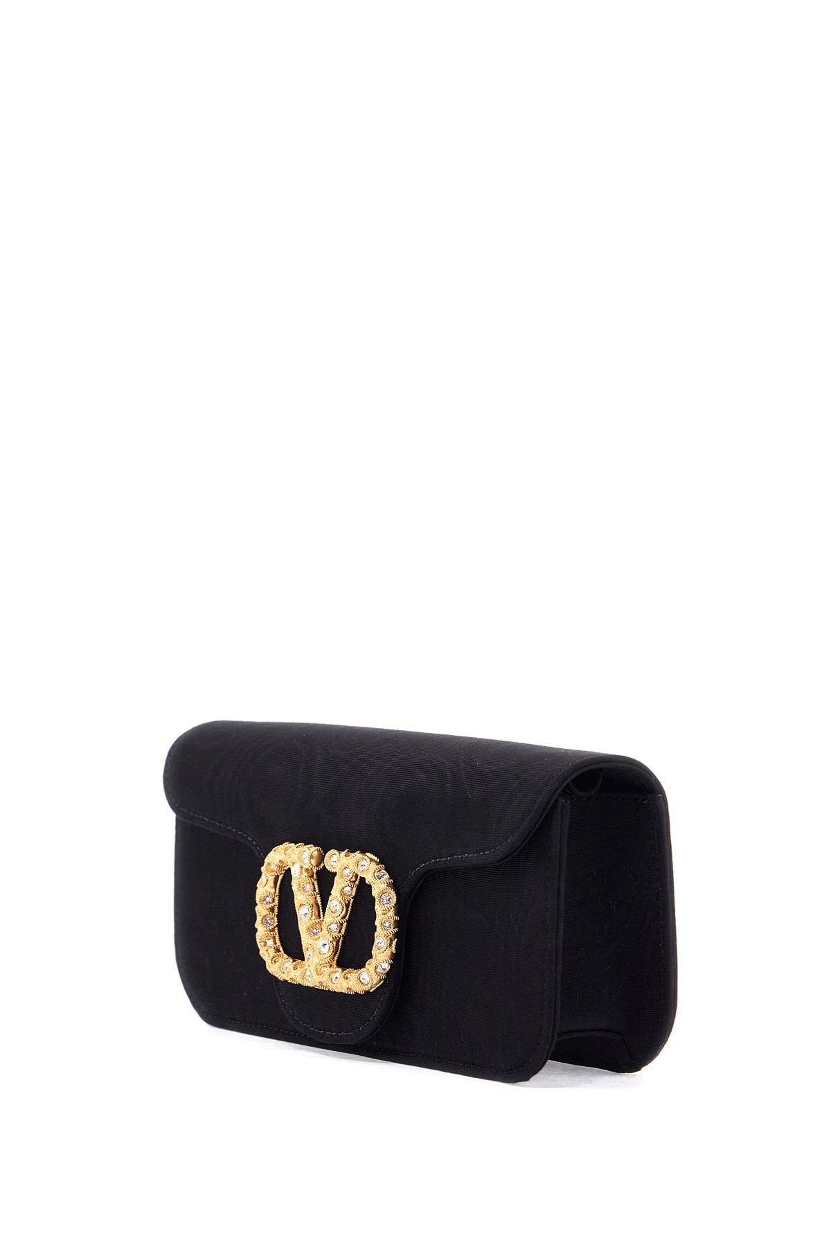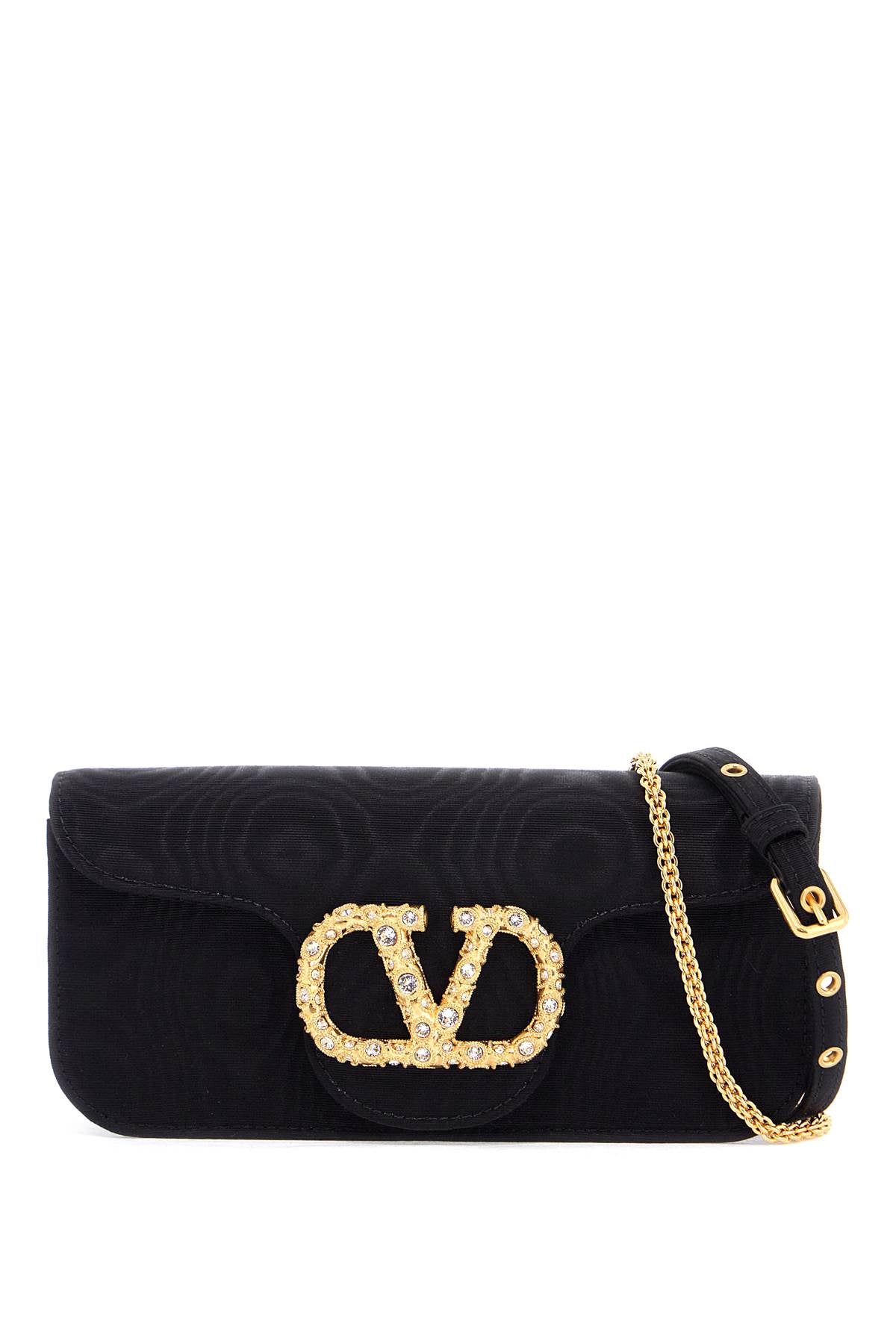 Valentino Garavani's Clutch Locò is made of moire fabric and embellished with a VLogo Signature element decorated with Swarovski®. It features a magnetic button closure, a matching interior with a flat pocket, and two additional straps - one in chain and the other in adjustable fabric. The metallic accessories have a gold finish. Size and Fit - Bag Length = 21 cm, Bag Height = 9 cm, Bag Weight = 4 cm,