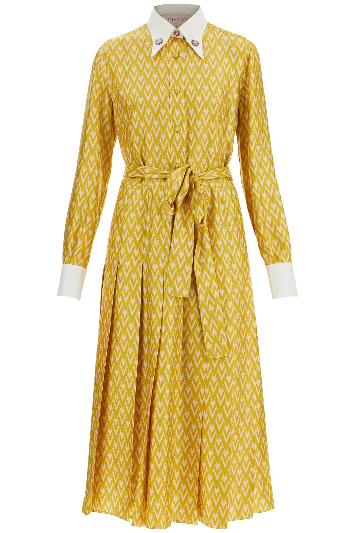 Long VALENTINO GARAVANI dress in Italian silk embodies timeless elegance. Geometric pattern on yellow ochre with white collar. Slim fit for a refined silhouette. Perfect for exclusive events.