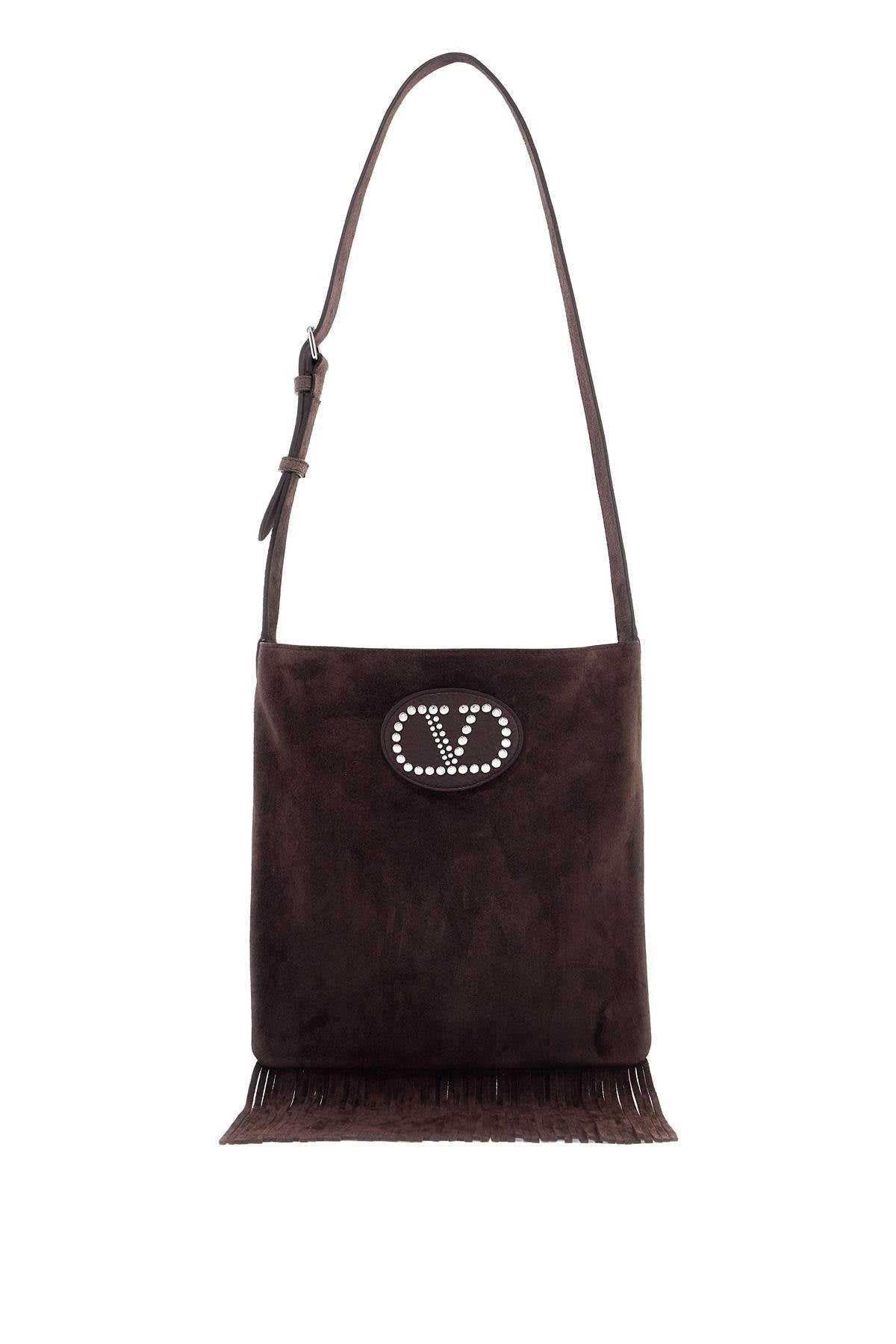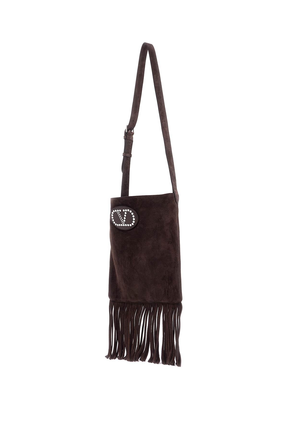 The Valentino Garavani crossbody bag in dark brown suede offers Italian elegance and functionality. With 'V' logo in rhinestones and decorative fringes, it embodies the refined style of Residenza 725. Size and Fit - Bag Length = 30 cm, Bag Height = 20 cm, Bag Weight = 10 cm,