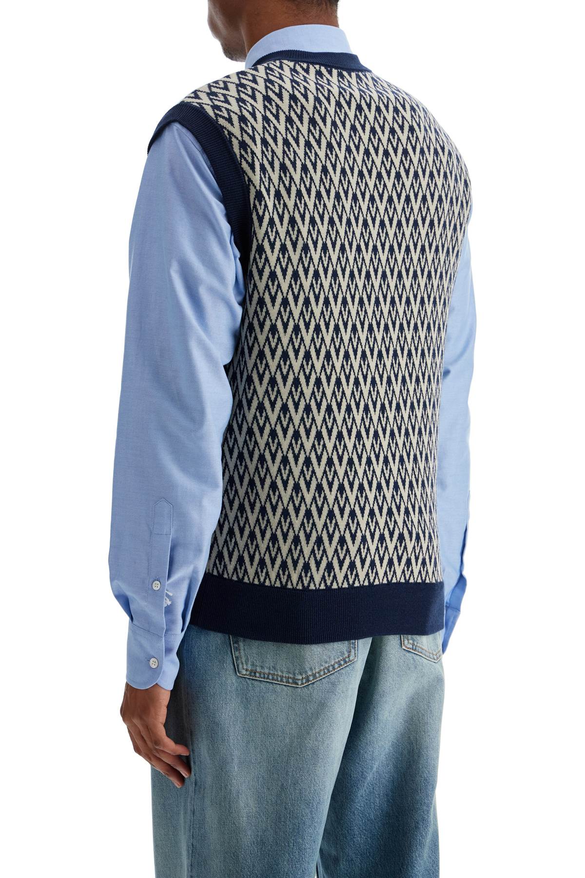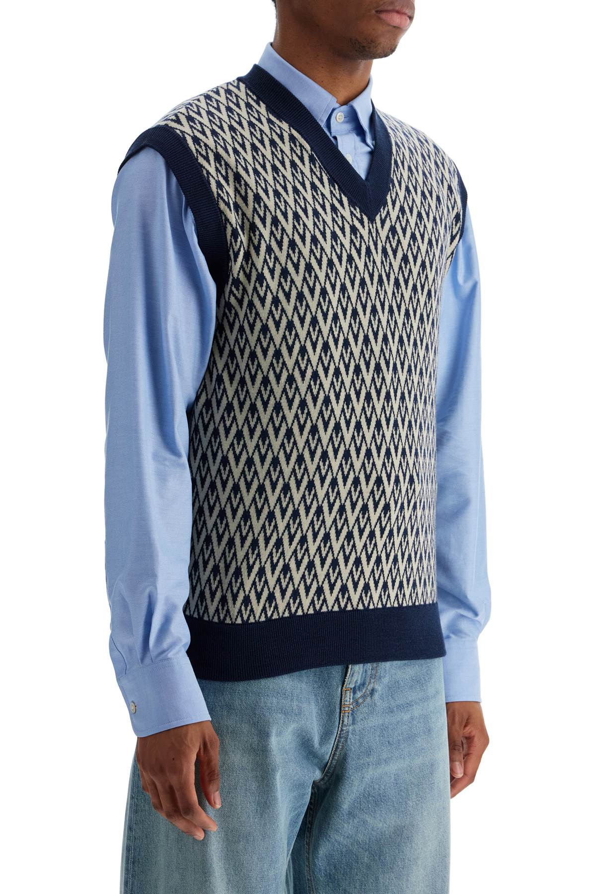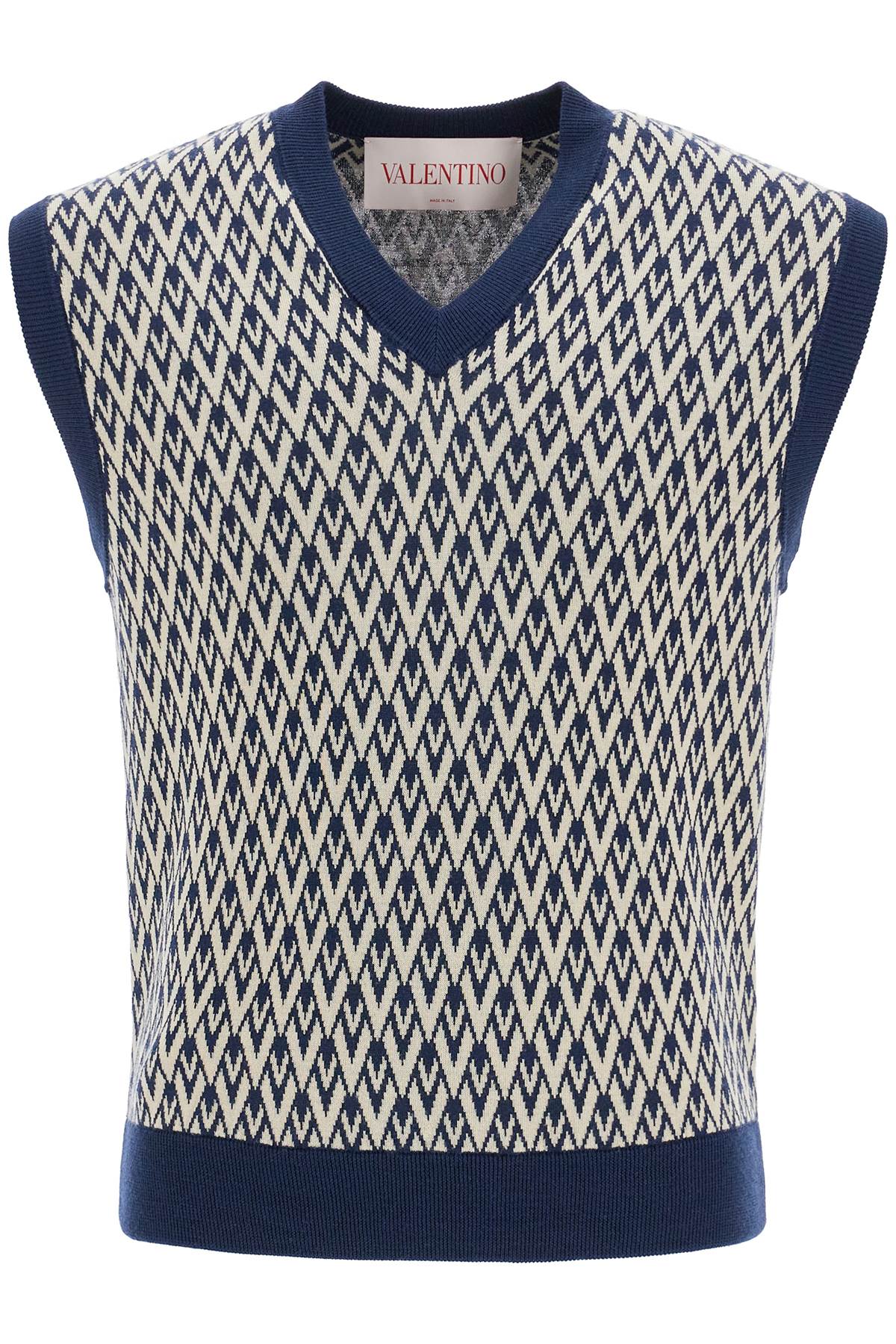 The Valentino Garavani men's vest offers timeless elegance. In virgin wool with a navy and cream zig-zag pattern, this slim fit vest combines Italian style and versatility for formal and casual chic looks.