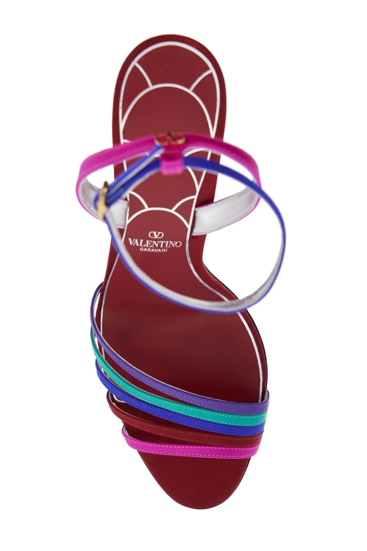 The Valentino Garavani sandals offer multicolor design and strass for spring summer 2025. High heel and red sole embody luxury and Italian craftsmanship, perfect for sophisticated outfits.