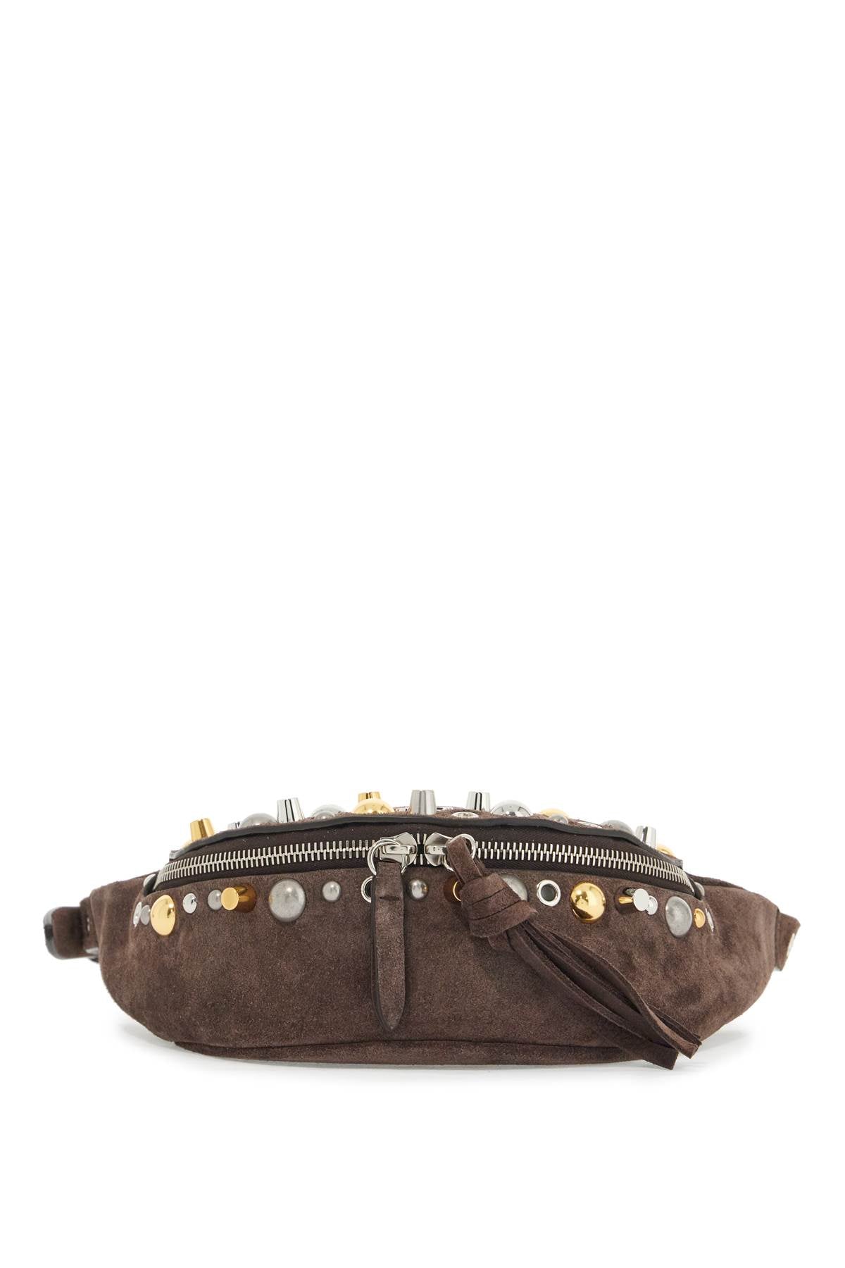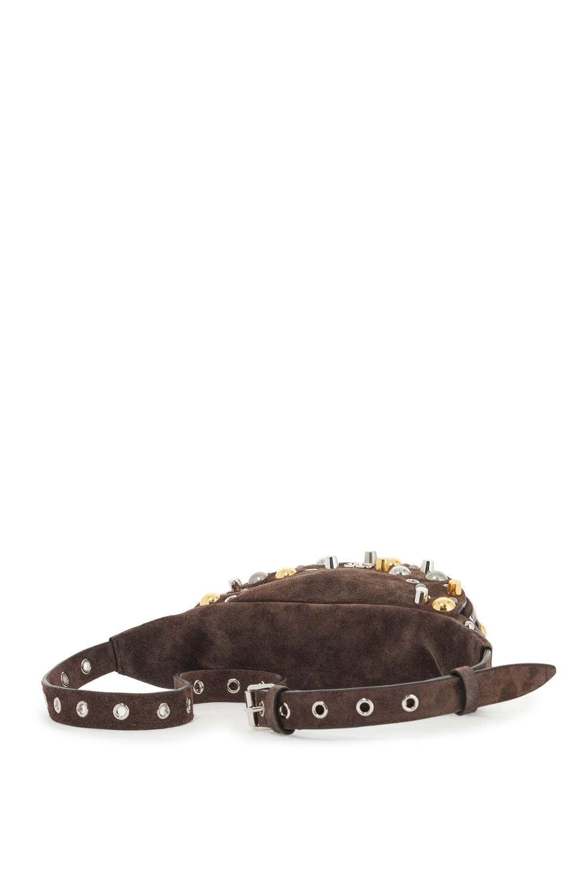 The Nellcôte Marsupio by Valentino Garavani is made of suede leather and adorned with studs of various shapes and sizes, as well as a small Signature Vlogo. It features a double zip closure, an interior slot for cards, and an adjustable belt. Size and Fit - Bag Length = 20 cm, Bag Height = 14 cm, Bag Weight = 7 cm,