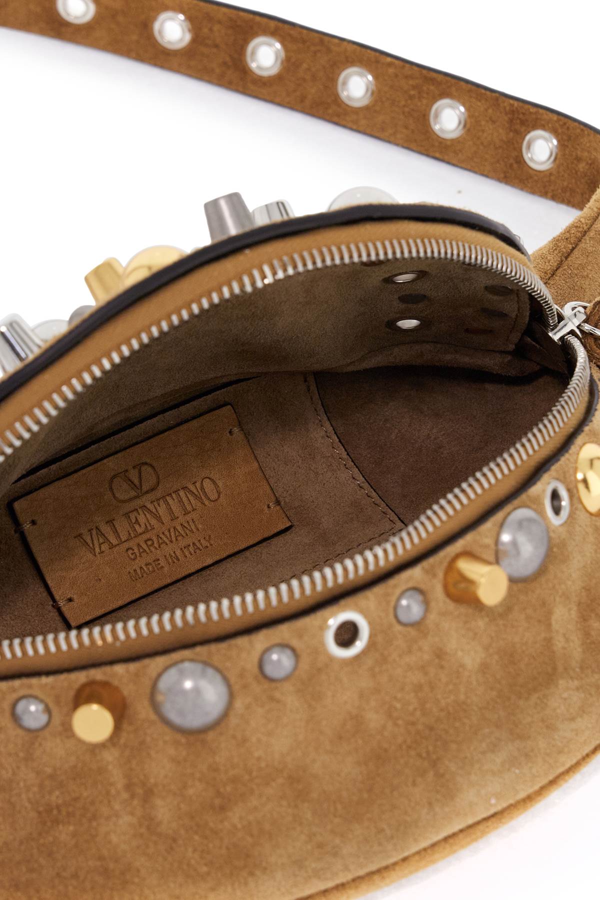 The Nellcôte Marsupio by Valentino Garavani is made of suede leather and adorned with studs of various shapes and sizes, as well as a small Signature Vlogo. It features a double zip closure, an interior slot for cards, and an adjustable belt. Size and Fit - Bag Length = 20 cm, Bag Height = 14 cm, Bag Weight = 7 cm,