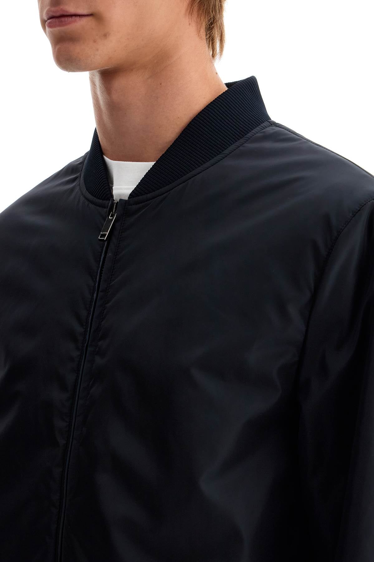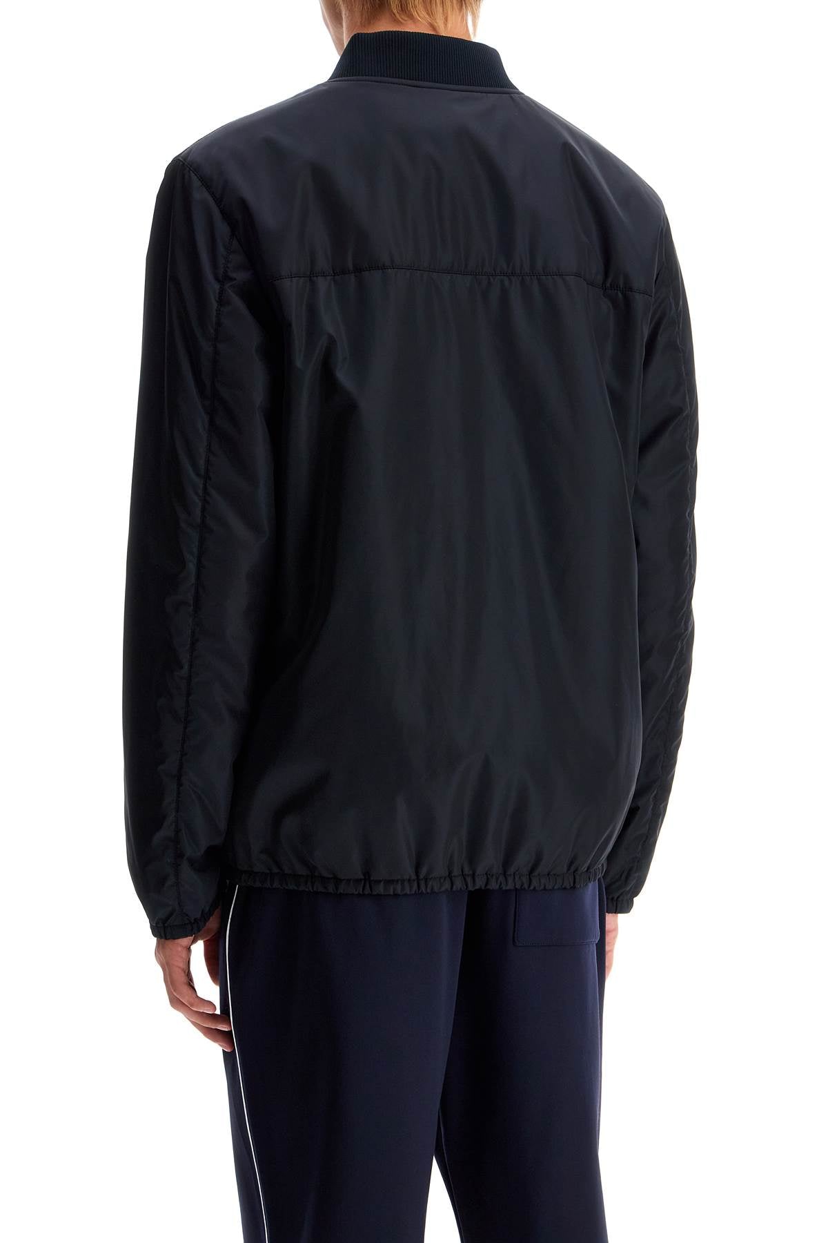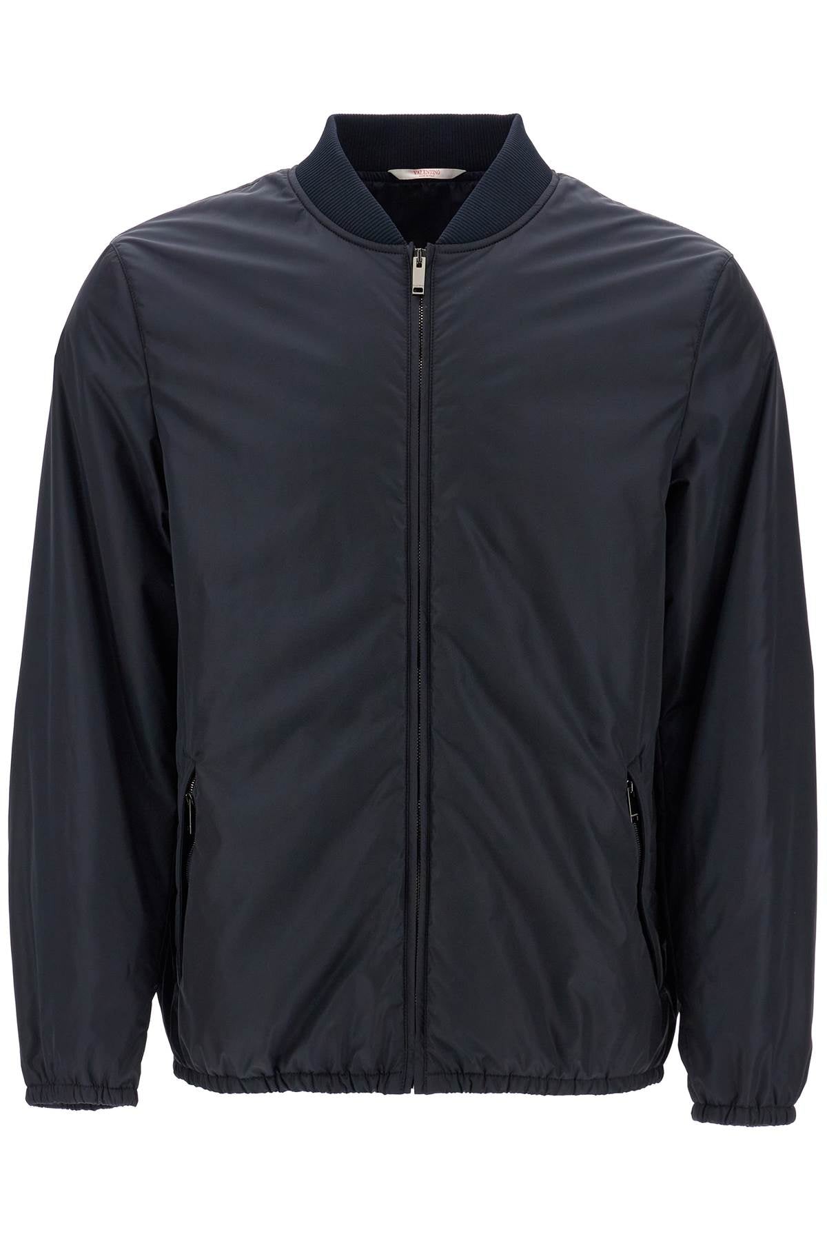 Valentino's nylon bomber jacket features a regular fit with elasticized cuffs and hem, as well as a ribbed collar. It has a zip closure, front flap pockets with zippers, a back yoke, Iconographe Toile lining, and an inner pocket. The model is 187 cm tall and wears size IT 48.