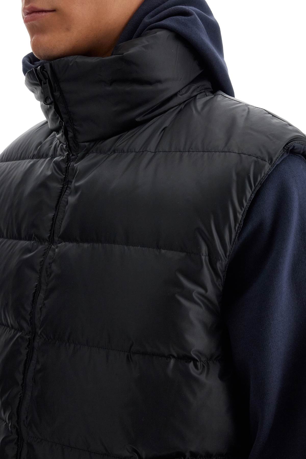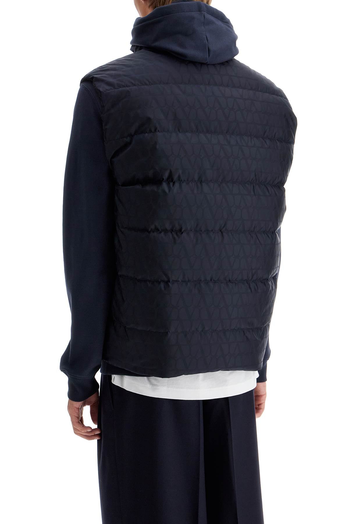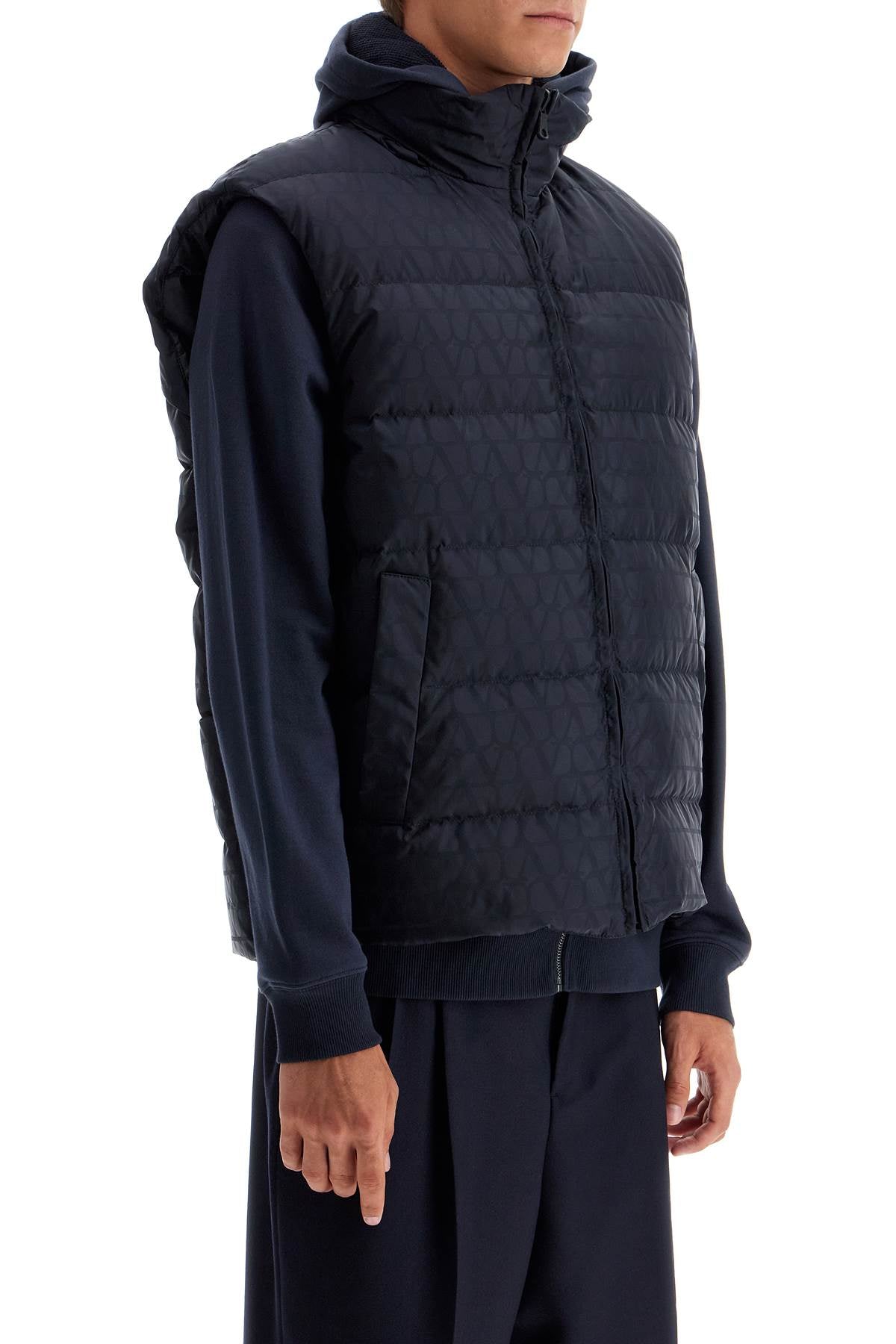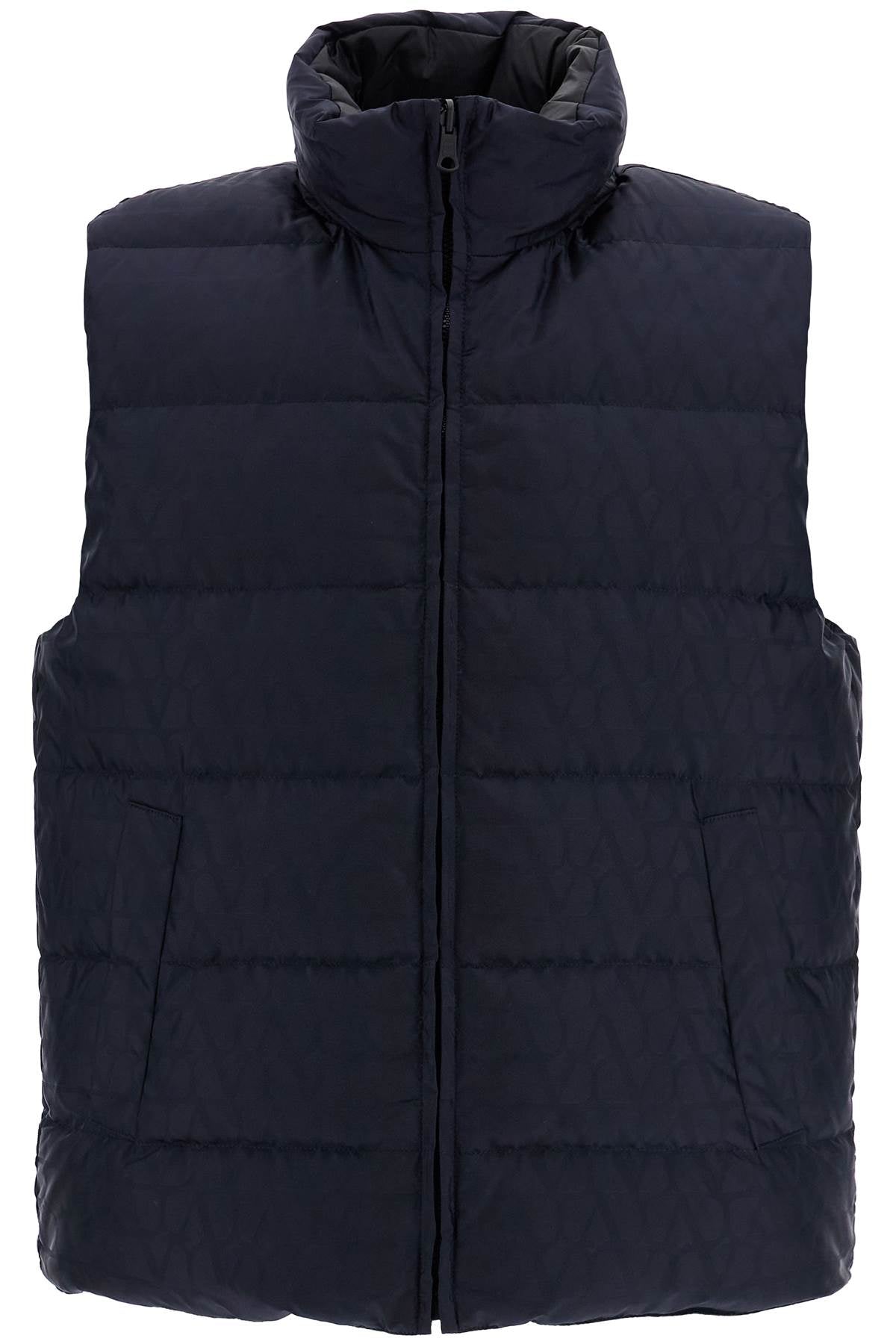 The reversible Valentino vest is made of quilted nylon with feather padding. The blue side features the iconic Toile Iconographe pattern in tone-on-tone jacquard, while the solid black side has a semi-gloss finish. The stand-up collar houses a removable hood, and both sides have two practical flap pockets. Zip closure, regular fit. The model is 187 cm tall and wears size IT 48.