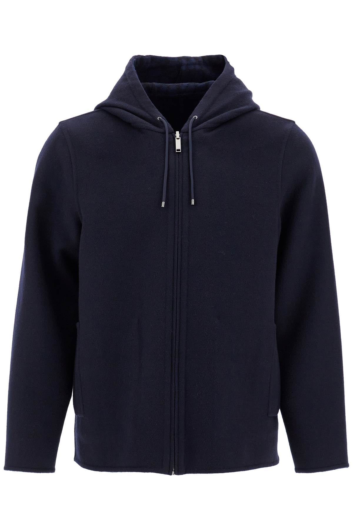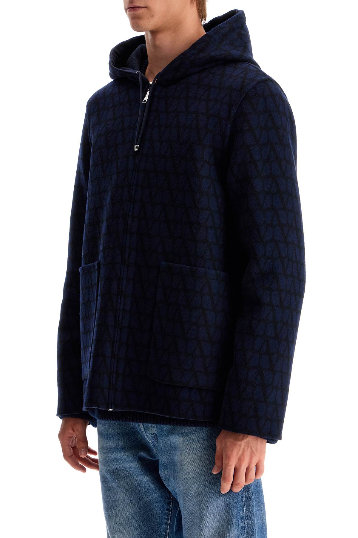 Valentino's reversible caban is made of double wool and features one side in a solid color and the other with the iconic Toile Iconographe all-over pattern. It has a hood, zip closure, external welt pockets, and internal patch pockets. Regular fit. The model is 187 cm tall and wears size IT 48.