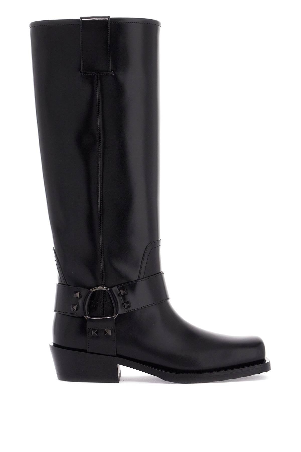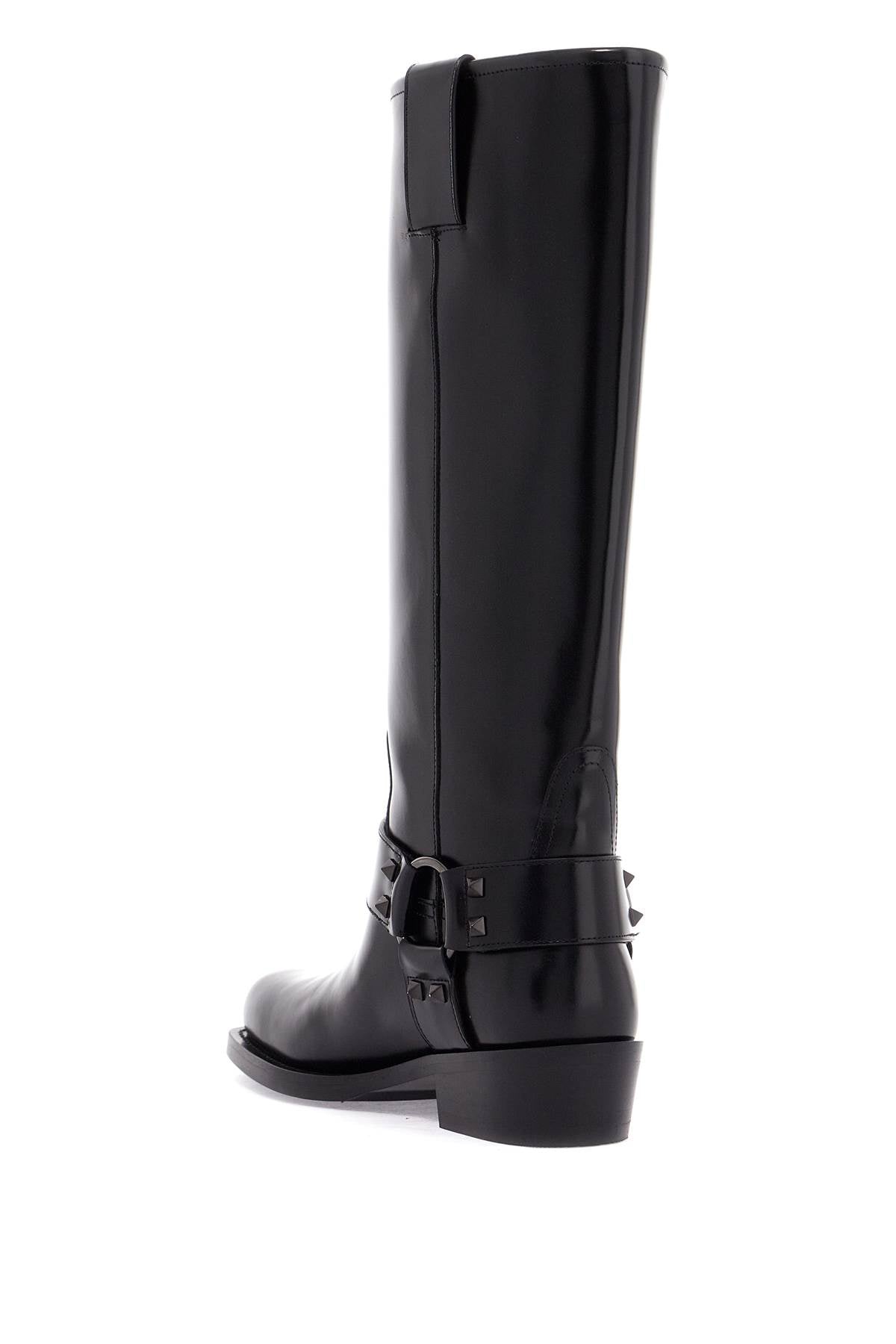 Valentino Garavani's Rockstud biker boots are made of leather with iconic ruthenium metal studs. They feature side straps, a leather interior, and a rubber sole. Size and Fit - Heel Height = 4 cm,