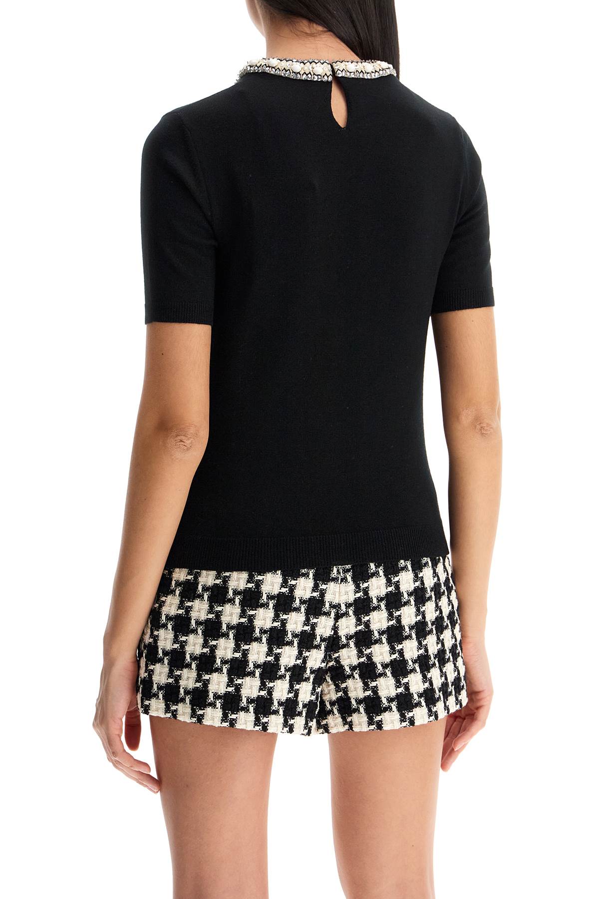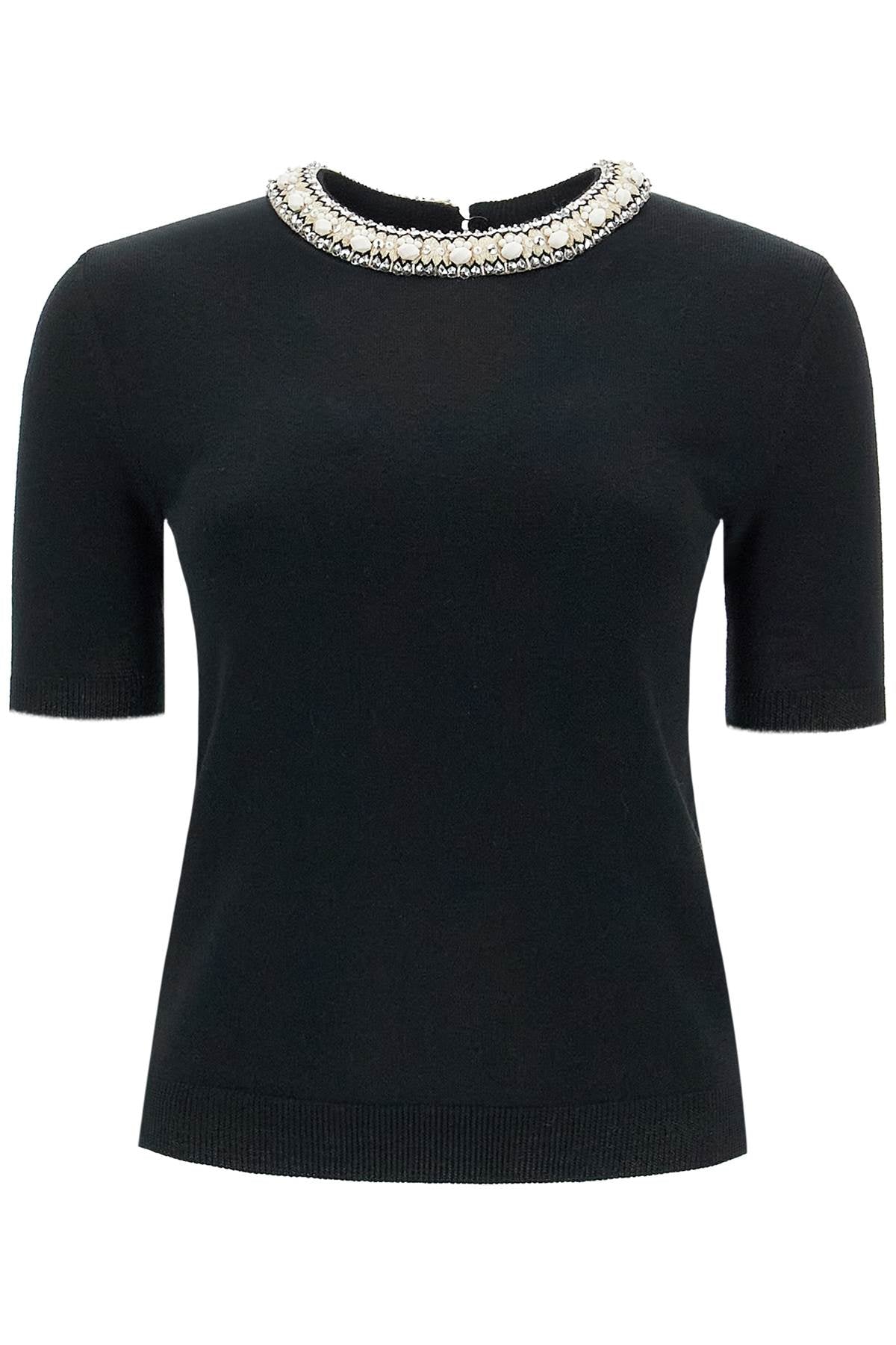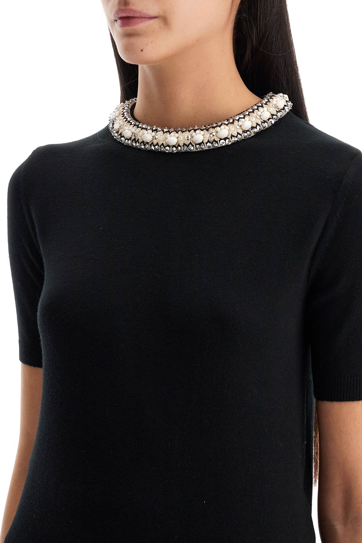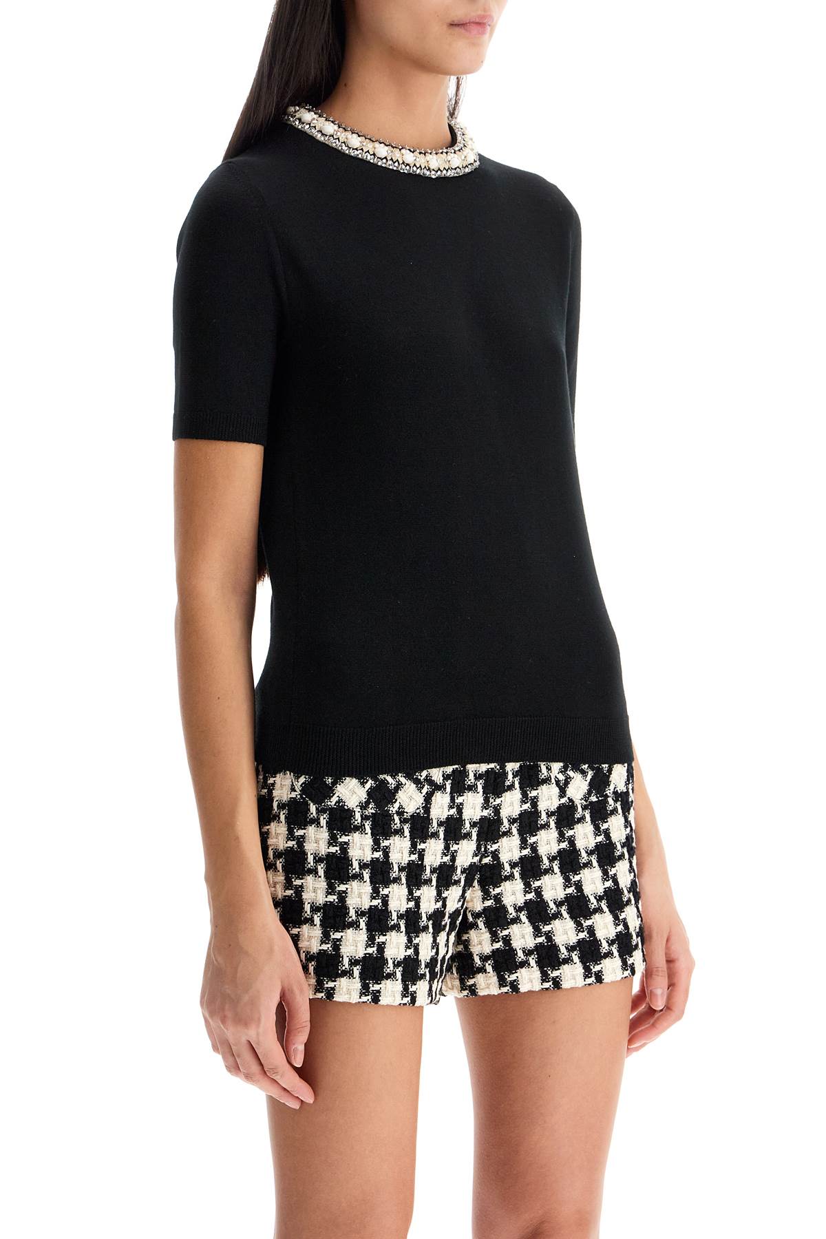 Valentino short-sleeved sweater in fine pure virgin wool, embellished with a jewel embroidery on the round neckline. It features a straight and slim silhouette with ribbed cuffs and hem. Button closure at the back of the neck. The model is 177 cm tall and wears size S.