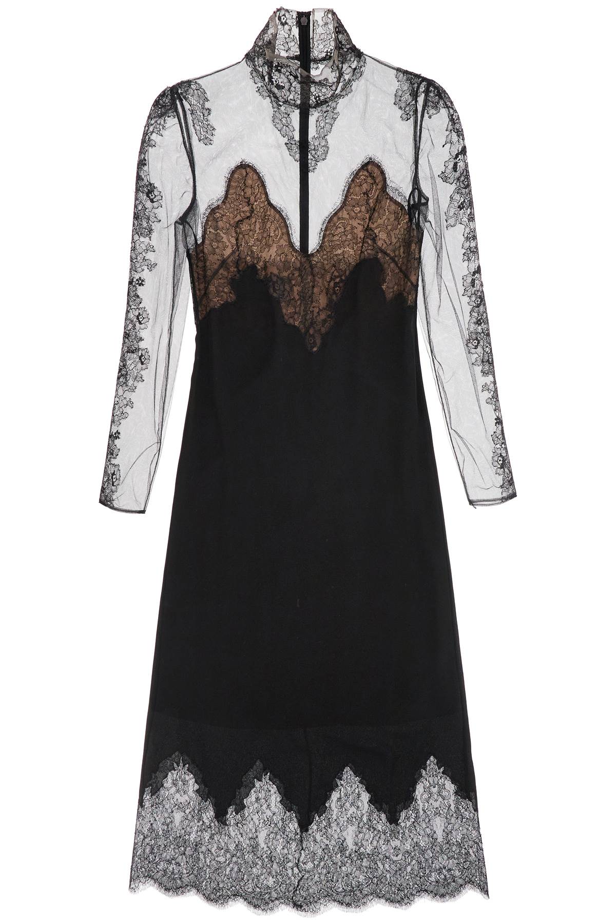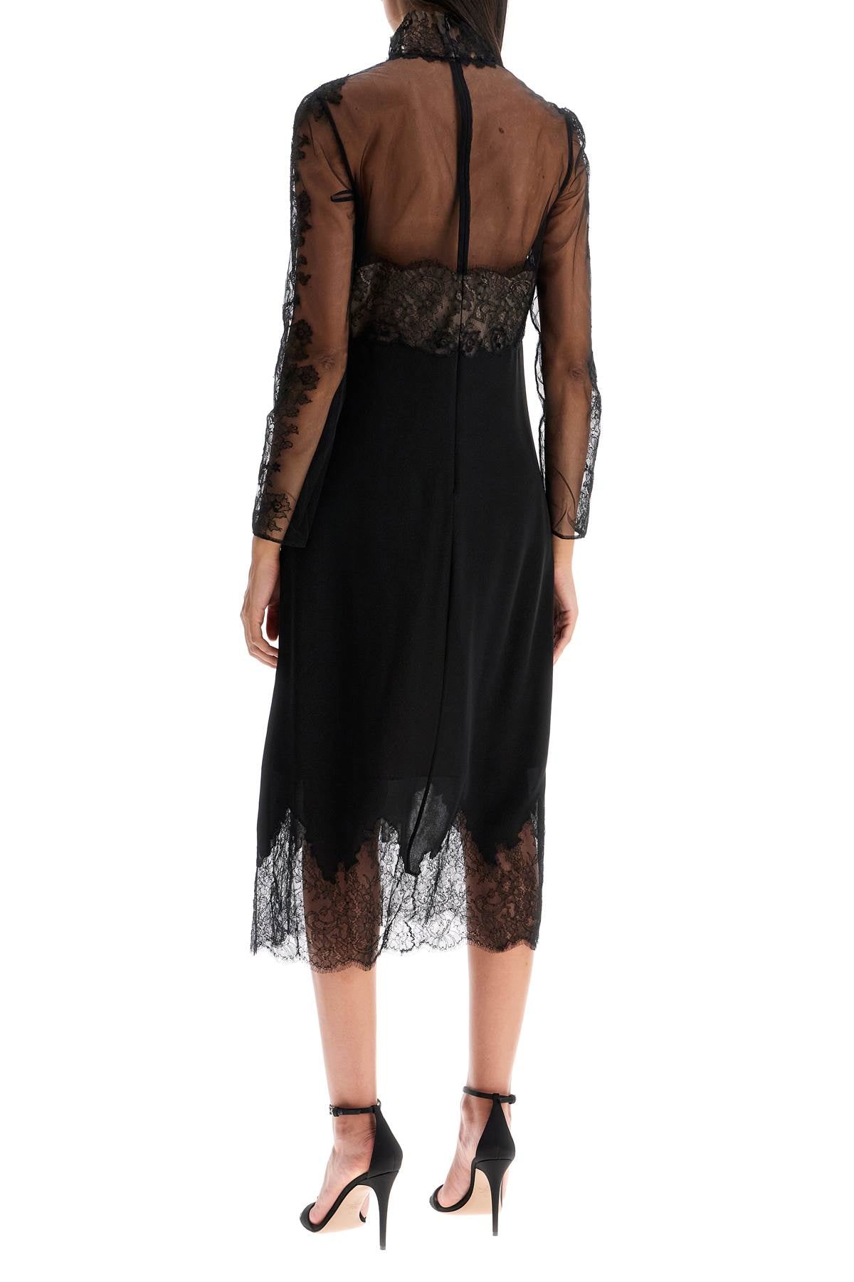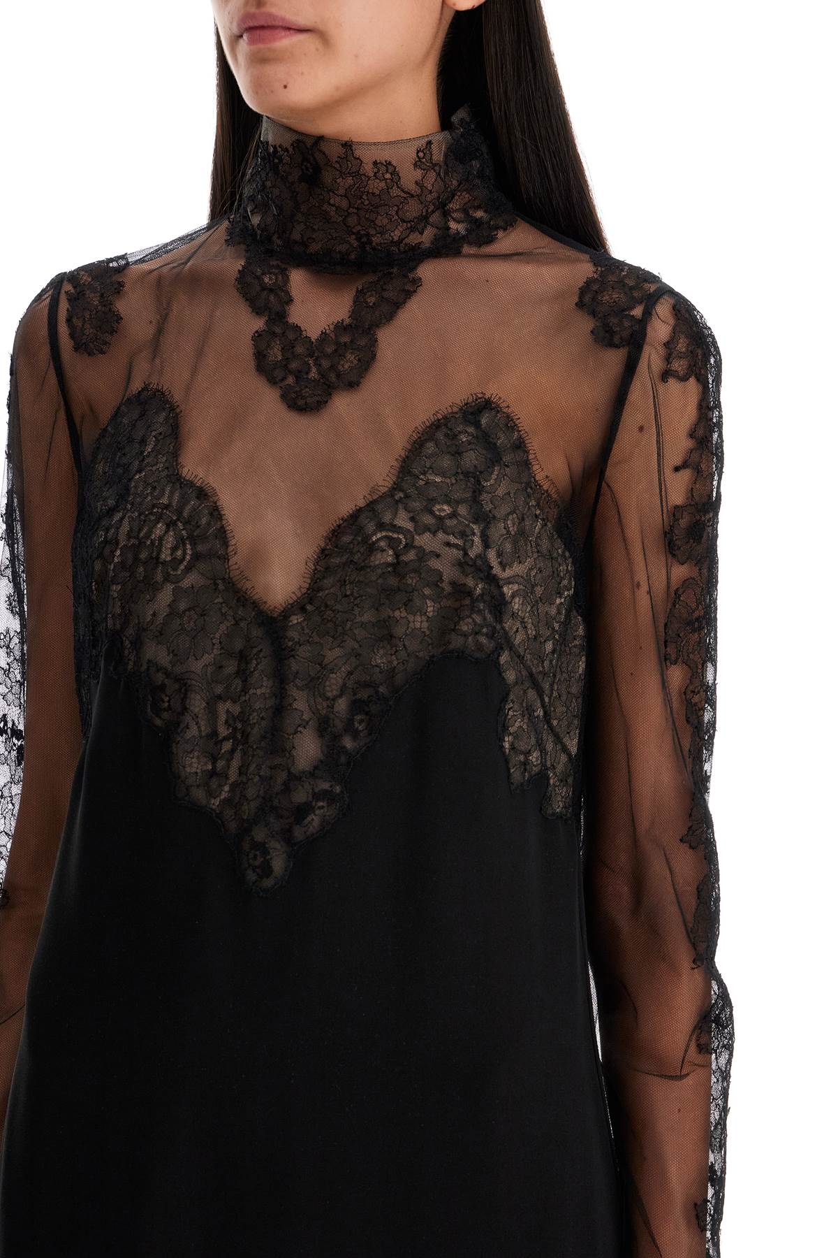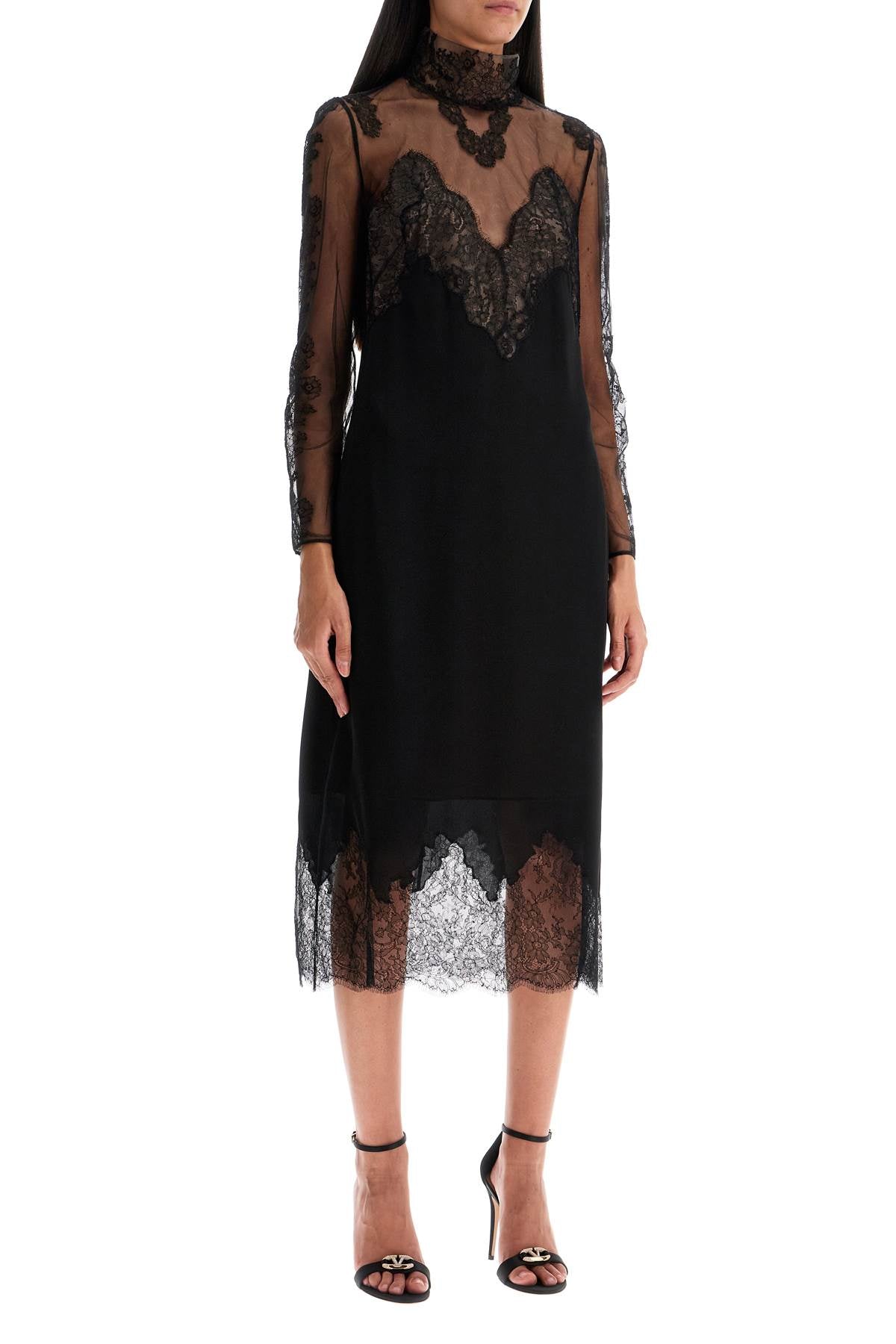 This Valentino midi dress features a straight and fluid silhouette, made of pure silk crêpe and tulle with Chantilly lace inserts. It has a standing collar and long sleeves, with an invisible zip closure at the back and a nude-colored lining. The model is 177 cm tall and wears size IT 40.