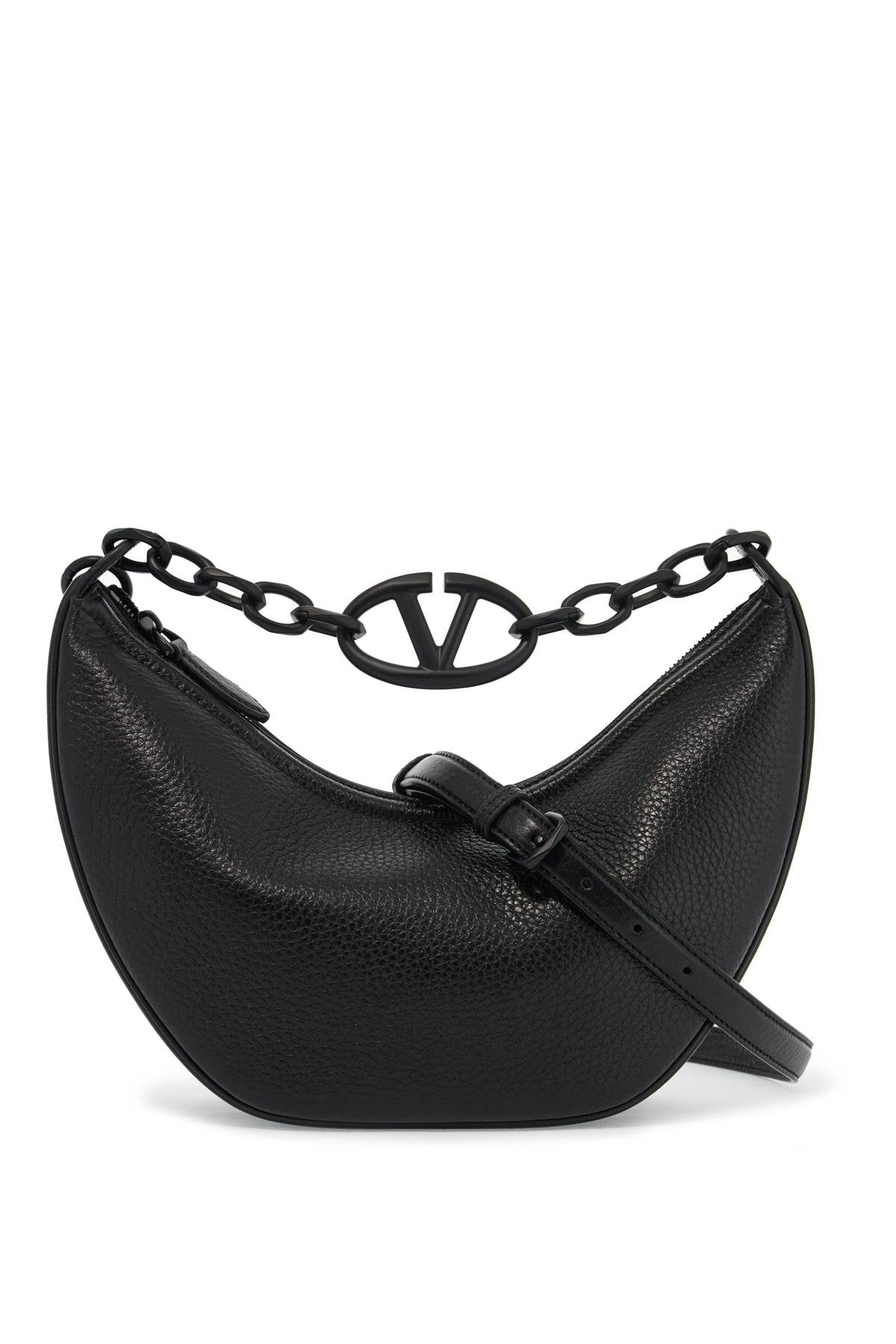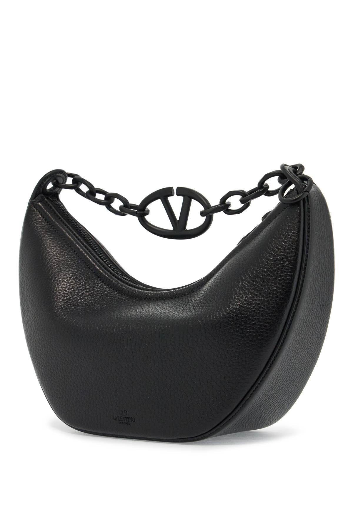 The small VLogo Moon Bag by Valentino Garavani is a hobo bag made of hammered leather and features a chain handle detailed with the Signature VLogo element. Its design is versatile, thanks to the additional leather shoulder strap, and it has a top zip closure, a nappa interior with a flat pocket, and matte tone-on-tone metallic accessories. Size and Fit - Bag Length = 22 cm, Bag Height = 12,5 cm, Bag Weight = 11 cm, Handle Height = 13 cm,