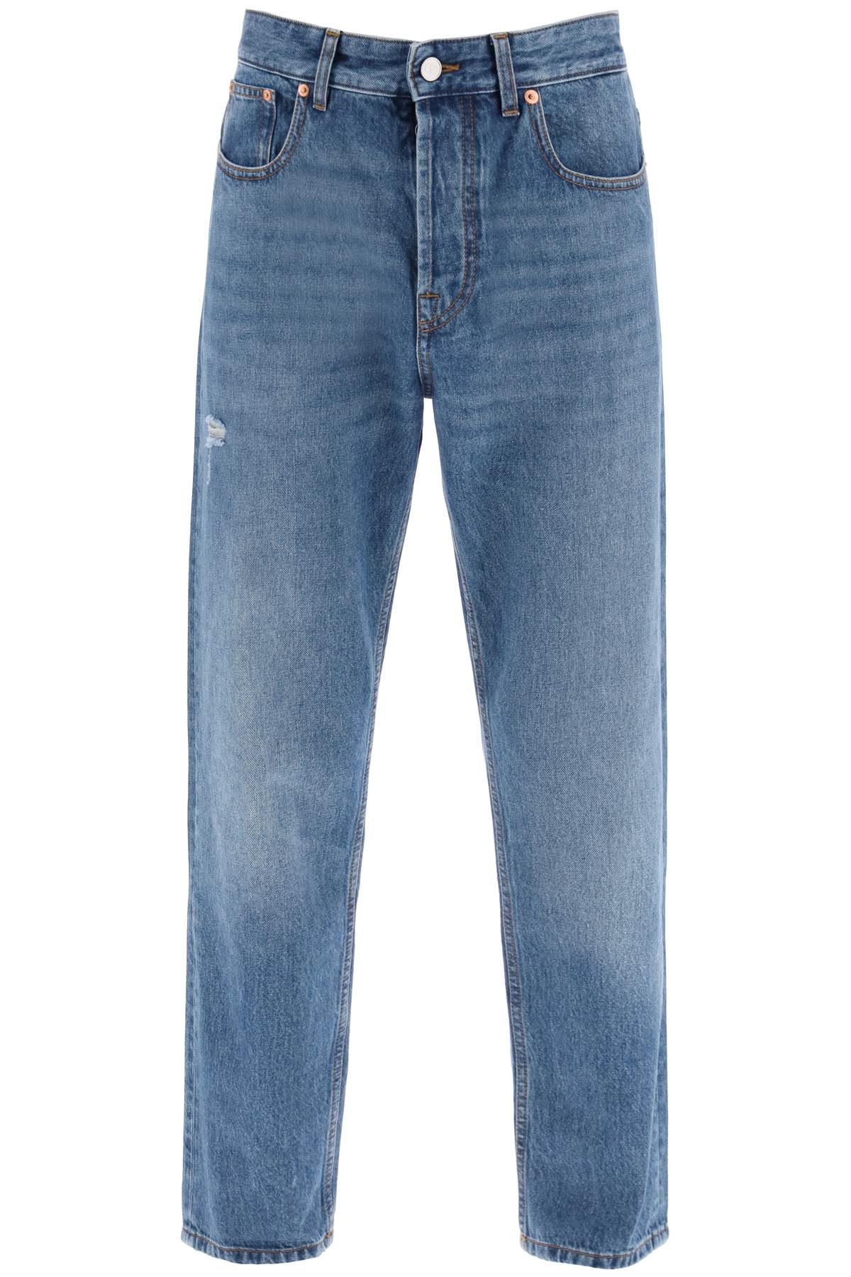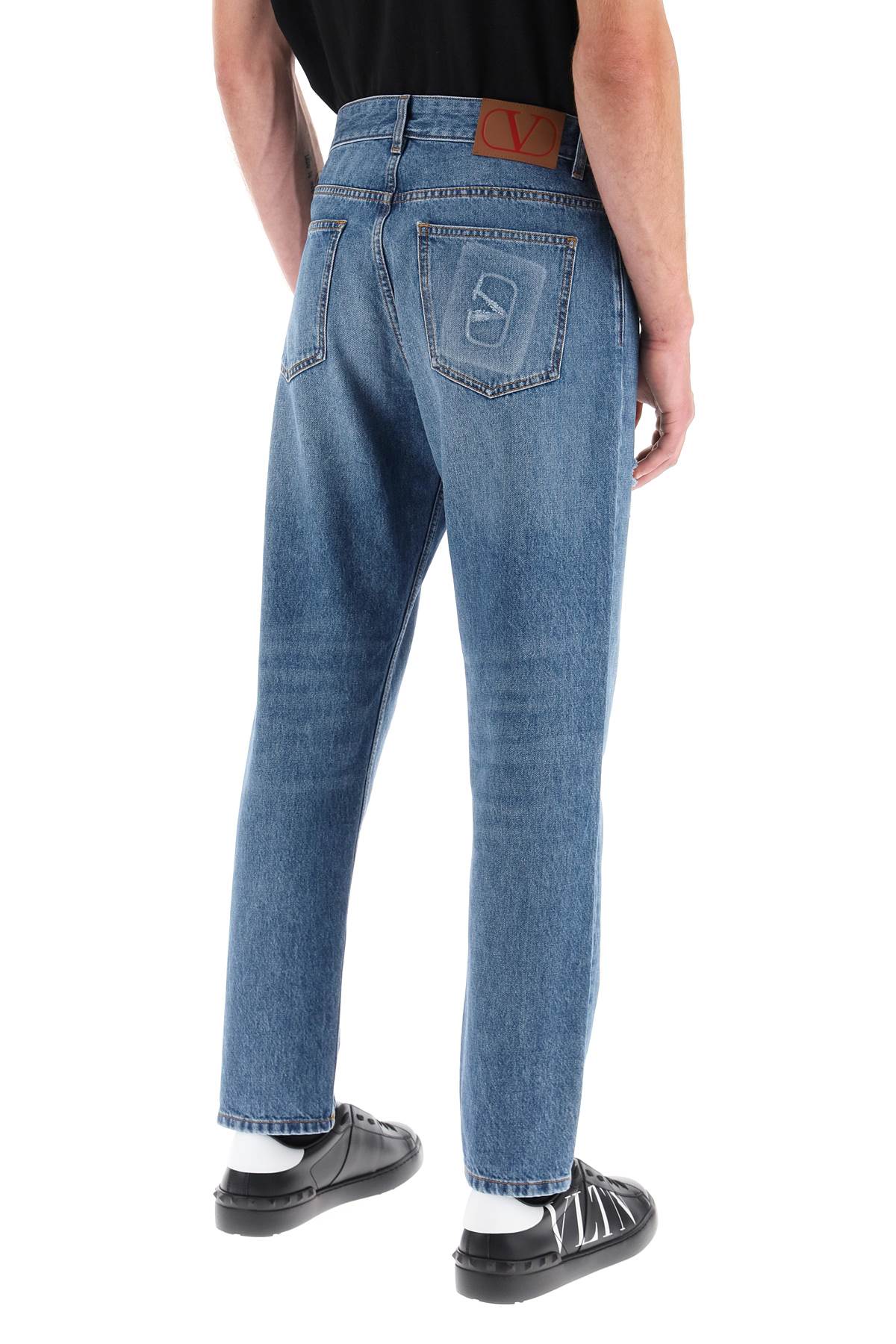 Valentino five-pocket jeans crafted pure cotton denim with medium wash. Characterized by stamped VLogo Signature on the back pocket, this model features belt loops on the waistband and zipper fly with logoed button. Finished with distressed detail on the right leg. Regular fit with tapered leg. The model is 187 cm tall and wears size 31.