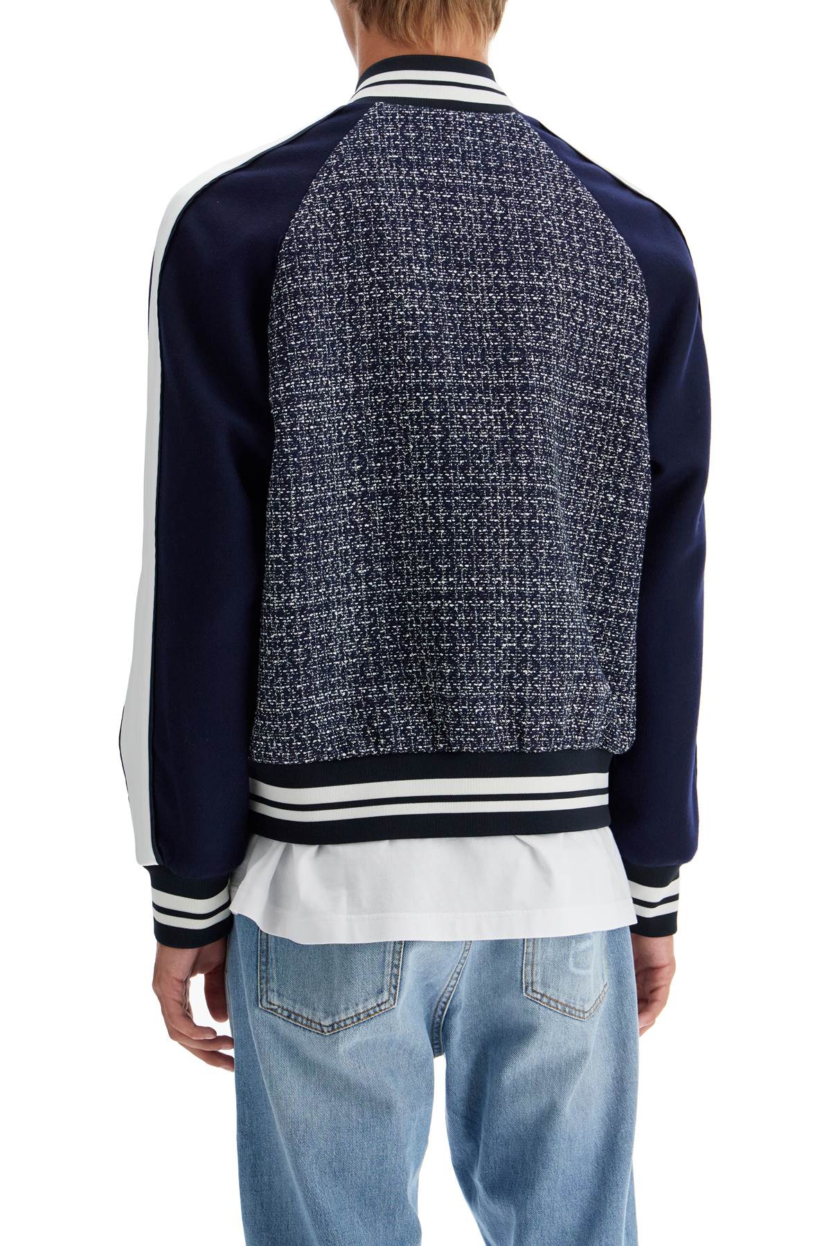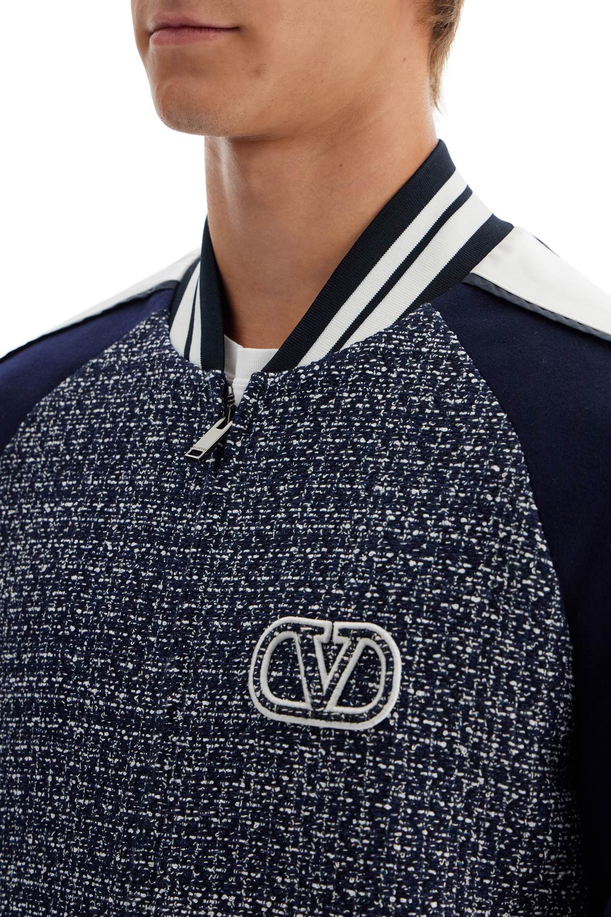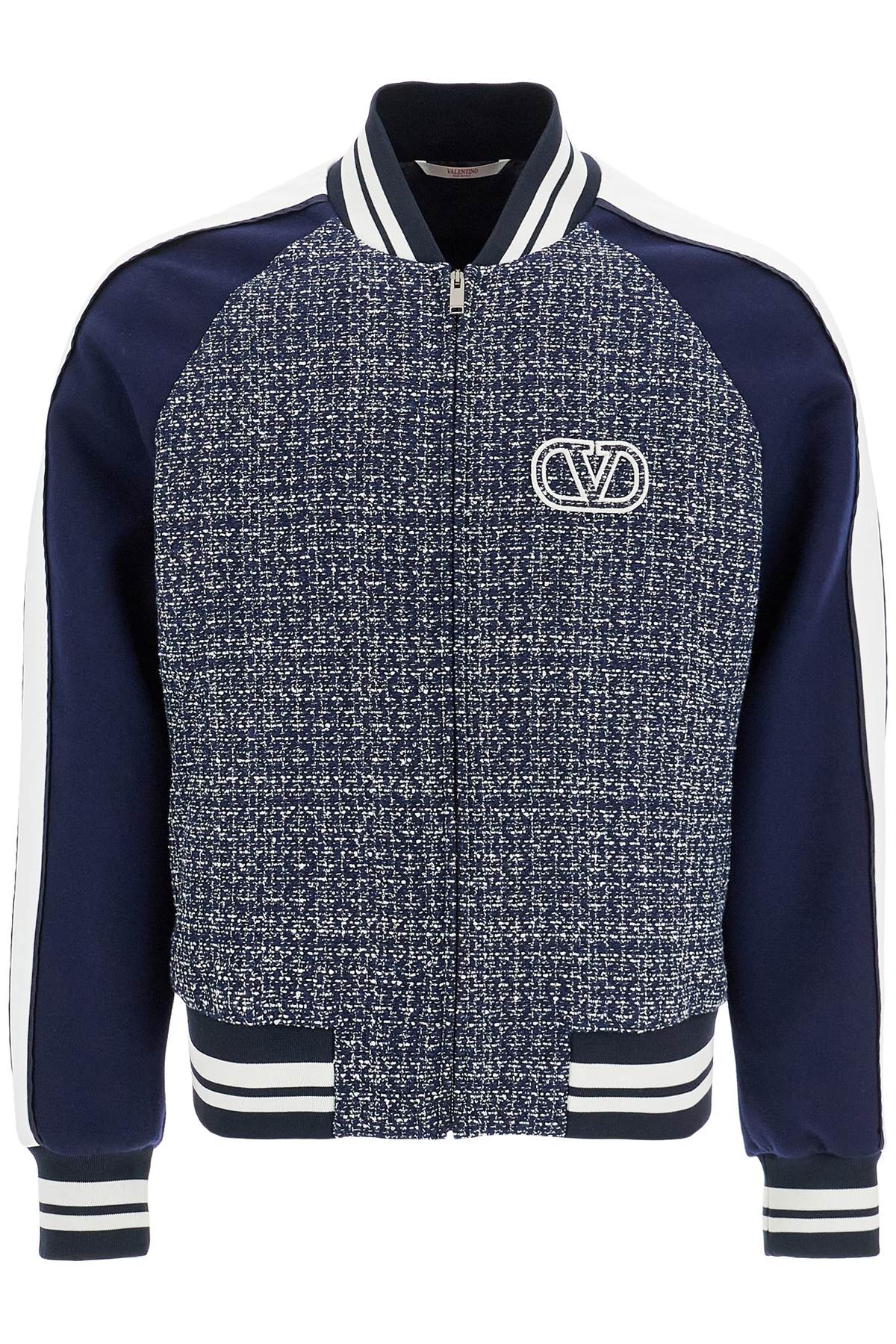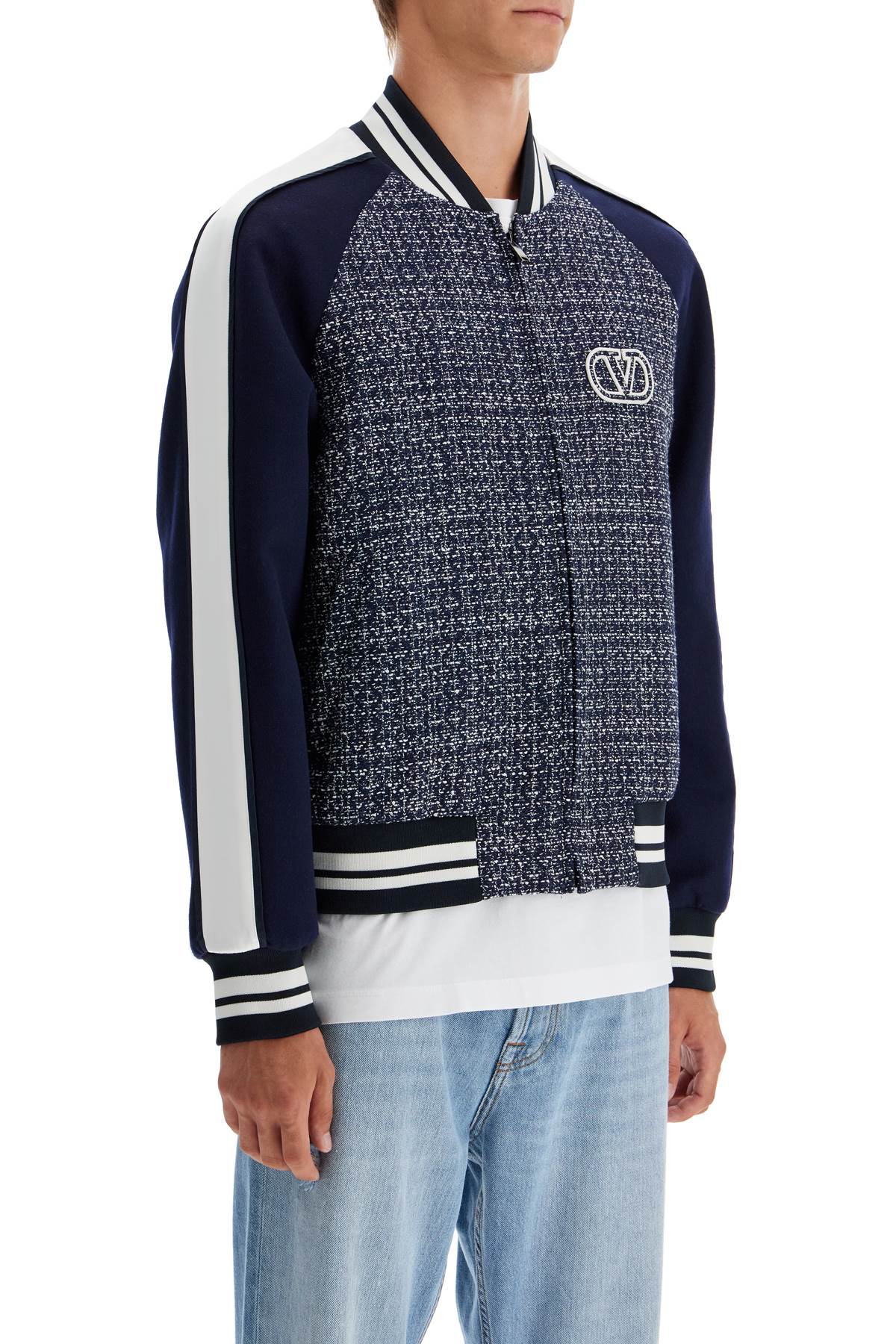 Valentino bomber jacket in cotton blend tweed with raglan sleeves in wool and cashmere embellished with contrasting satin bands. Finished with ribbed stripes on the edges, it features a zip closure, oblique side pockets and VLogo Signature application on the chest. Slim fit. The model is 187 cm tall and wears size IT 48.