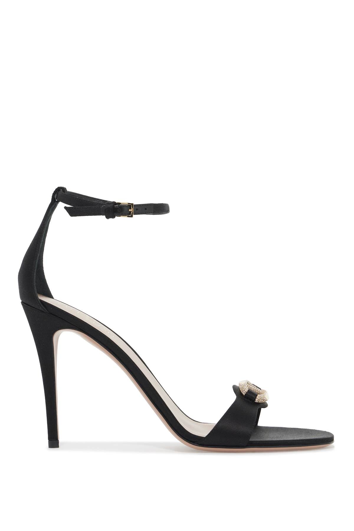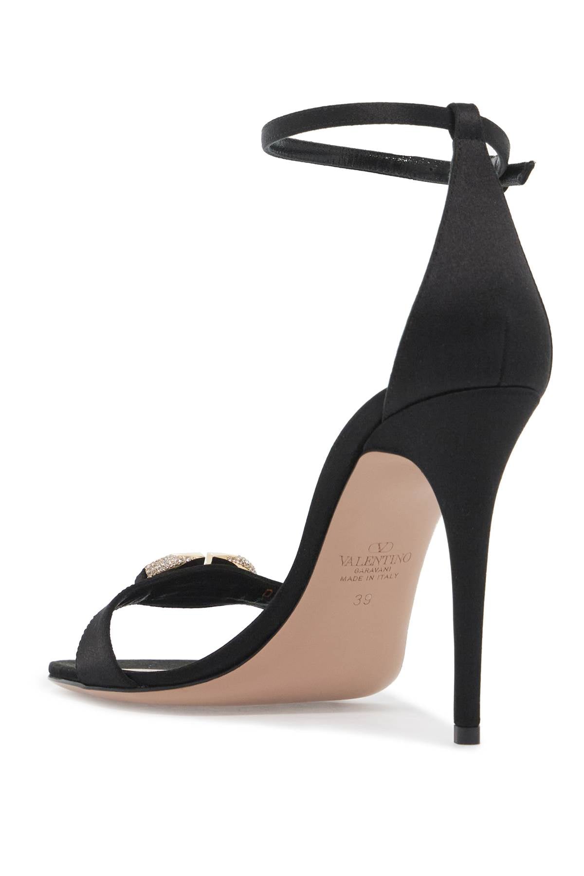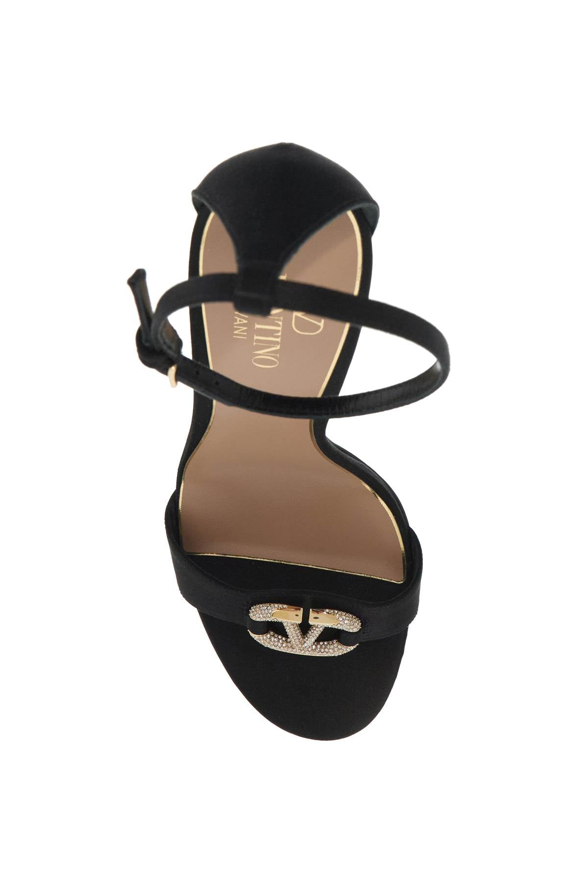Valentino Garavani sandals made of silk blend satin, embellished with the iconic VLogo Signature in gold-tone metal studded with crystals and complete with an adjustable ankle strap. Leather insole with laminated logo lettering, covered heel and leather sole. Size and Fit - Heel Height = 10 cm,