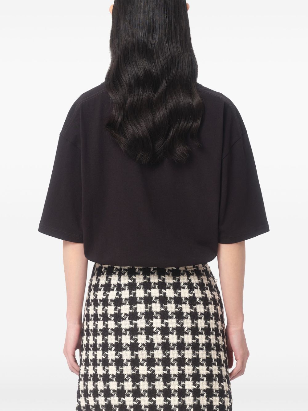 black cotton logo print to the front round neck drop shoulder short sleeves Size and Fit - This piece fits true to size. We recommend you get your regular size. Model is 1,75m / 5ft 8in wearing size S