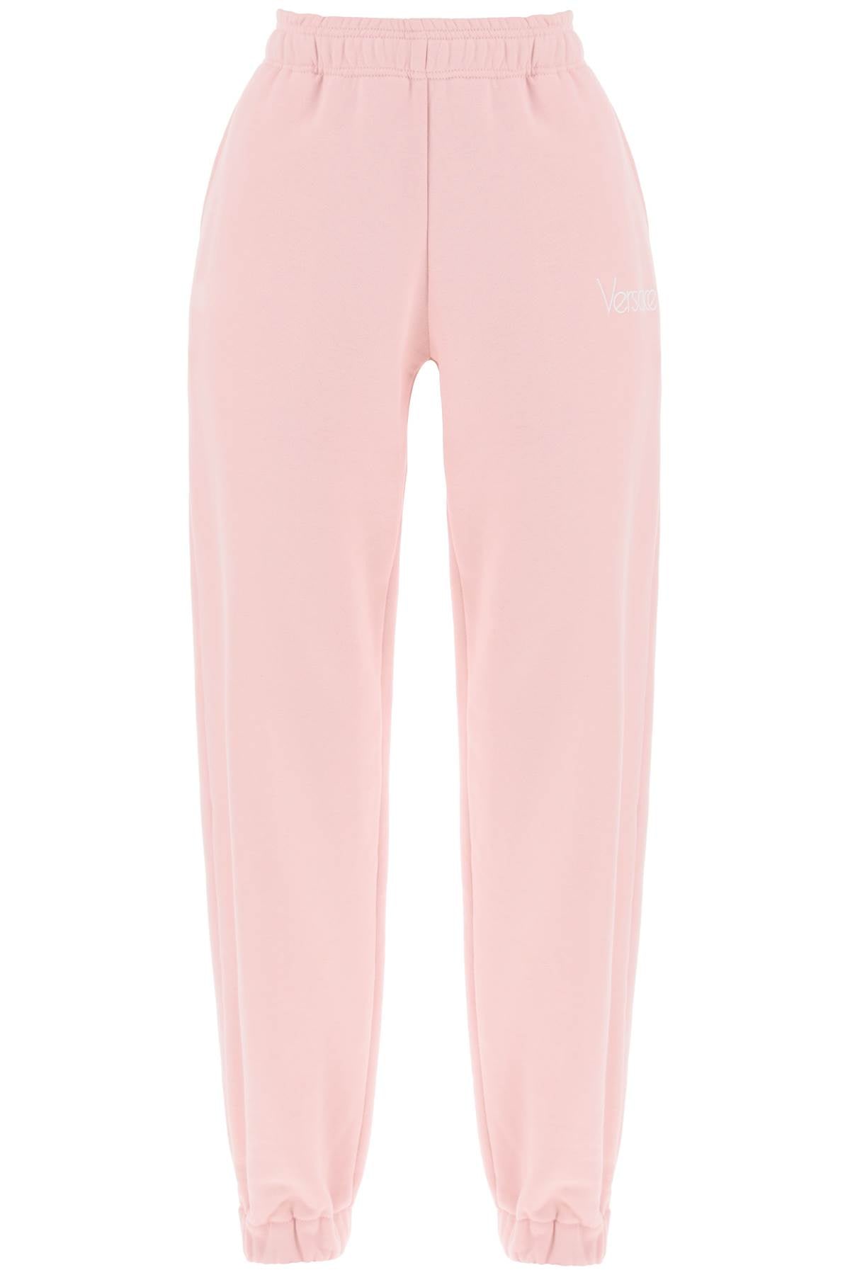 Versace joggers crafted in cotton french terry with the archive 1978 Re-Edition logo embroidery. They feature elasticated waistband with inner drawstring, side slash pockets, a patch pocket enriched by logo label on the back and elasticated hem. Loose fit. The model is 177 cm tall and wears size IT 38.
