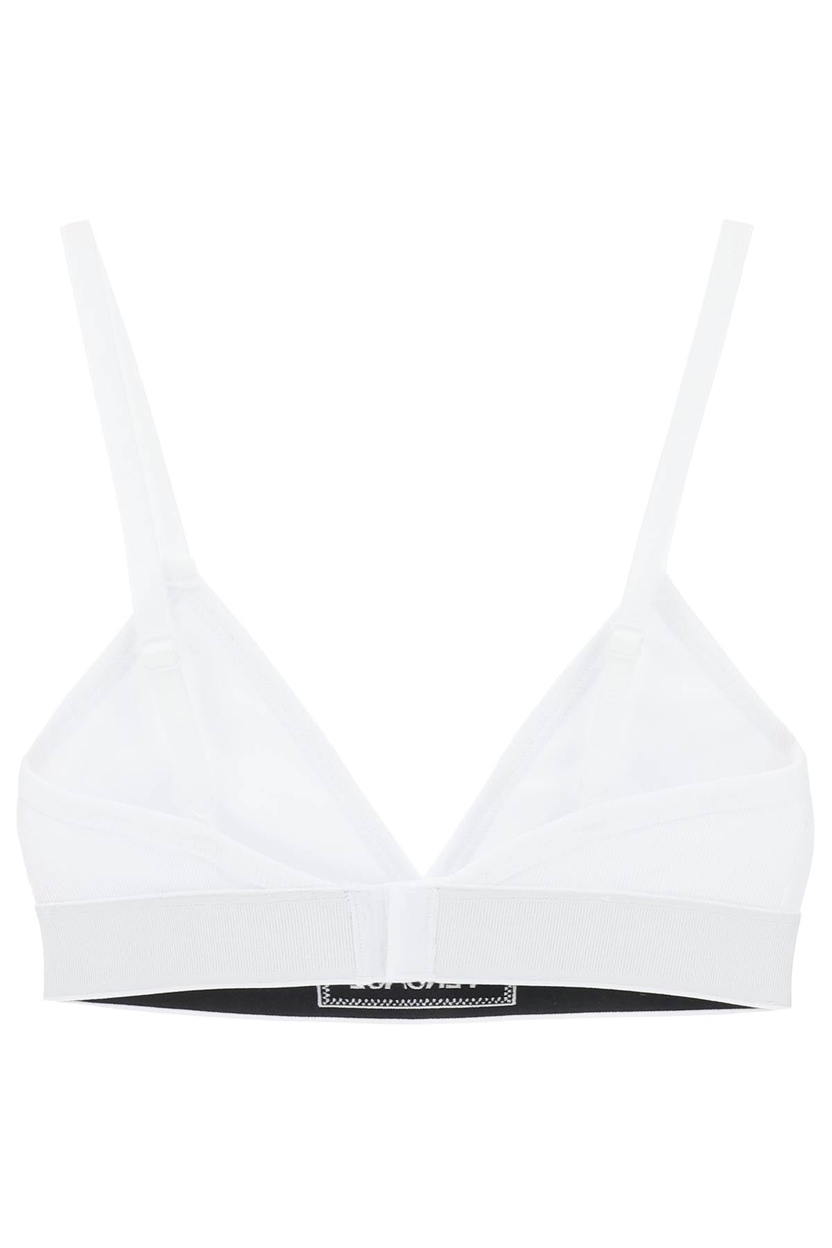 This Versace triangle bralette is made of ribbed stretch cotton and features a '90s Vintage embroidered logo on the front. It has thin straps and a back zip closure. The item in the photo corresponds to size 2.