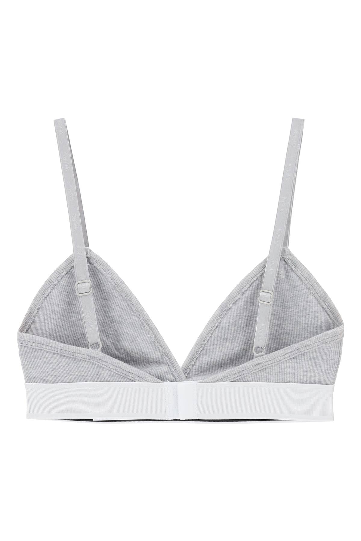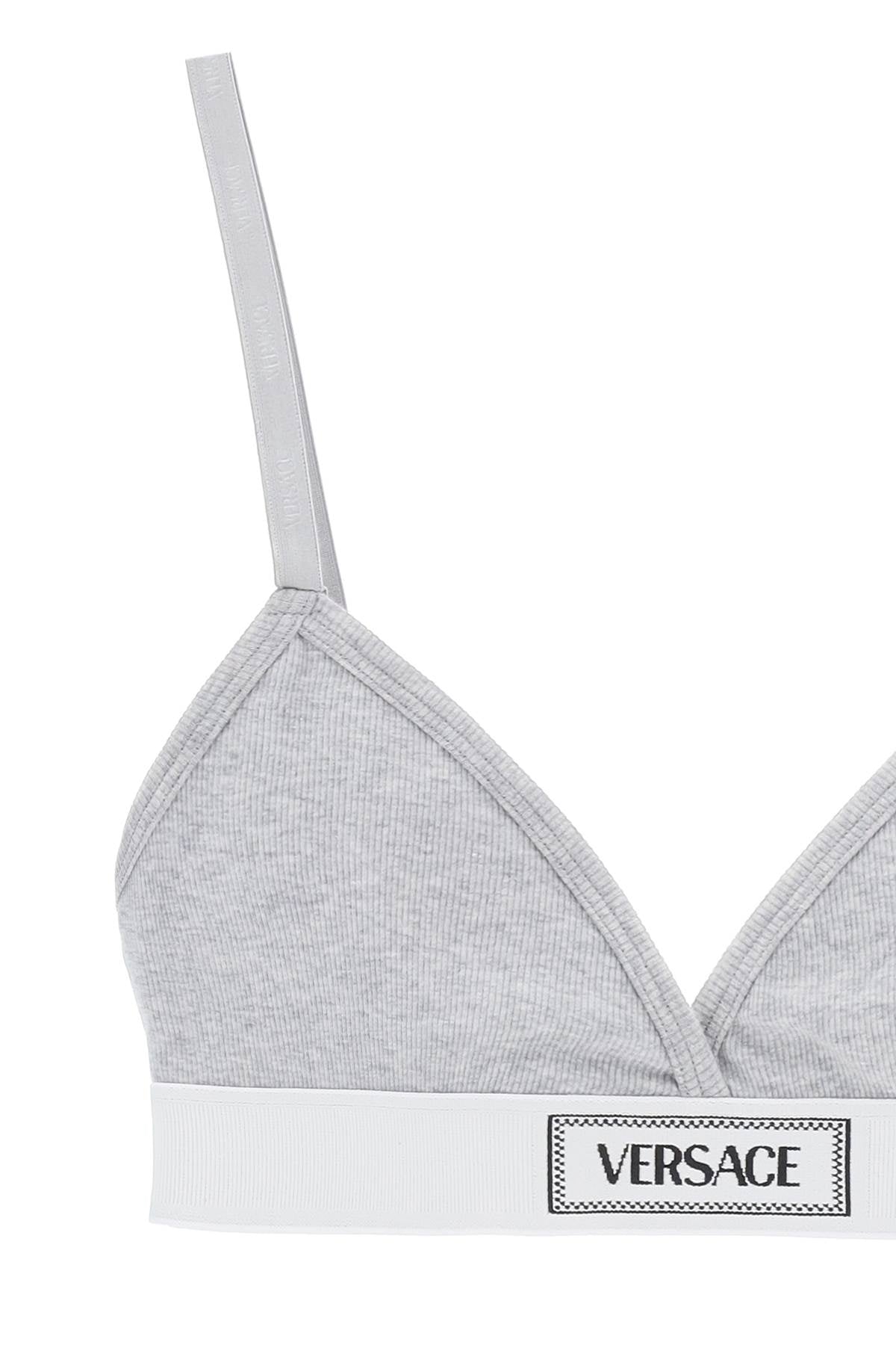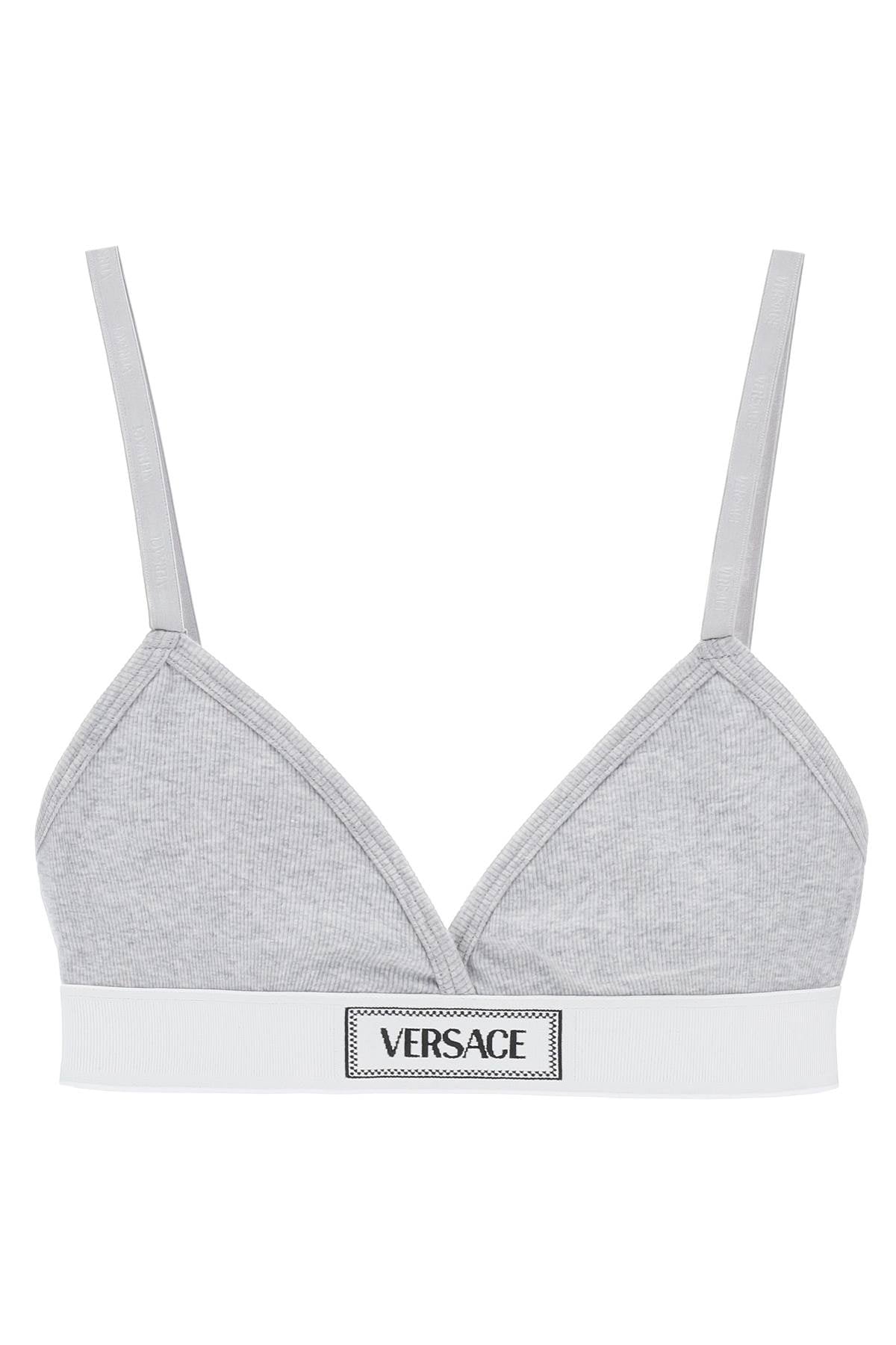 This Versace triangle bralette is made of ribbed stretch cotton and features the '90s Vintage embroidered logo on the front. It has thin straps and a back zip closure. The item in the photo corresponds to size 2.