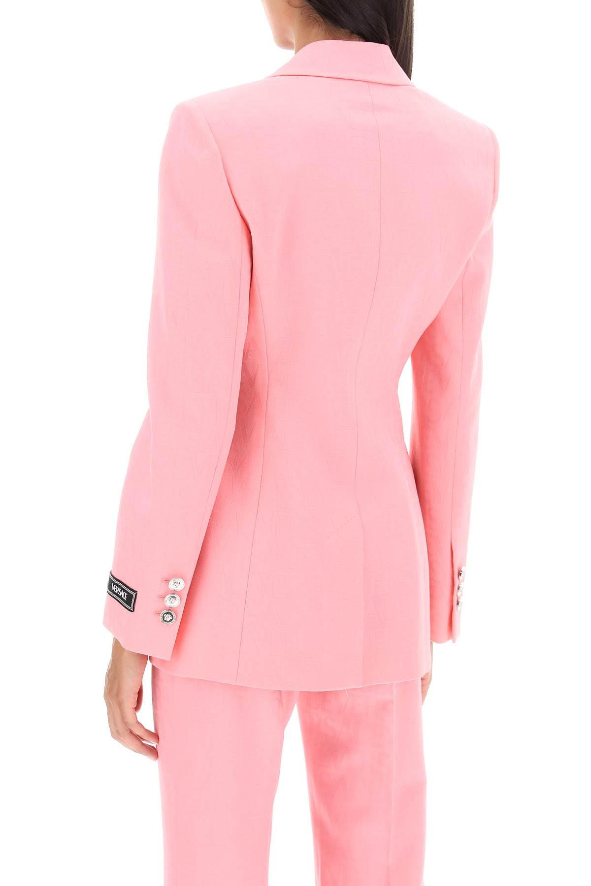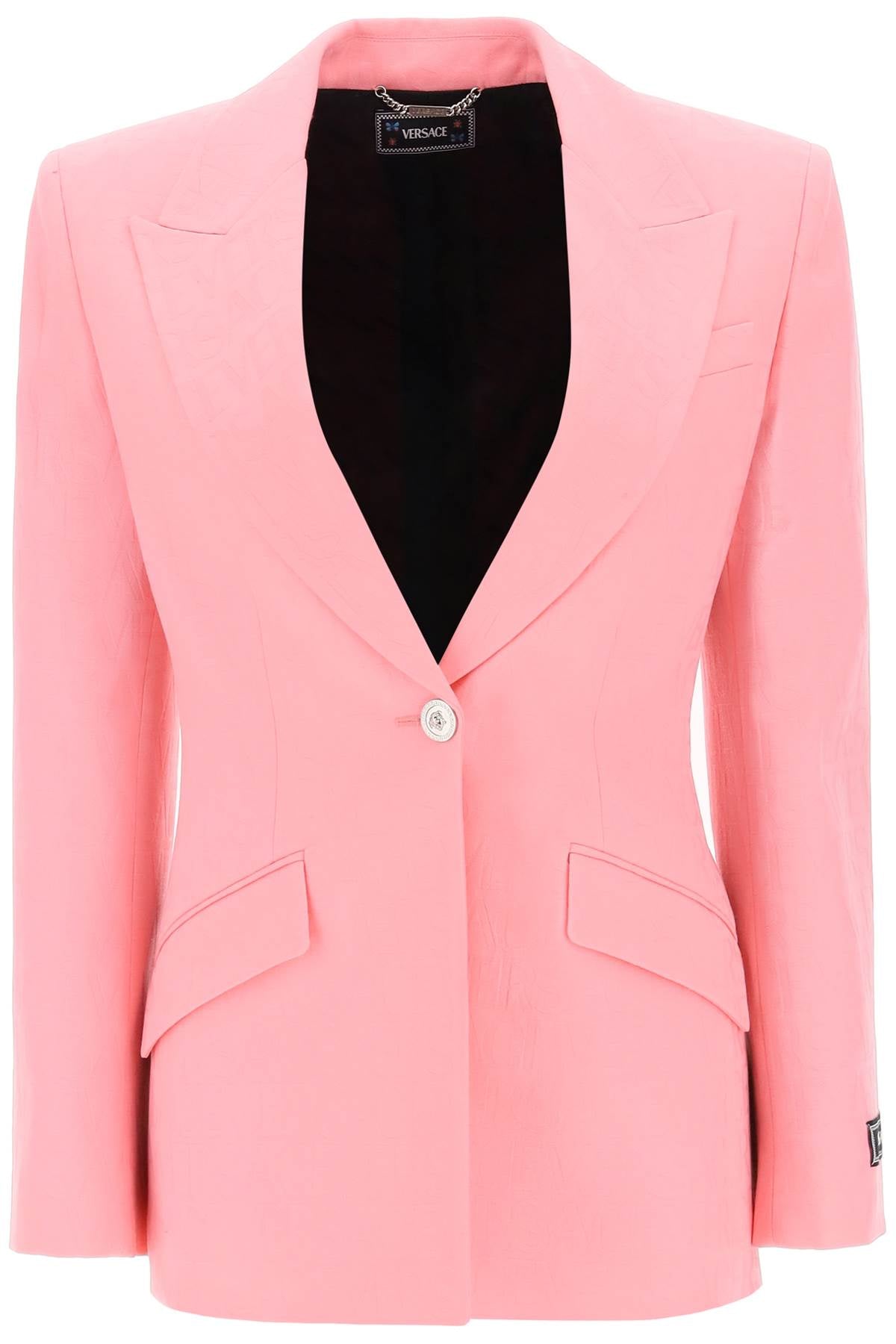 Versace jacket crafted in light virgin wool twill with Versace Allover jacquard pattern and single-breasted design with silver-tone Medusa button closure. Fitted silhouette style enhanced by padded shoulders featuring peak lapel, a chest welt pocket, jetted pockets with flap and rear center vent. Lined in cupro with Greca motif on the inside. The model is 177 cm tall and wears size IT 40.