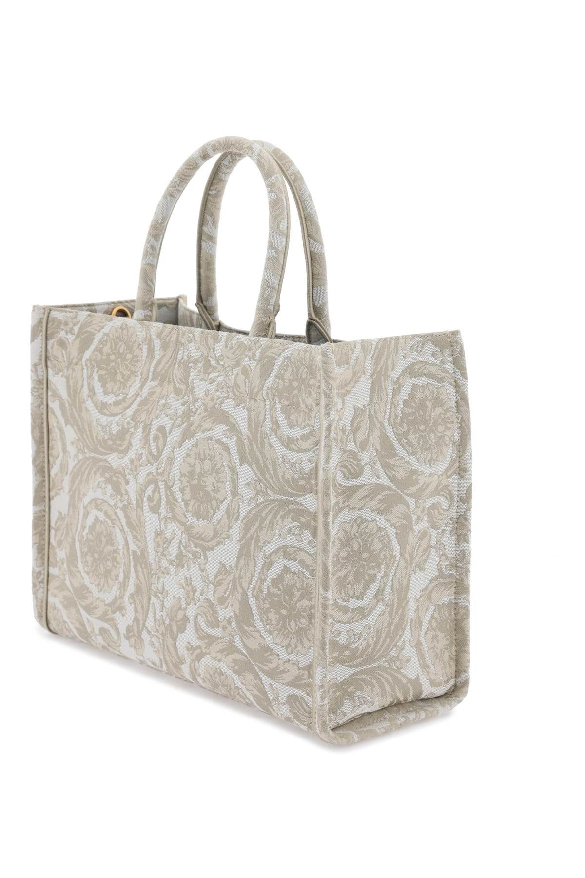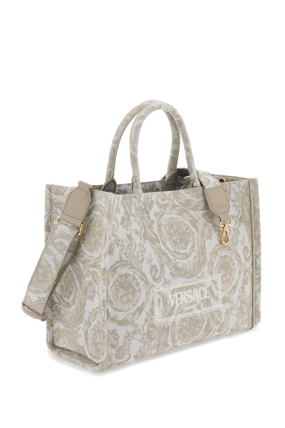 Athena Barocco tote bag by Versace made of jacquard Barocco cotton-blend canvas with contrasting '90s Vintage Logo embroidery. Double handles, lined interior with one zippered pocket and adjustable, detachable shoulder strap. Gold-finished metalware. Size and Fit - Bag Length = 38,5 cm, Bag Height = 30 cm, Bag Weight = 14 cm, Handle Height = 15 cm,
