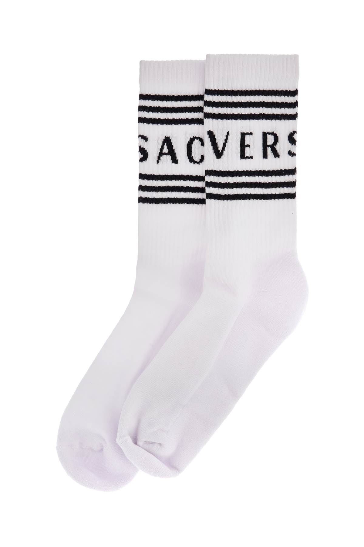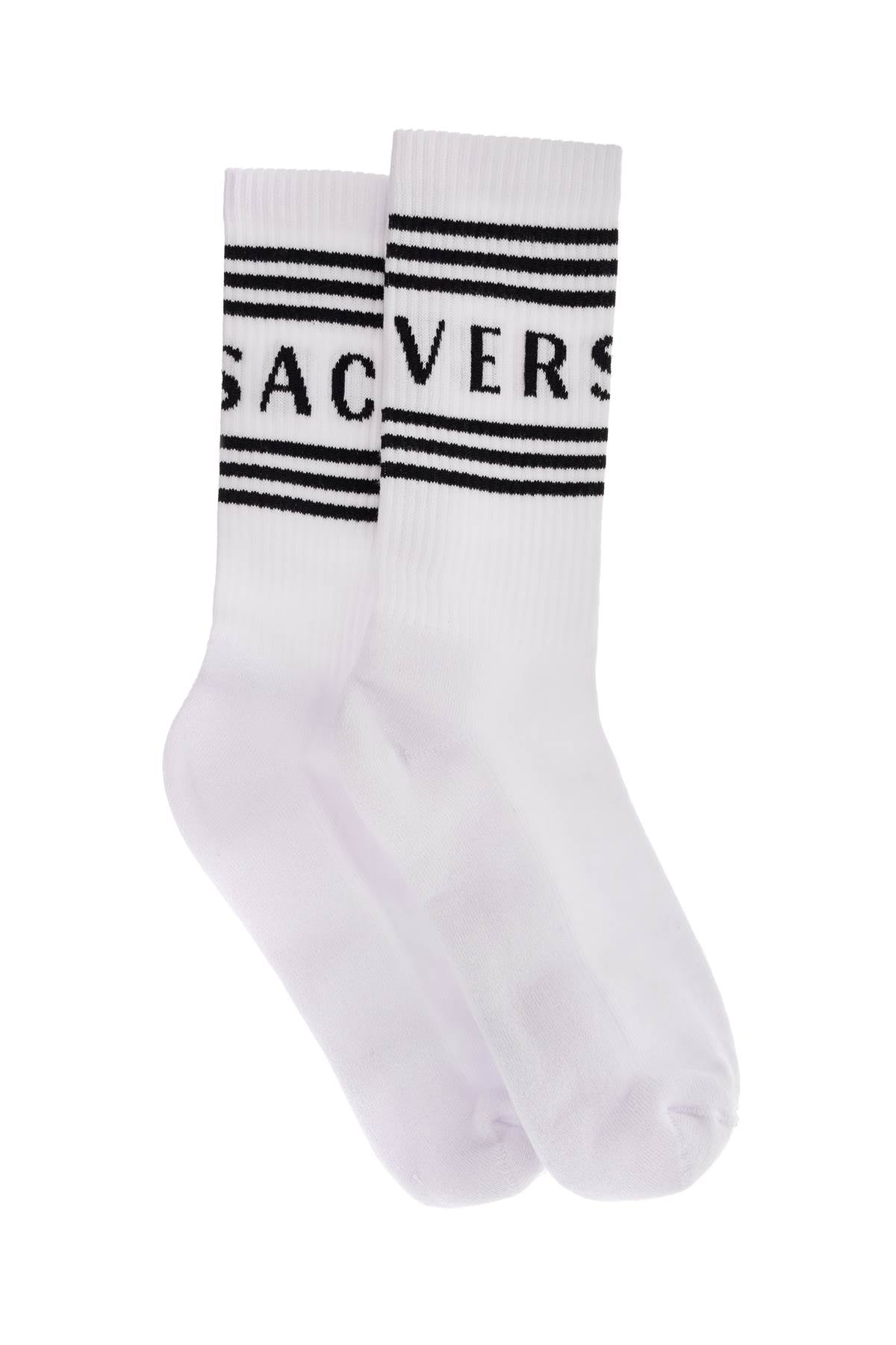 Versace socks made of stretch cotton jersey, decorated with contrasting logo lettering on the ribbed cuff and finished with a padded sole. The photographed item is a size M.