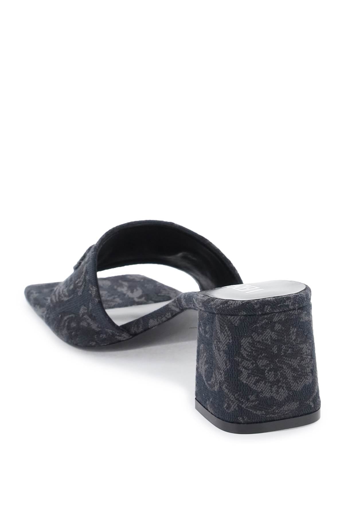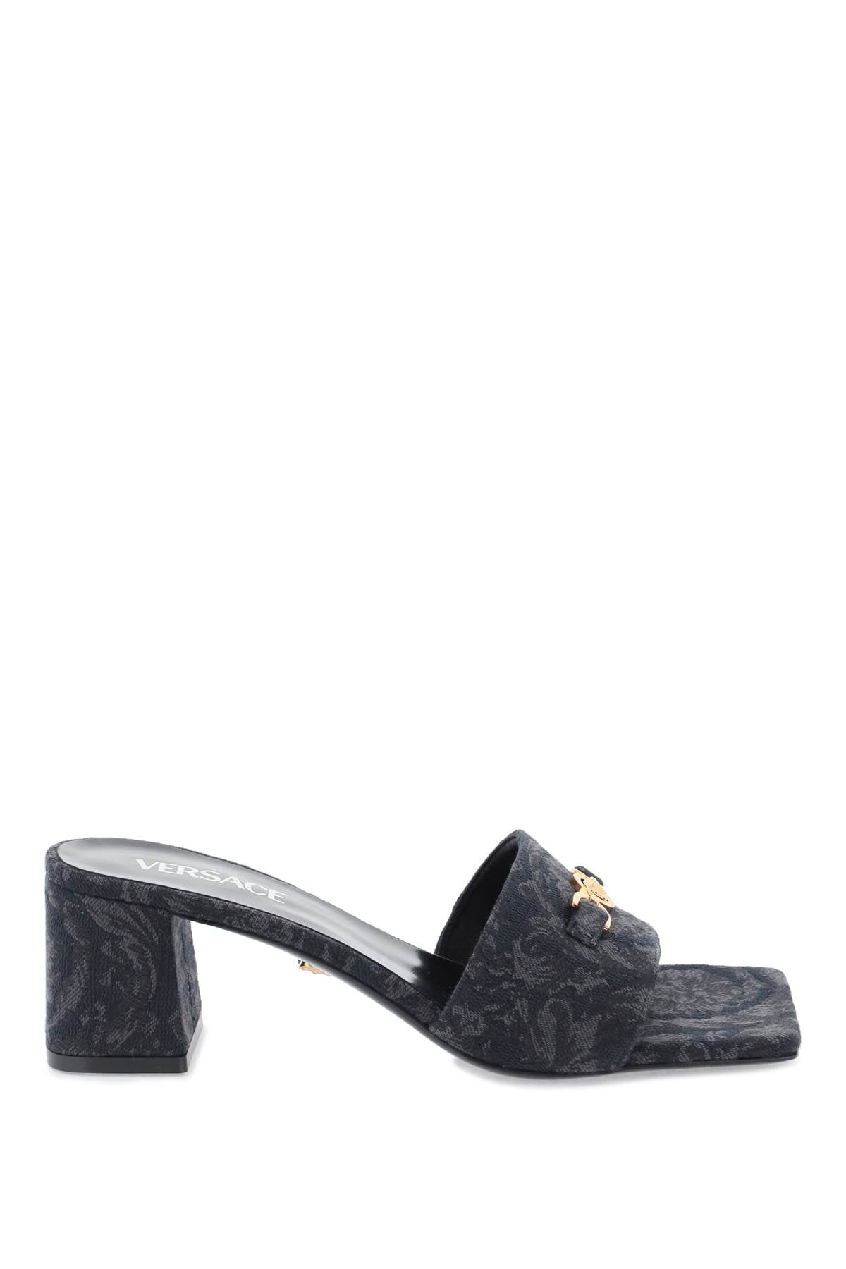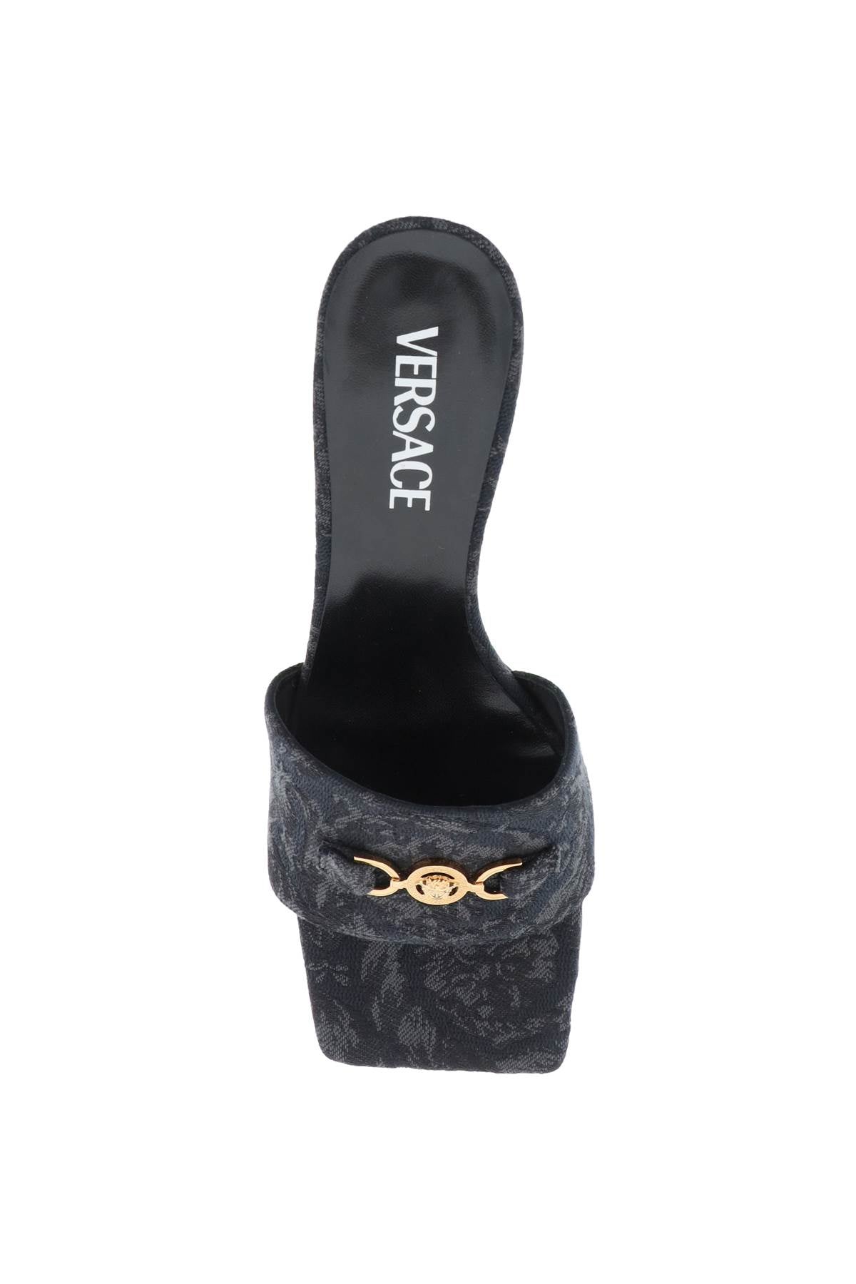 Versace mules made of jacquard fabric with Barocco print and embellished with the iconic gold metal Medusa '95 detail. Leather footbed, block heel and leather sole. Size and Fit - Heel Height = 5,5 cm,