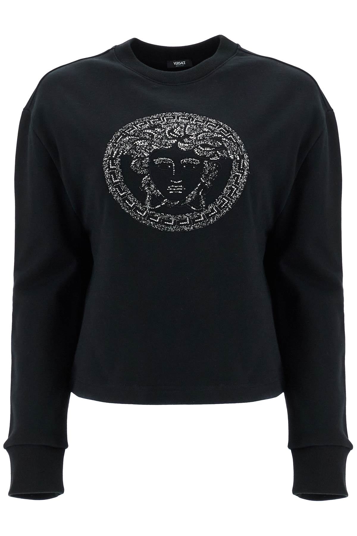 Crafted in a boxy cut with dropped shoulders, this Versace crew neck sweatshirt showcases the iconic Medusa motif embroidered on the front with lurex and rhinestones. The piece is made from pure cotton brushed jersey with ribbed collar and cuffs. The model is 177 cm tall and wears size IT 38.