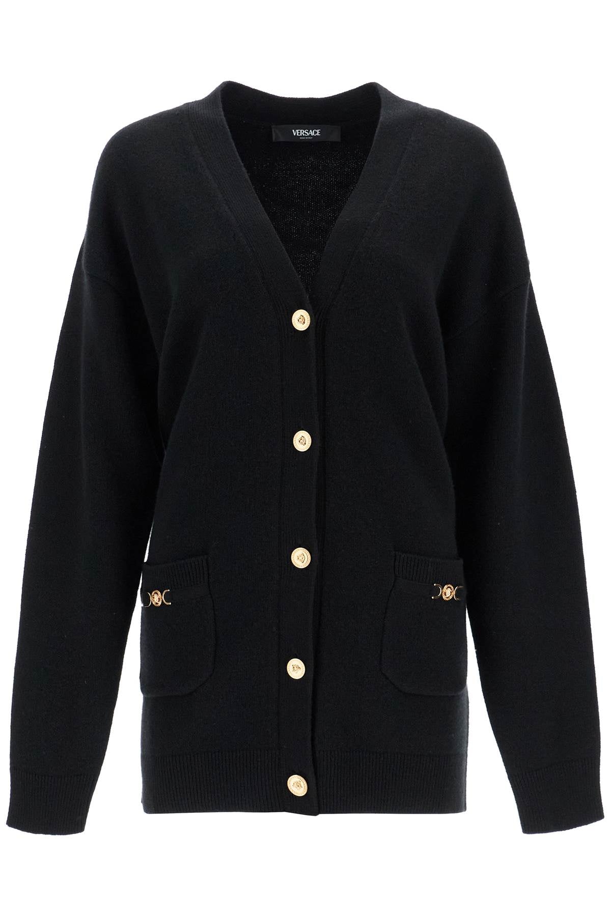 Versace's boxy fit cardigan, made of a blend of wool and cashmere, features Medusa '95 decorations on the pockets. It has a V-neckline, button closure with Medusa buttons, and ribbed edges. The model is 177 cm tall and wears an Italian size 40.