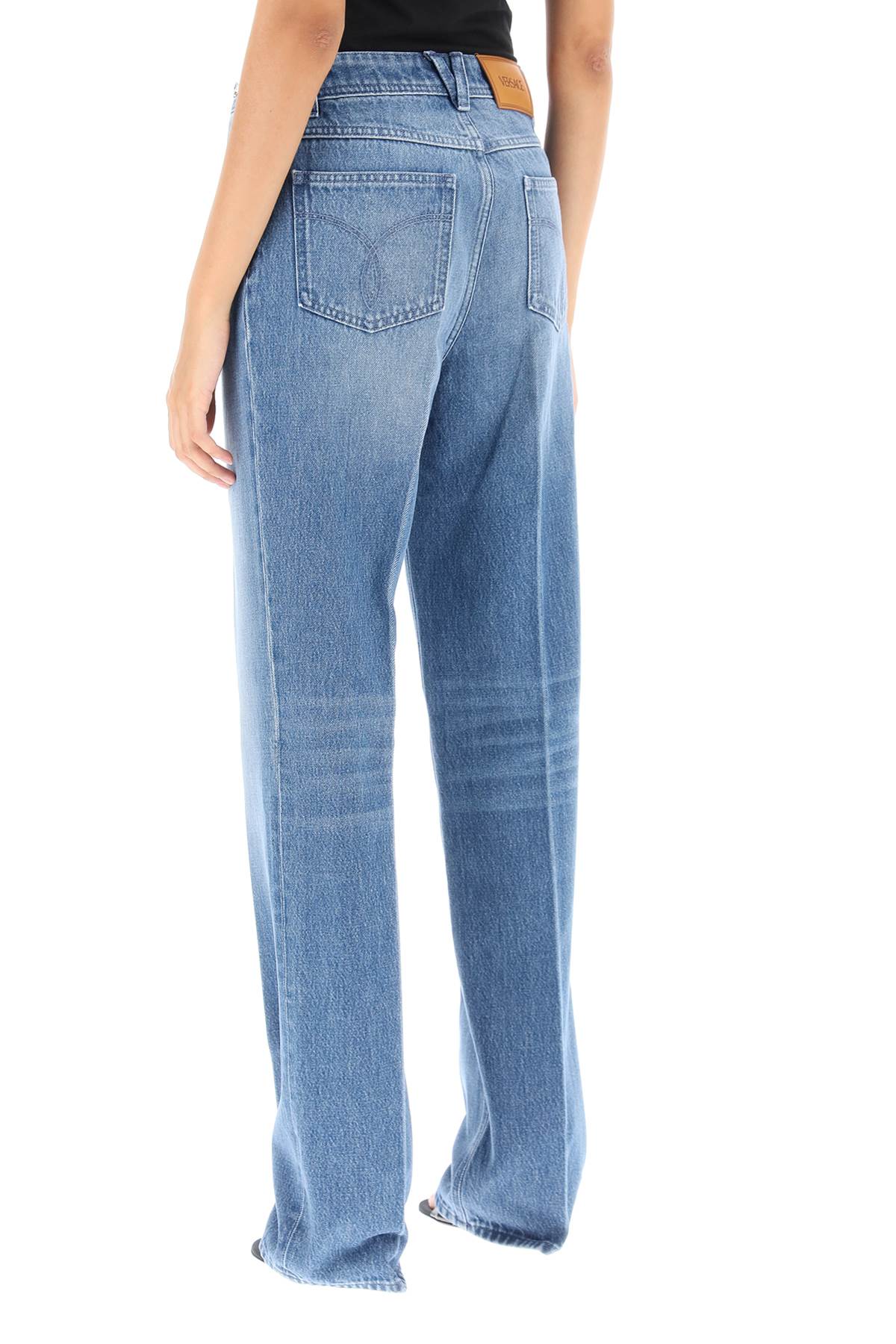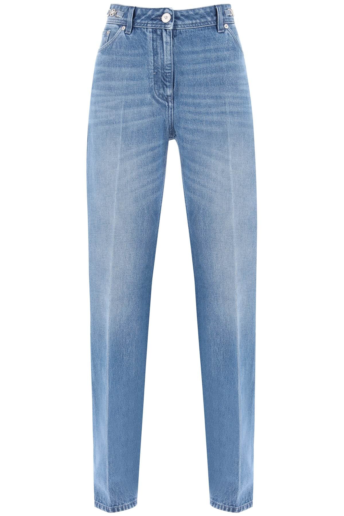 Versace five-pocket jeans cut from mid-wash denim to a boyfriend fit with straight leg and medium waist. Finished with belt loops and a zip fly with Medusa button, this style is enhanced by a tailored crease and Medusa '95 embellishments on the waistband. The model is 177 cm tall and wears a size 26.