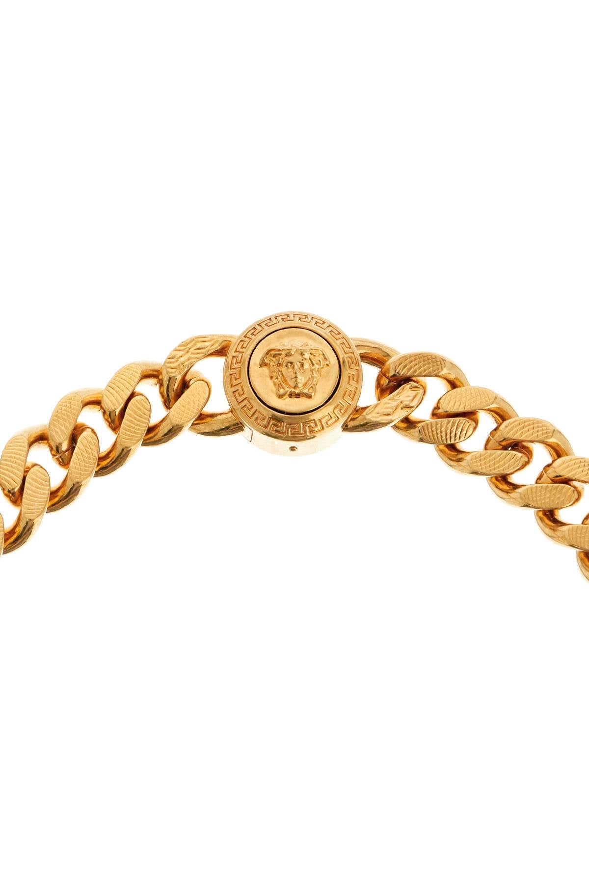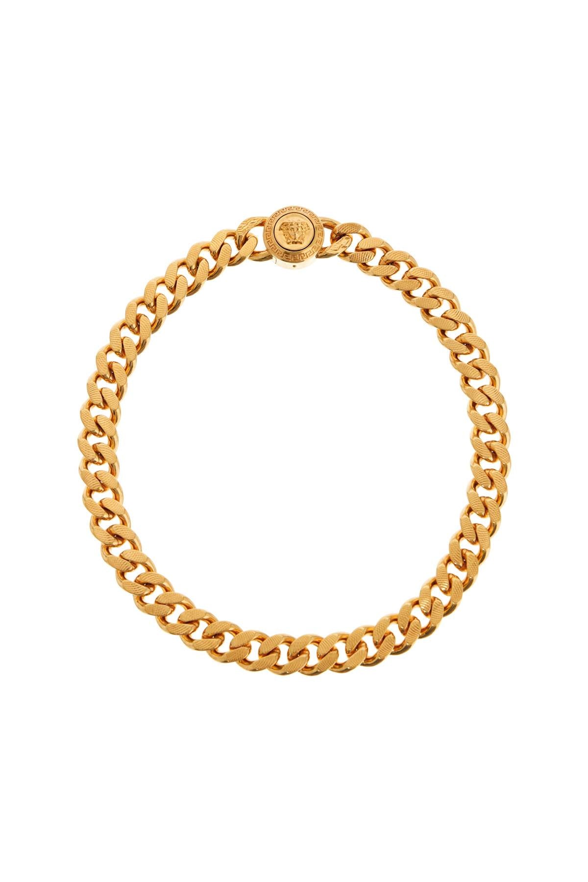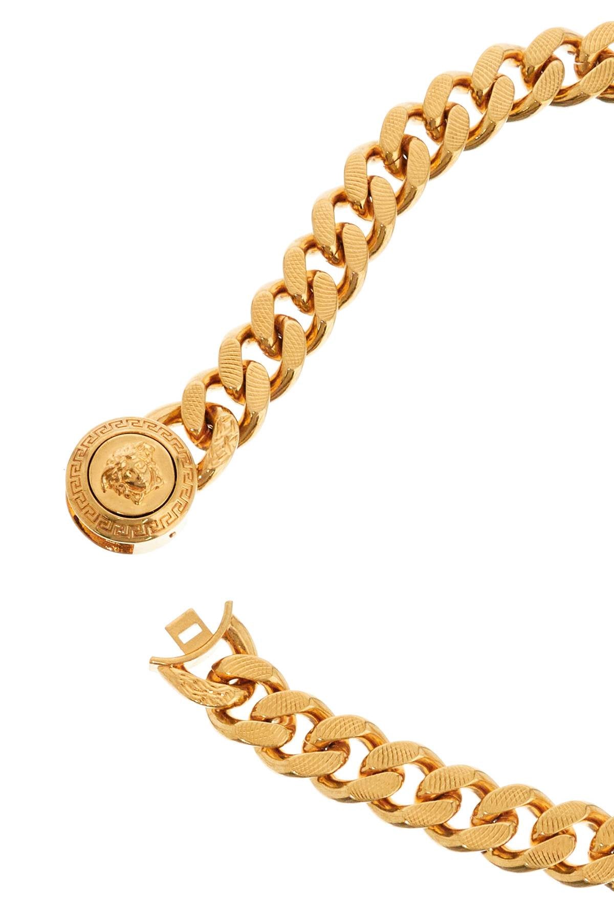 Versace Tribute Gold-finished metal chain necklace, enriched by guilloché engraving on the chain and a snap closure with the iconic Medusa and Greek Key embellishments, logo engraved on the back. Lead and nickel free. One size fits all. Size and Fit - Accessory Length = 43,5 cm,