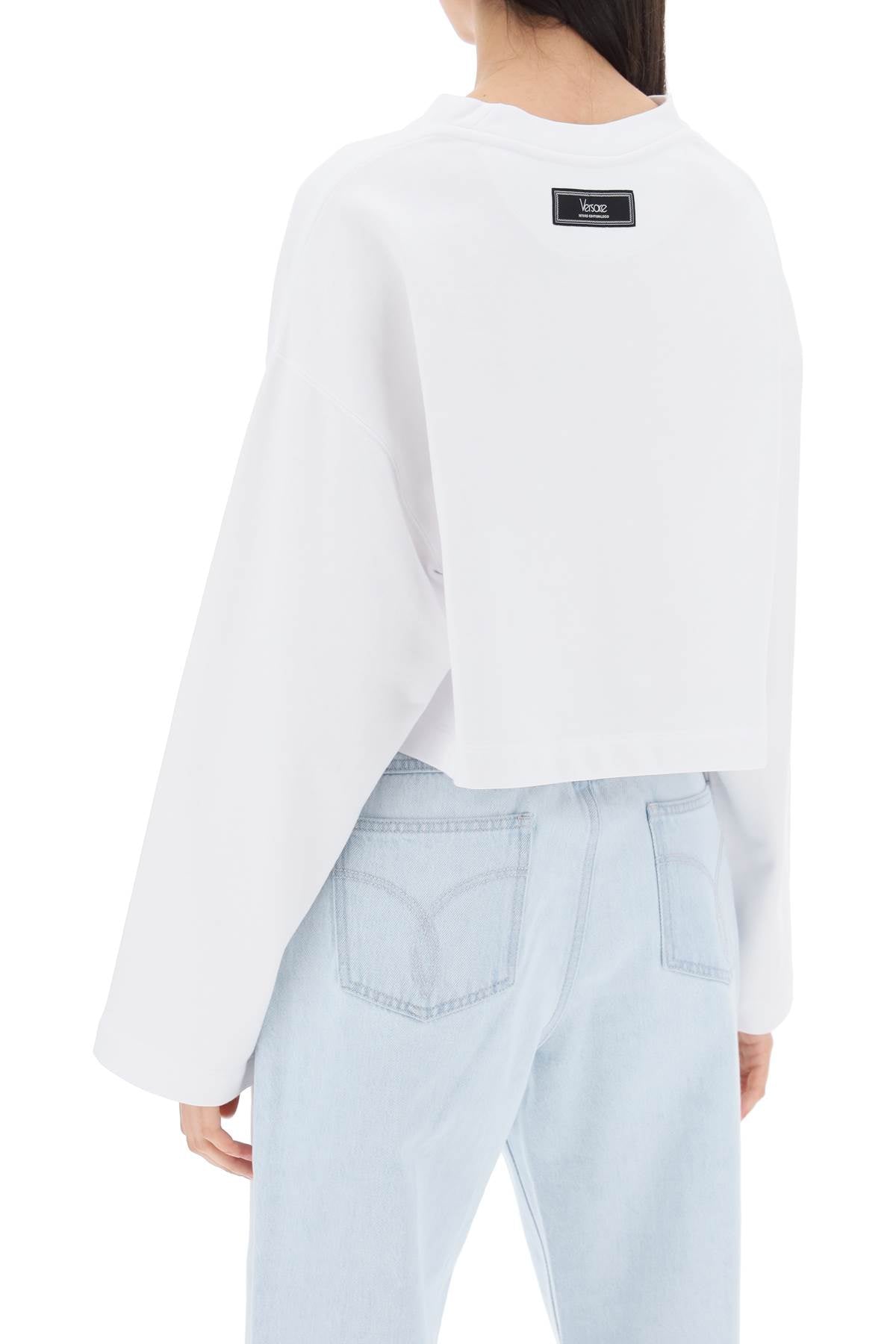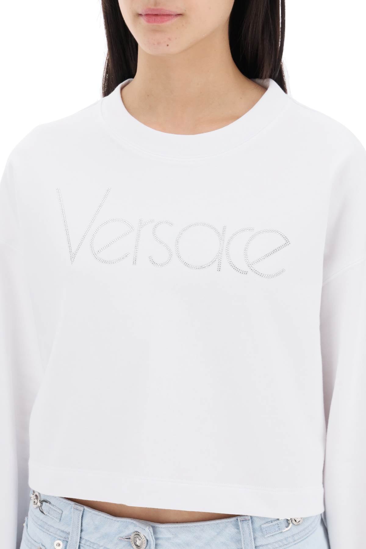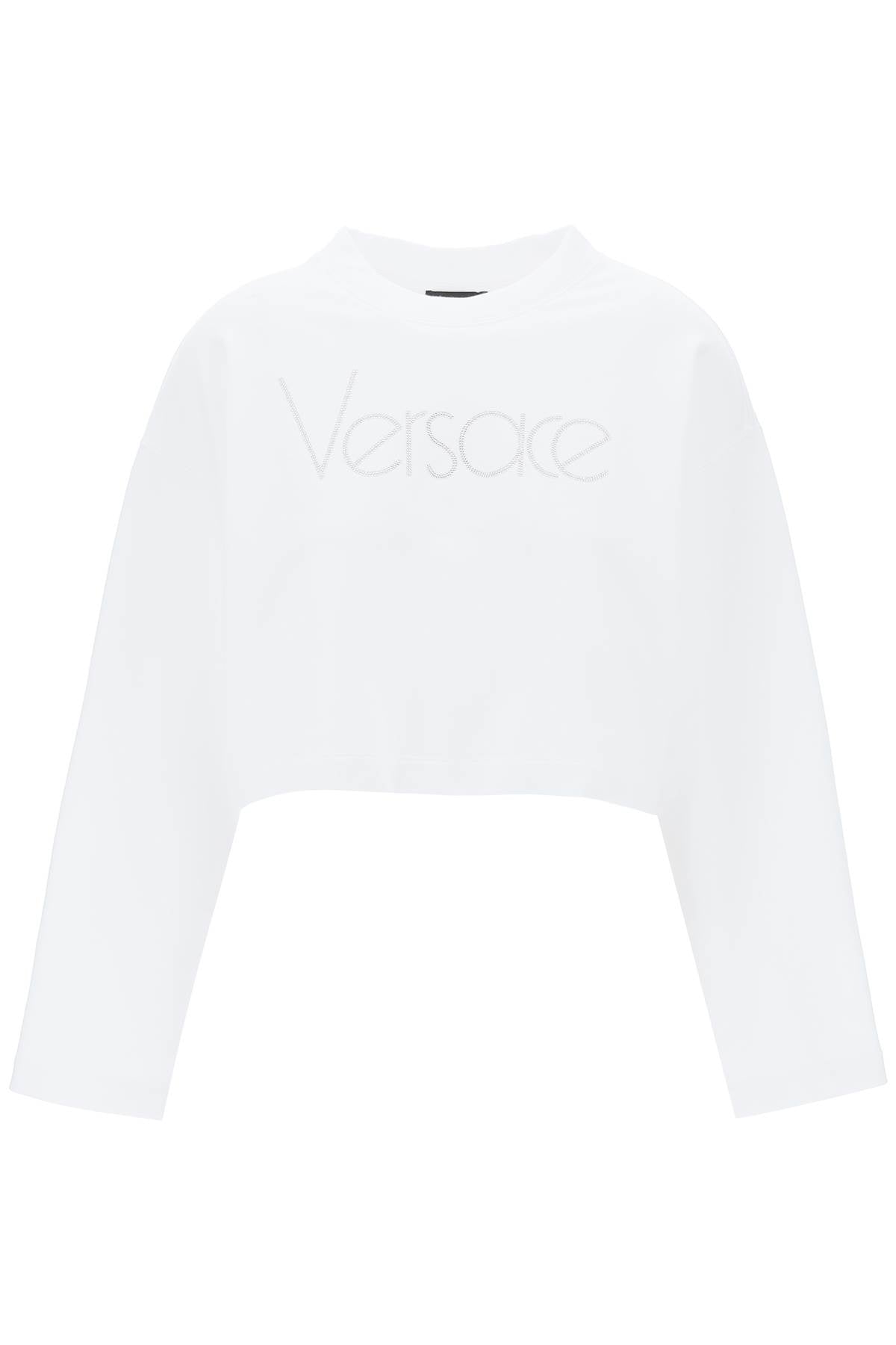 Versace crewneck sweatshirt made of brushed cotton jersey embellished with 1978 Re-Edition rhinestone logo on the chest. Signed with a branded label on the back of the neck and featuring an oversized fit with cropped cut and dropped shoulders. The model is 177 cm tall and wears an IT size 38.