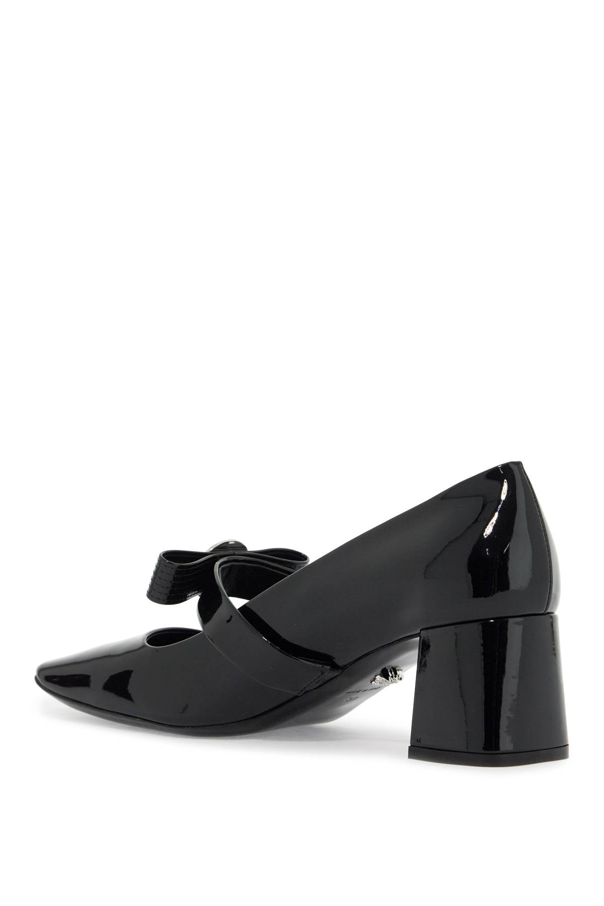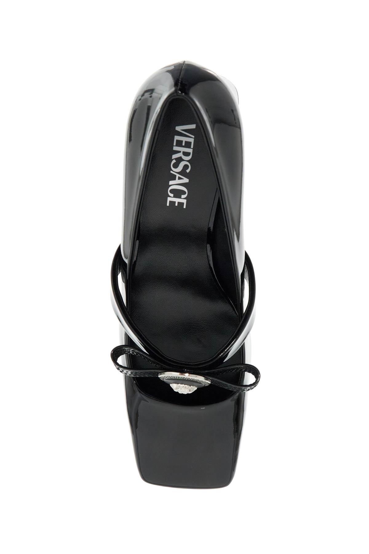 Versace patent leather pumps featuring a square toe, covered block heel and decorative "Gianni ribbon" bow on the strap. Leather lining and insole with a leather sole. Size and Fit - Heel Height = 6 cm,
