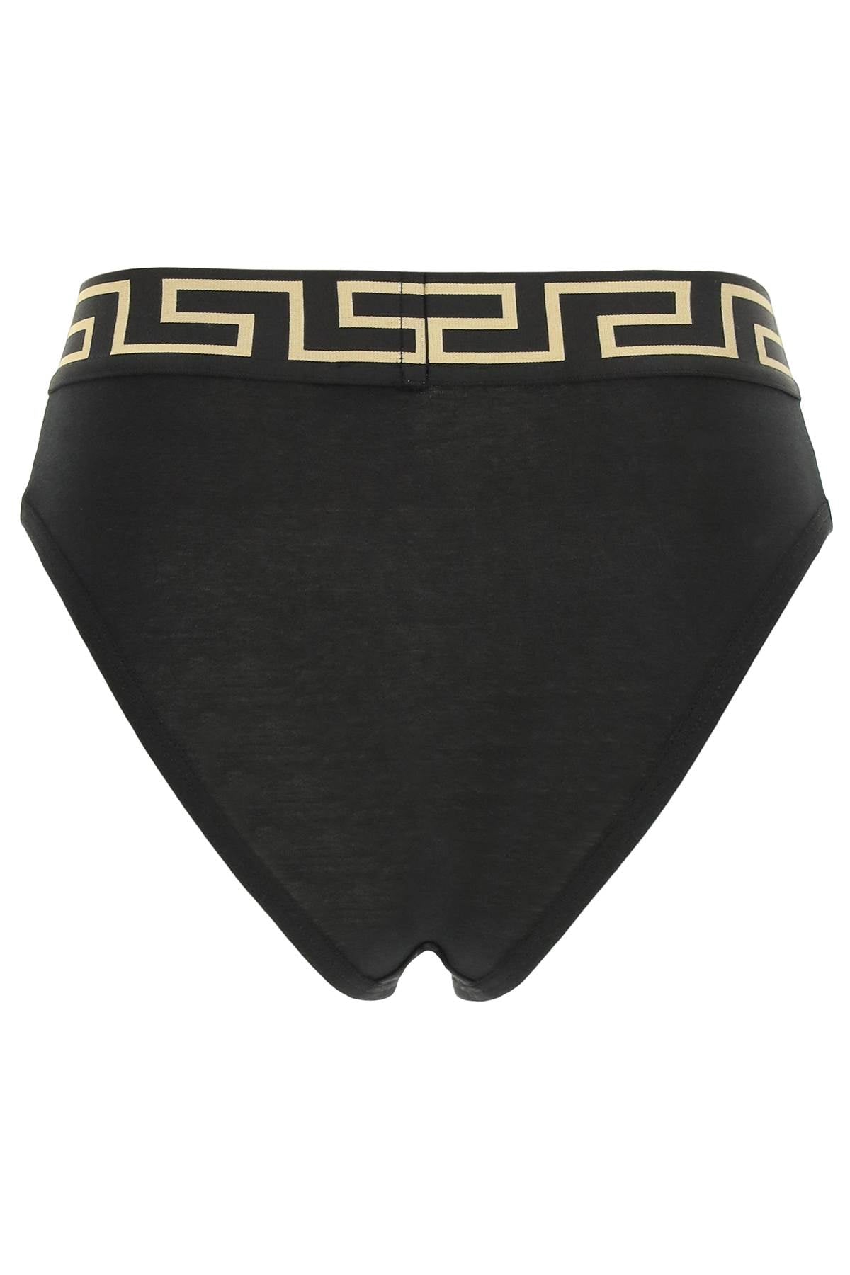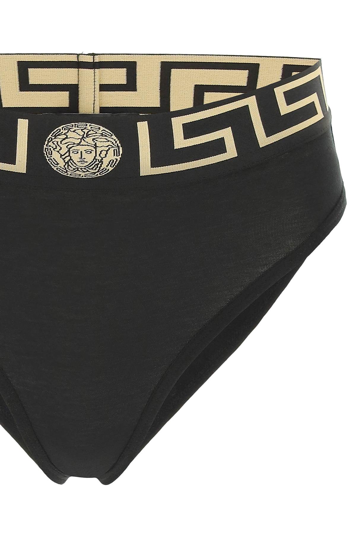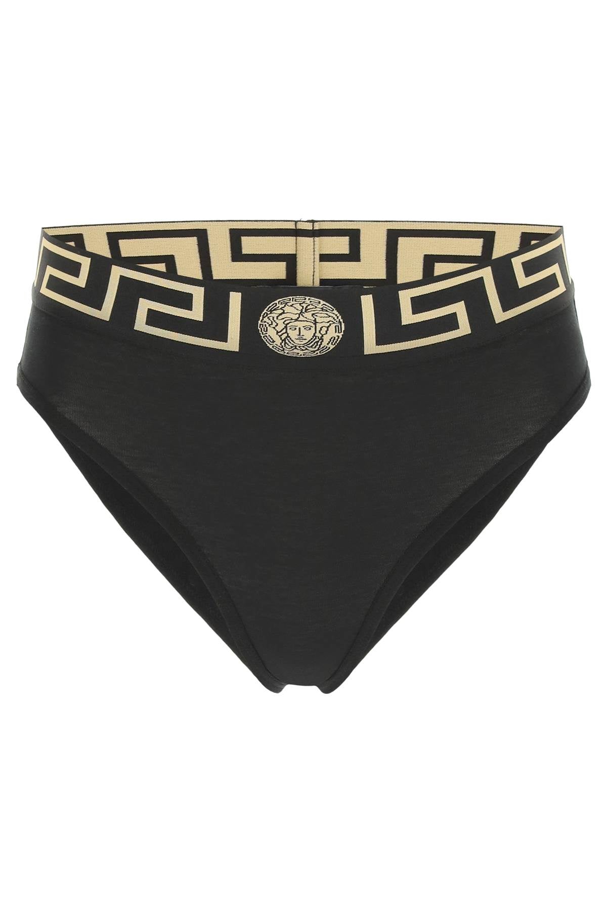 Elevate your lingerie collection with this high-waisted VERSACE slip, made from stretch cotton. The elasticated waistband is embellished with a Greek key design and the iconic Medusa head in jacquard. Comfortable yet stylish, this slip is perfect for everyday wear or special occasions. Embrace the luxurious Italian craftsmanship and add a touch of elegance to your wardrobe with this must-have piece from VERSACE.