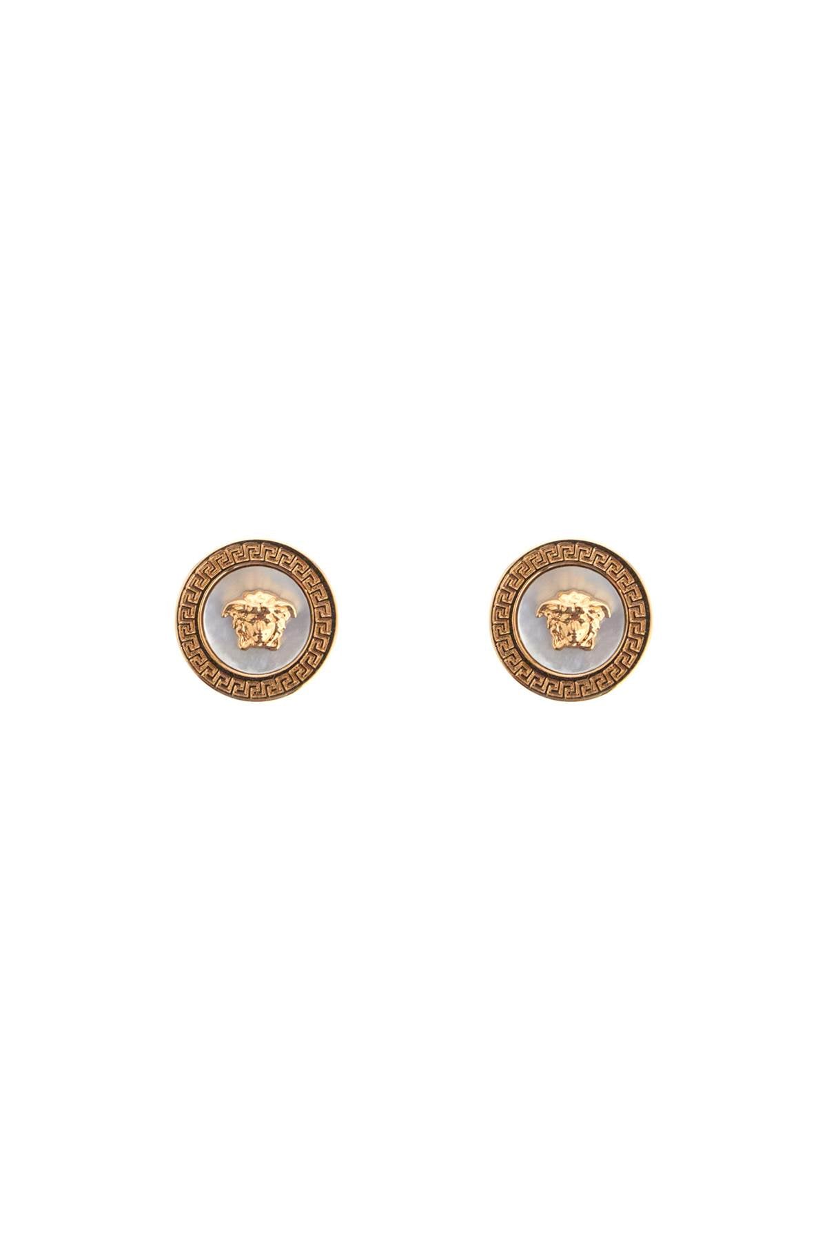 Versace button earrings in gold-finished metal, adorned with a central Medusa set on a mother-of-pearl base and framed by Greek engraving. Lead and nickel-free, with butterfly closure.