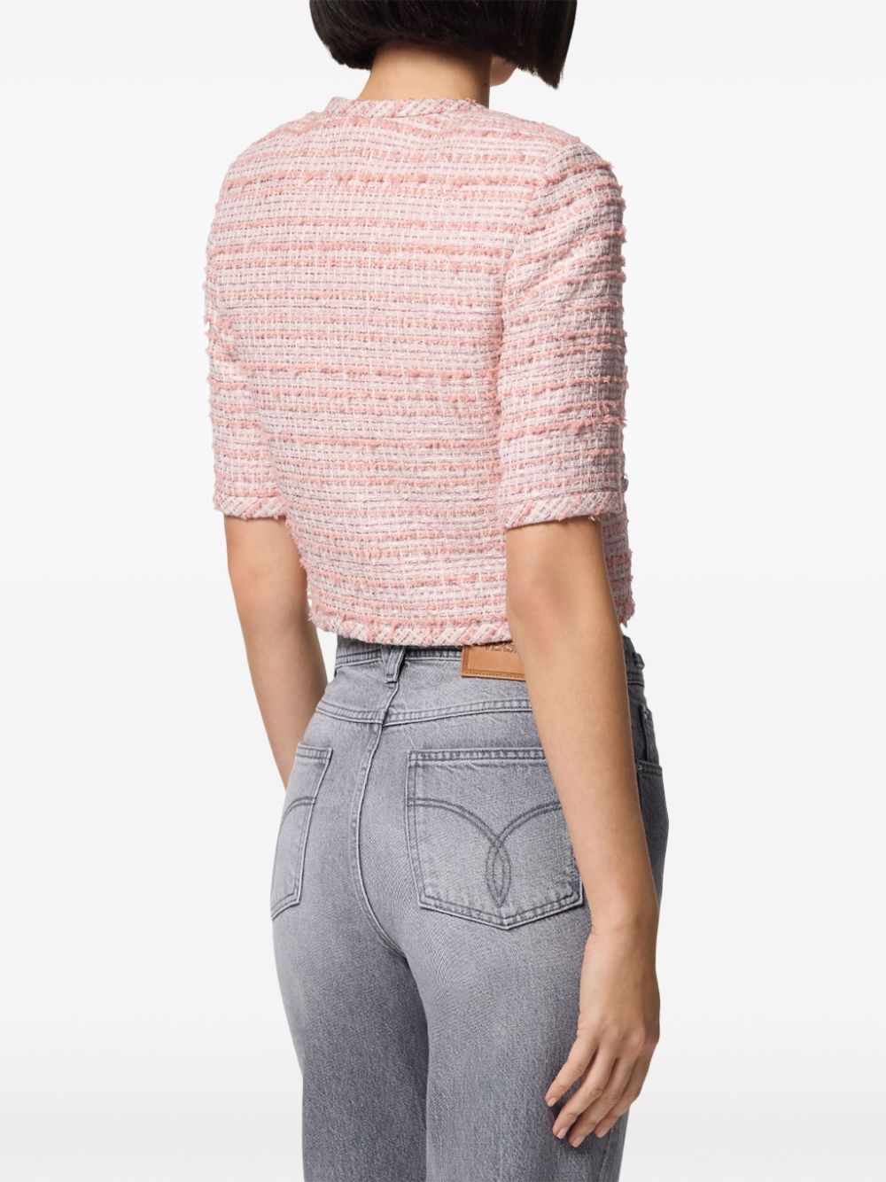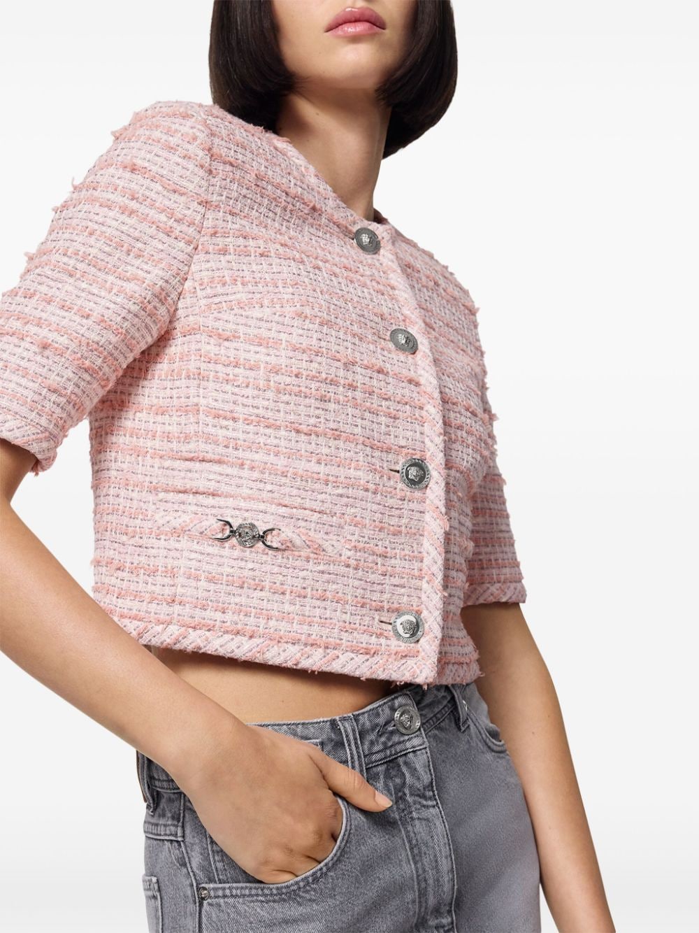 light pink tweed mélange effect Medusa plaque detail silver-tone hardware round neck front button fastening short sleeves cropped straight hem Size and Fit - This piece fits true to size. We recommend you get your regular size. Model is 1,75m / 5ft 8in wearing size 40 (IT)