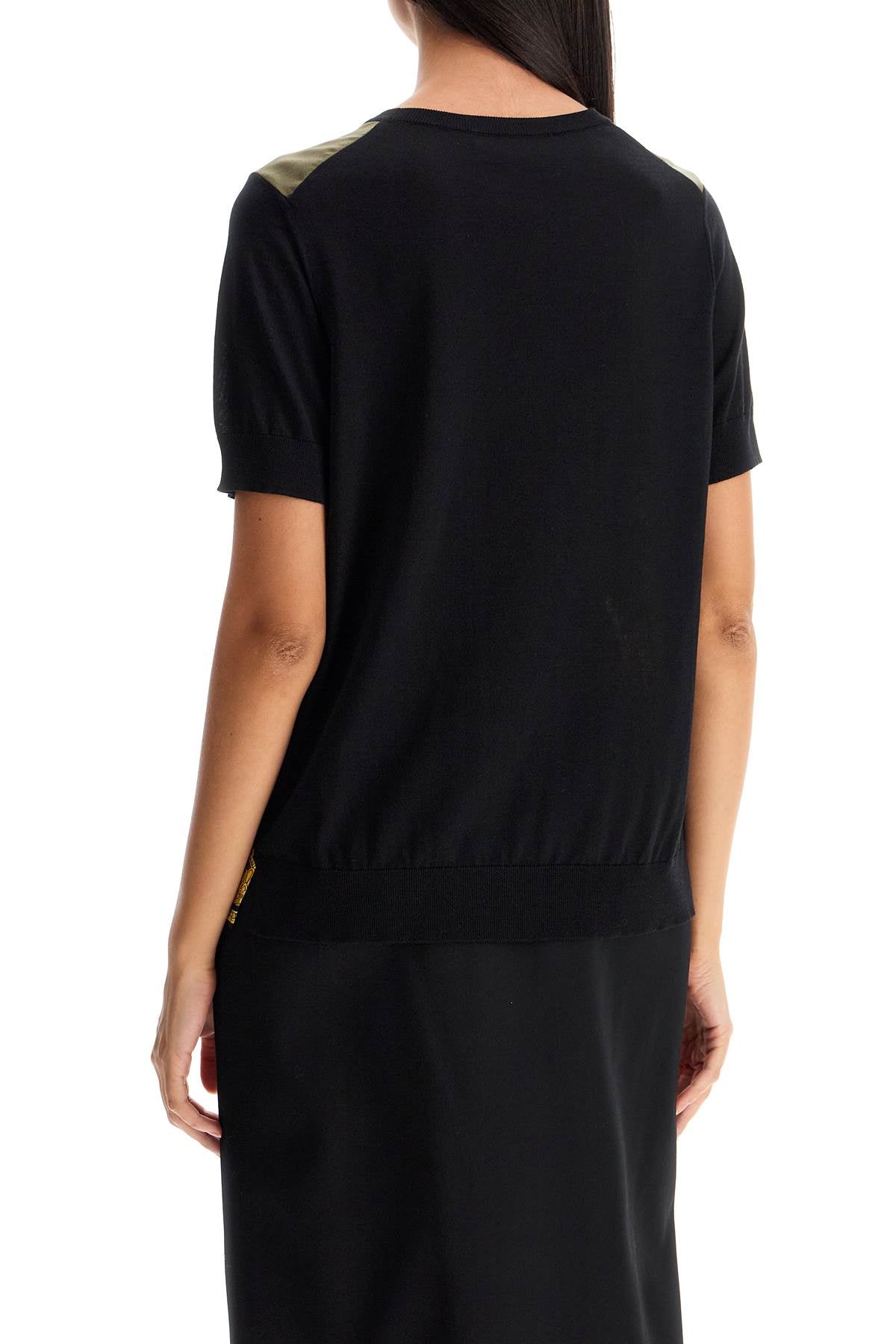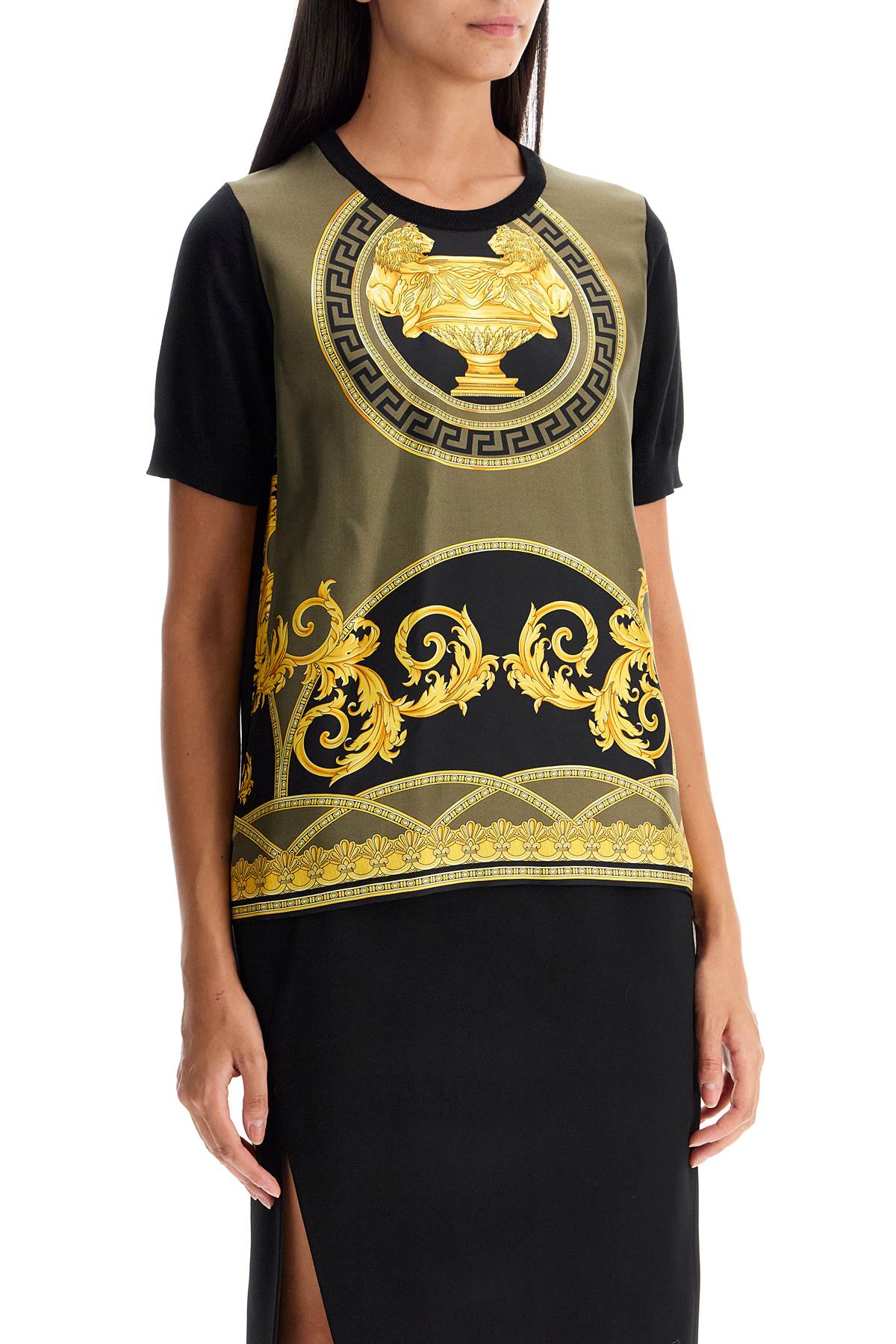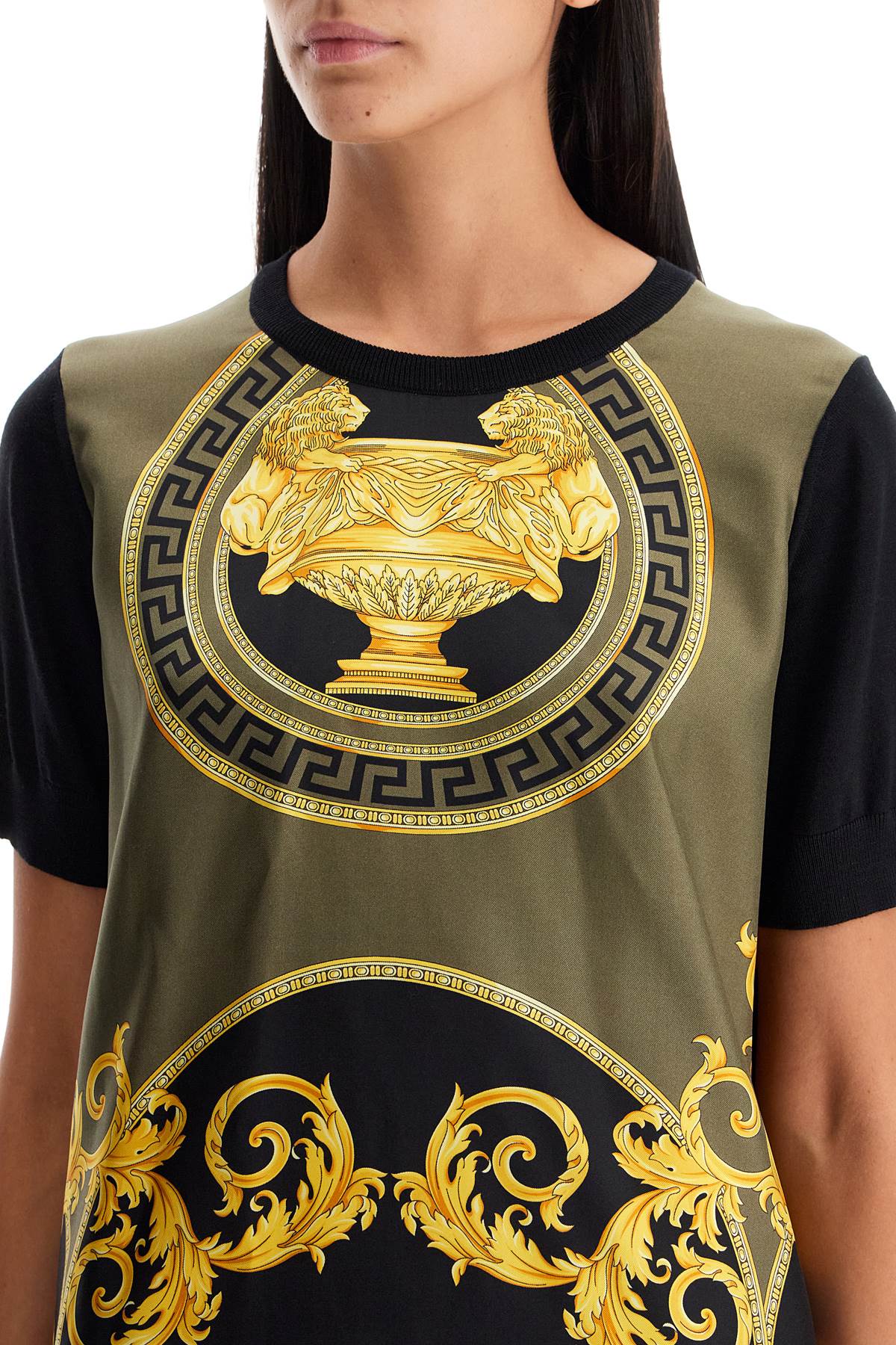 This Versace crew neck t-shirt is made of lightweight pure virgin wool with a front panel in silk twill featuring the 'La Coupe des Dieux' print. It has a regular fit and the model is 177 cm tall, wearing an IT size 40.