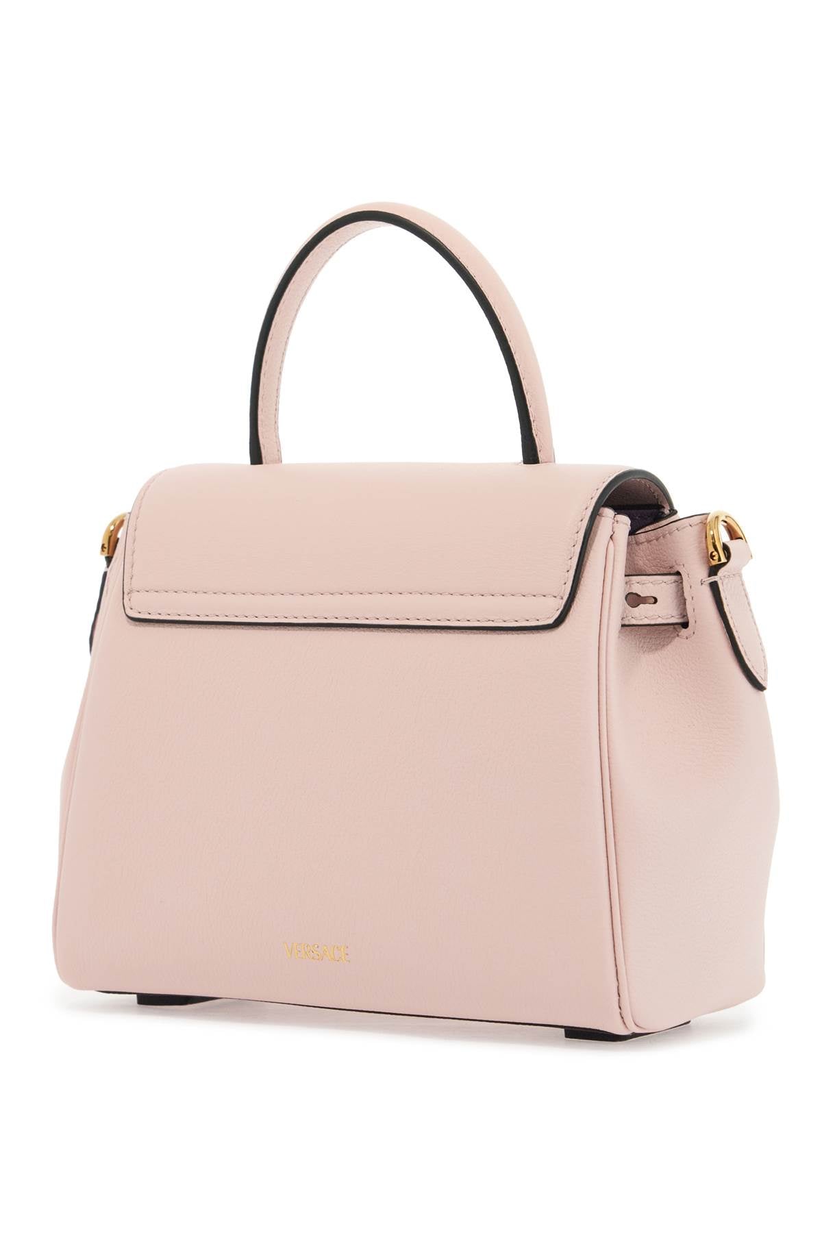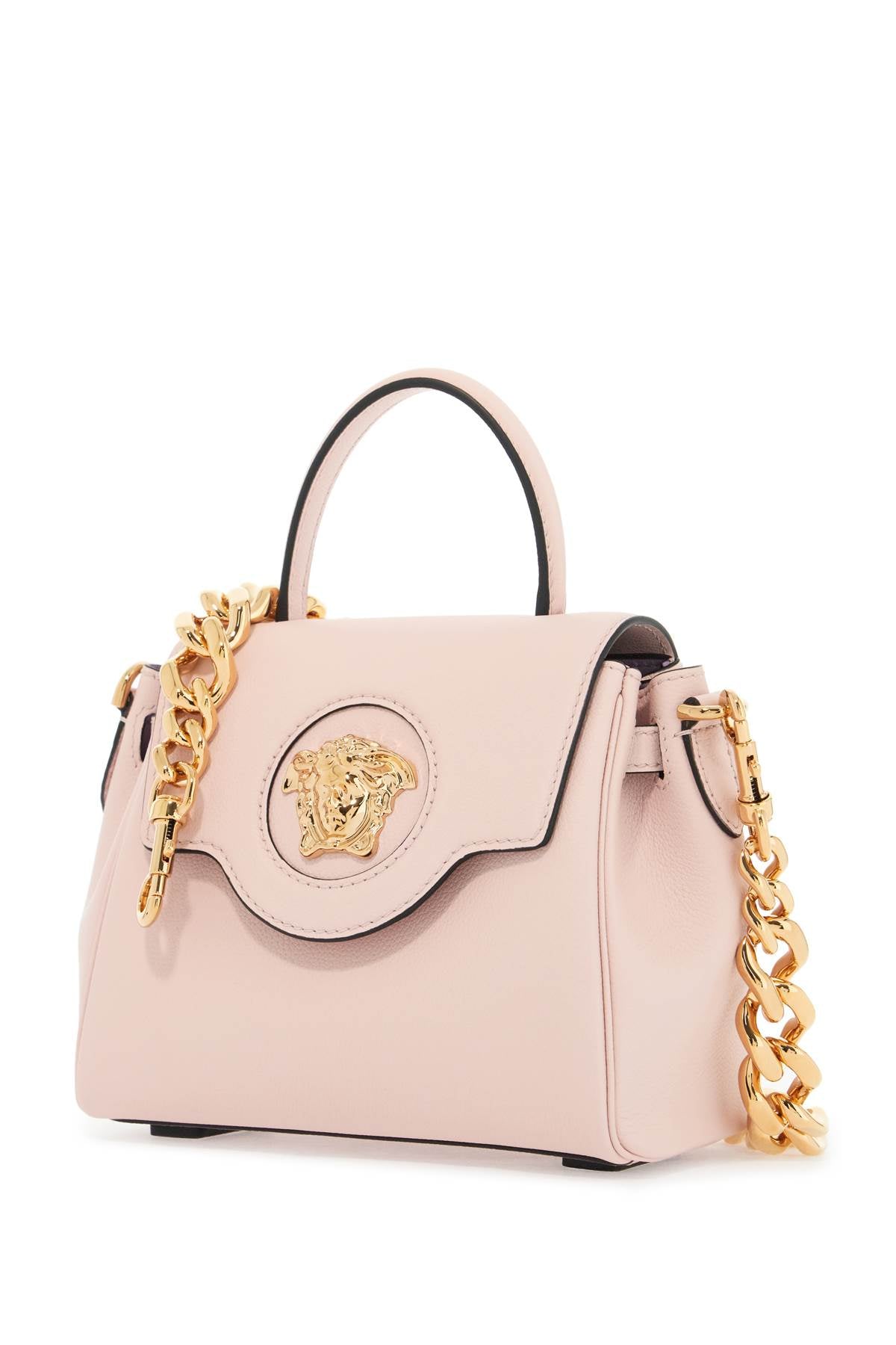 La Medusa Mini bag by Versace crafted in grained leather, featuring flap with magnetic button closure and the iconic metal Medusa head. Single handle, removable chain shoulder strap and removable and adjustable crossbody shoulder strap in leather. Gold-tone logo lettering print on the back, side straps, contrasting leather interior with an open flat pocket. Versace Gold finished metalware. Size and Fit - Bag Length = 20 cm, Bag Height = 17 cm, Bag Weight = 10 cm, Handle Height = 7 cm,