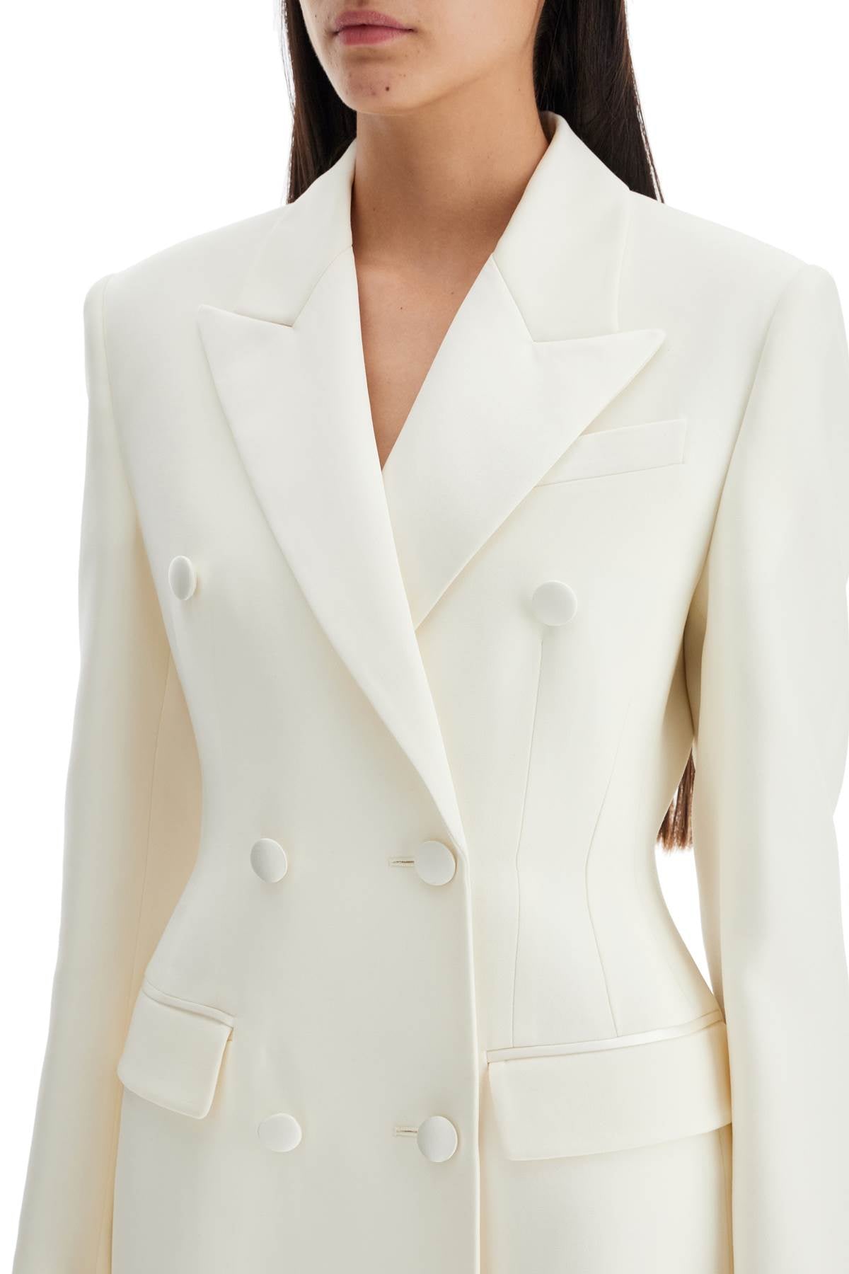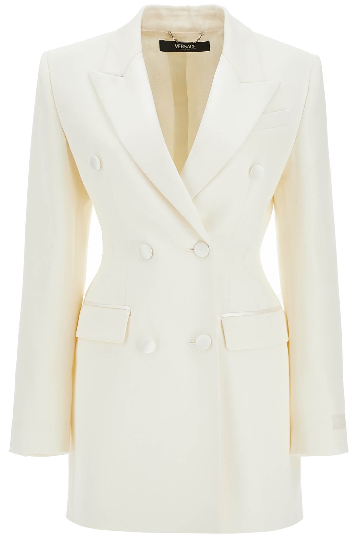 This Versace smoking-style jacket is made of pure virgin wool grain de poudre with tone-on-tone satin finishes. It features a sculpted hourglass silhouette with a length below the hip, making it perfect as a dress as well. The double-breasted design with six buttons is completed by structured shoulders, peak lapels, side pockets with flaps, and a chest pocket. Baroque lining. The model is 177 cm tall and wears size IT 40.