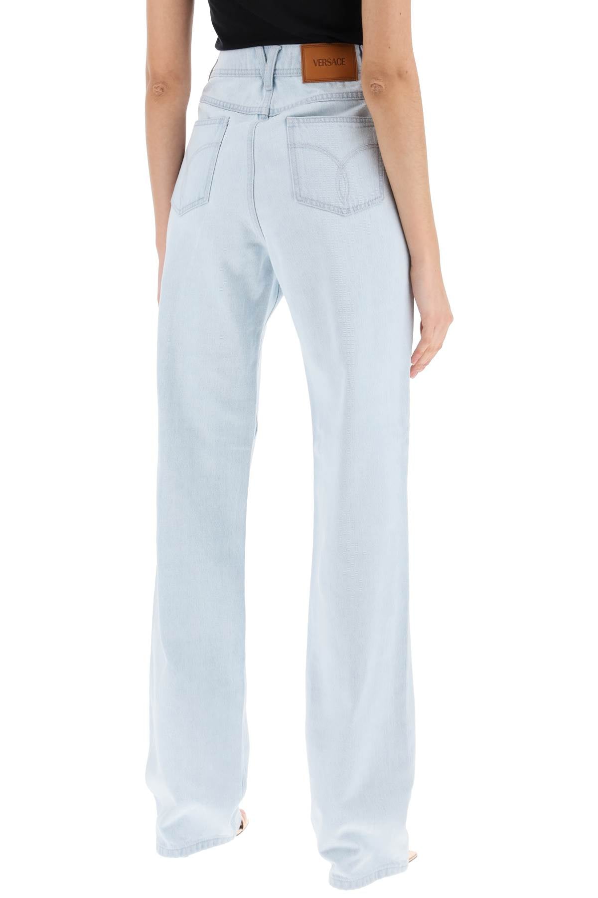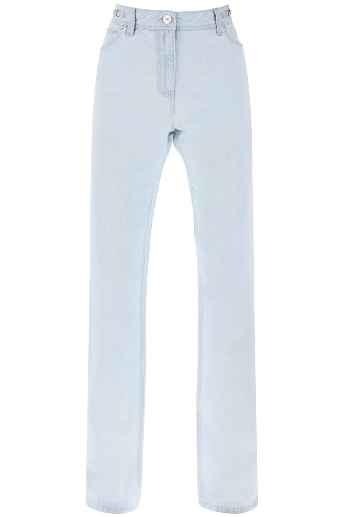 Versace jeans made of pure cotton denim, with a light vintage wash and five-pocket design enriched by silver Medusa '95 details on the waist. They feature a hidden zip closure and embossed button, belt loops, and a logo jacron on the back of the waist. Relaxed fit with a high-waisted straight cut enhanced by pressed creases. The model is 177 cm tall and wears a size 26.