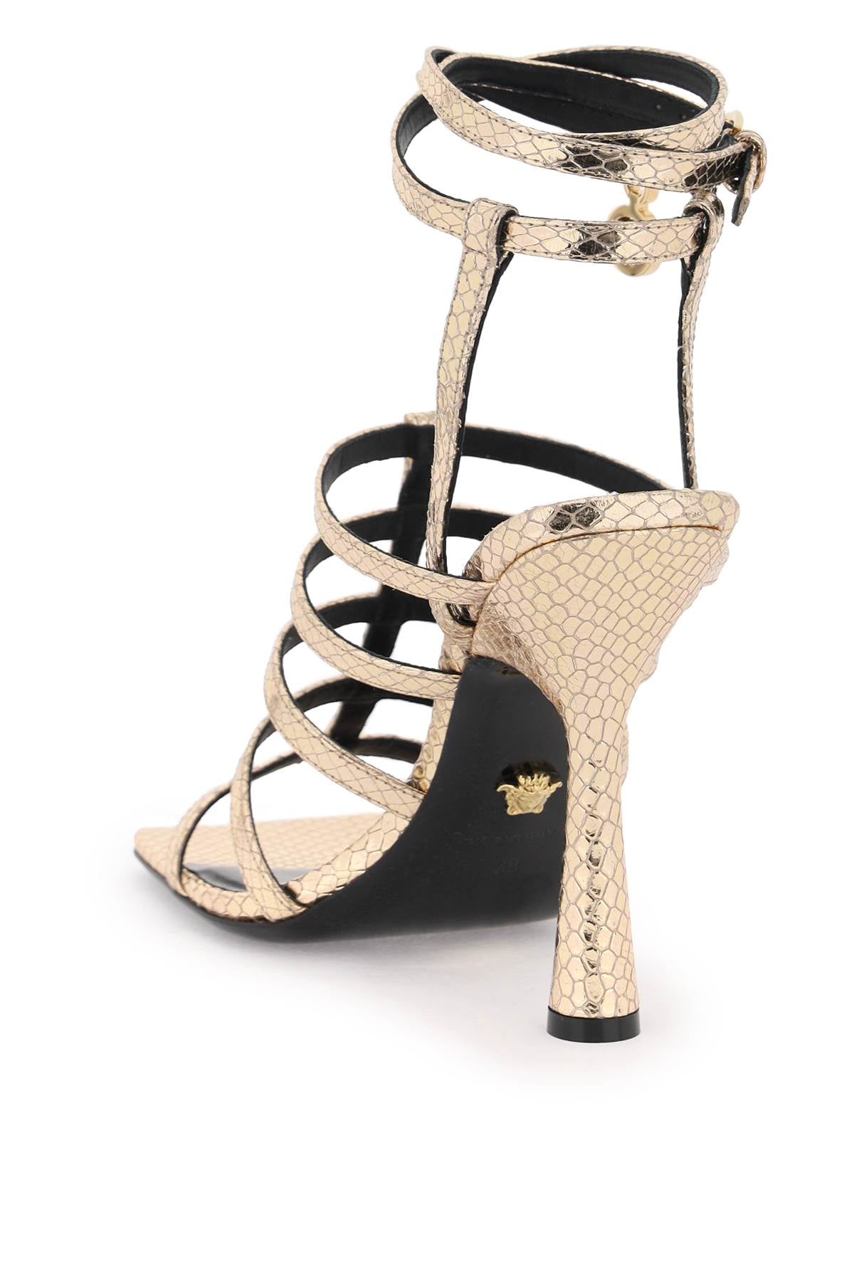 Versace sandals made of snake-effect laminated leather with adjustable ankle straps and Medusa charm on the right sandal. Cylindrical heel, leather footbed and leather sole. Size and Fit - Heel Height = 10 cm,