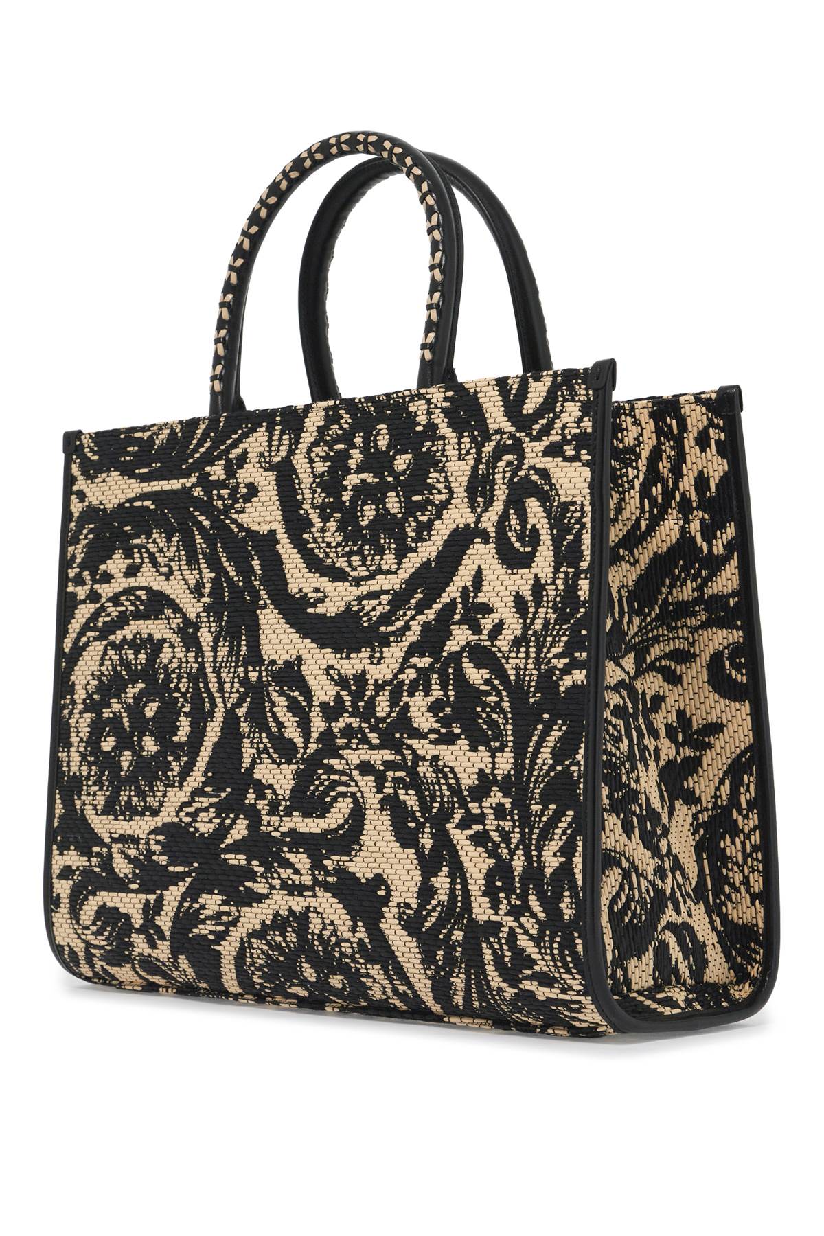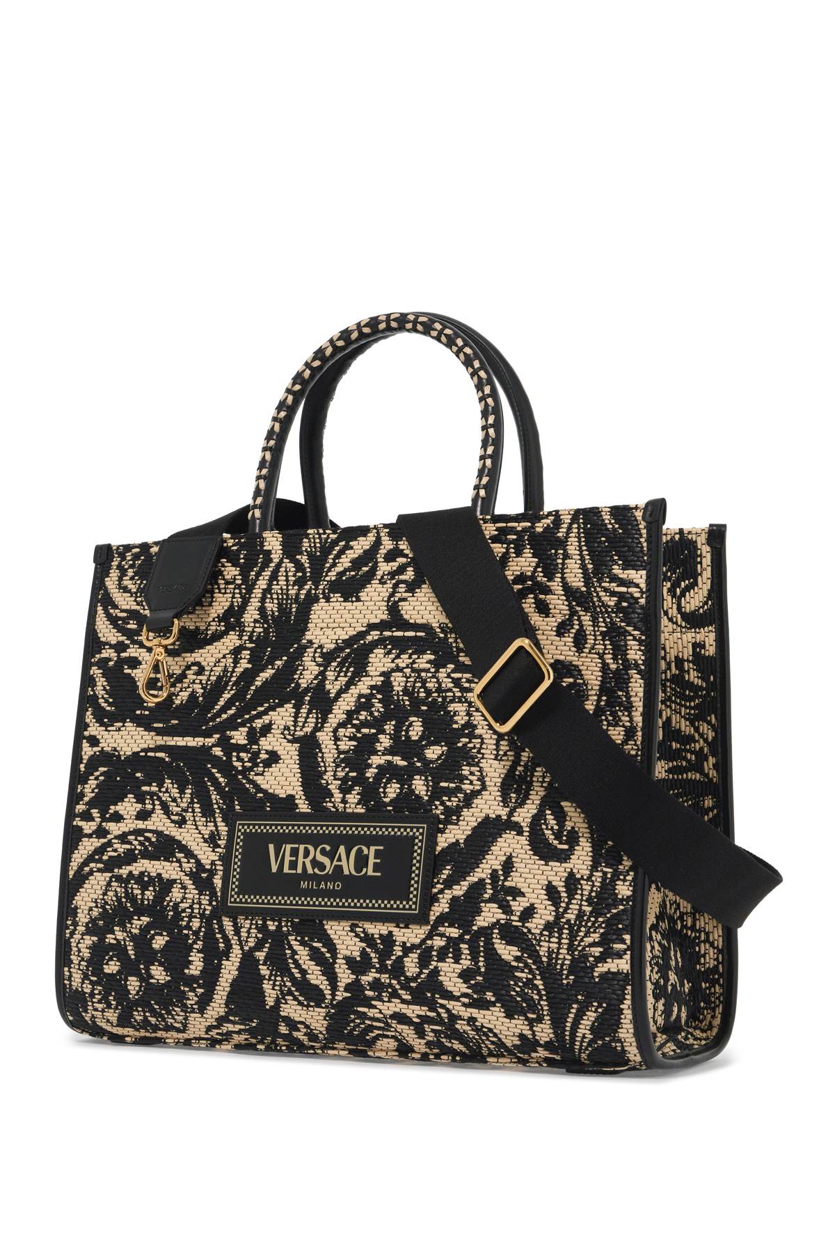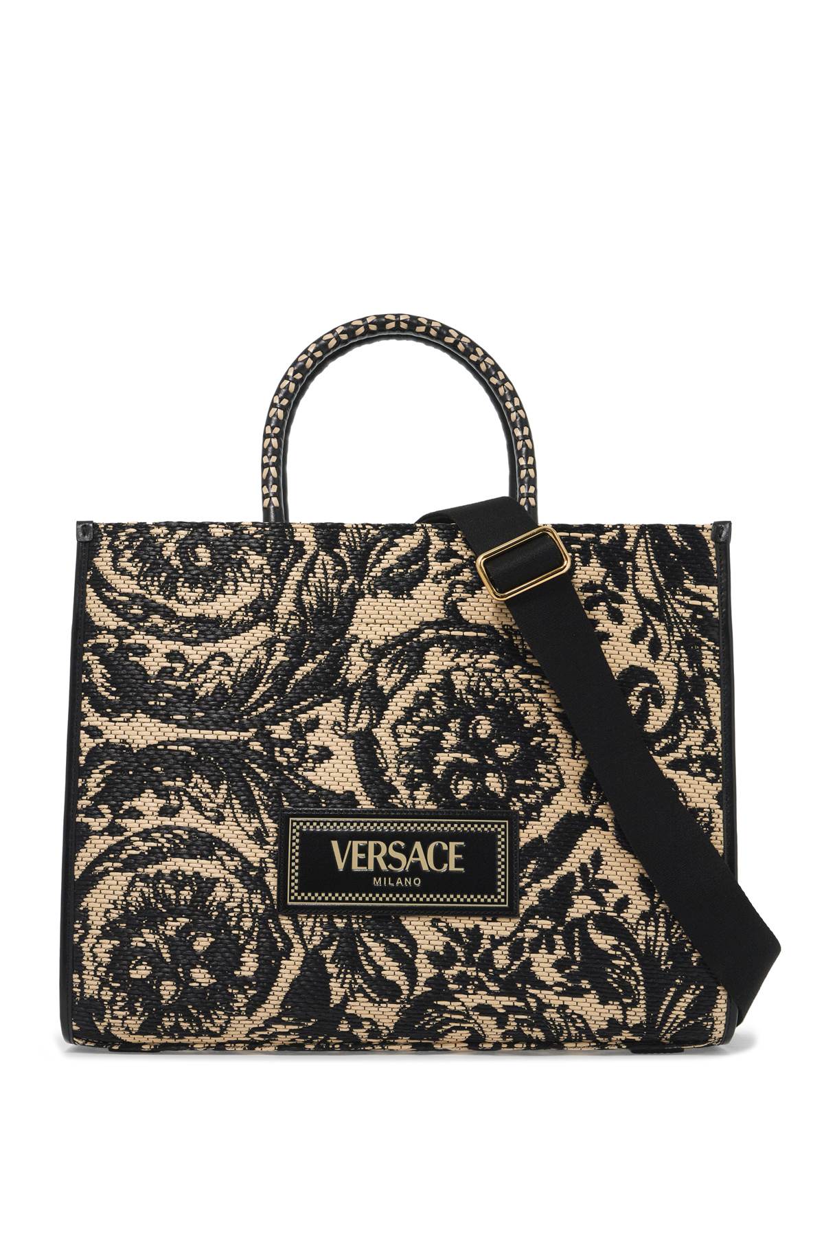 The medium tote bag by Versace is made of raffia with a Barocco pattern and features the iconic '90s Vintage Logo in embossed leather on the front. The double leather handles are hand-stitched, while the interior is lined with a zip pocket and an adjustable and removable ribbon shoulder strap. The metallic accessories have a gold finish for a luxurious touch. Size and Fit - Bag Length = 38,5 cm, Bag Height = 30 cm, Bag Weight = 13,5 cm, Handle Height = 13,5 cm,