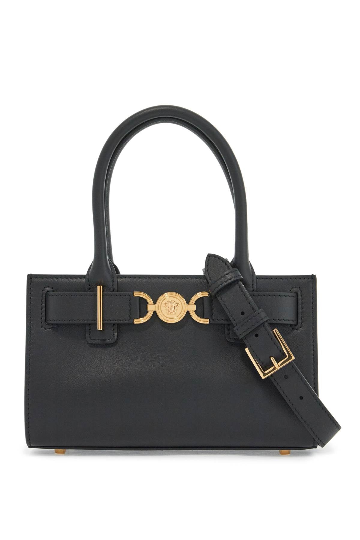 This small horizontal shopper bag from Versace is made of smooth leather and features a strap embellished with the iconic Medusa '95 customization. It has a double magnetic button closure, a lined interior in nappa leather with an open pocket, expandable sides with compression straps, and metal feet at the base. The design is versatile thanks to the double handle and additional adjustable shoulder strap. The metal accessories have a gold finish. Size and Fit - Bag Length = 23 cm, Bag Height = 14 cm, Bag Weight = 8 cm, Handle Height = 12 cm,